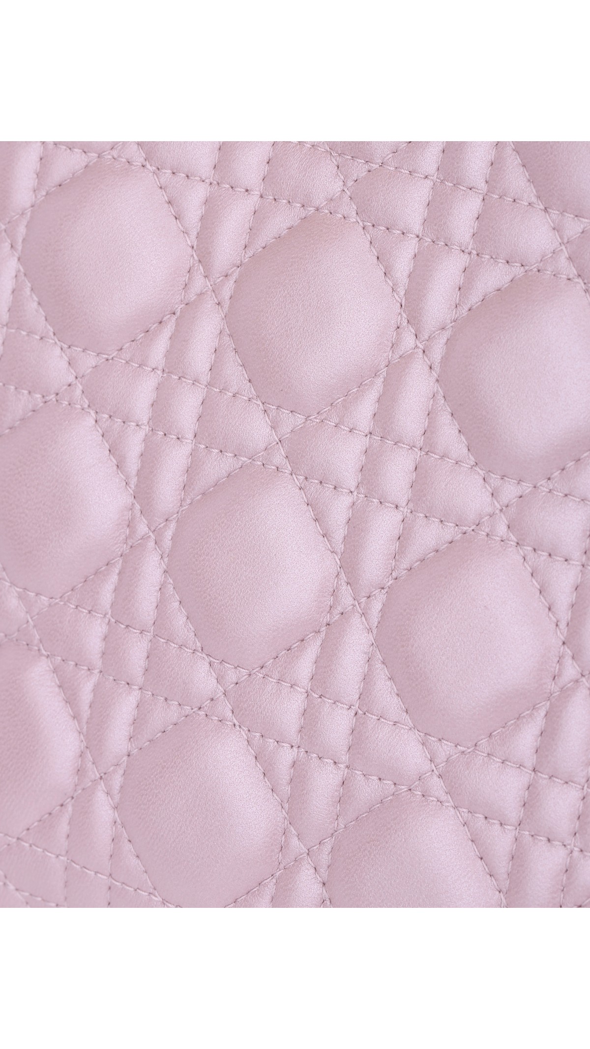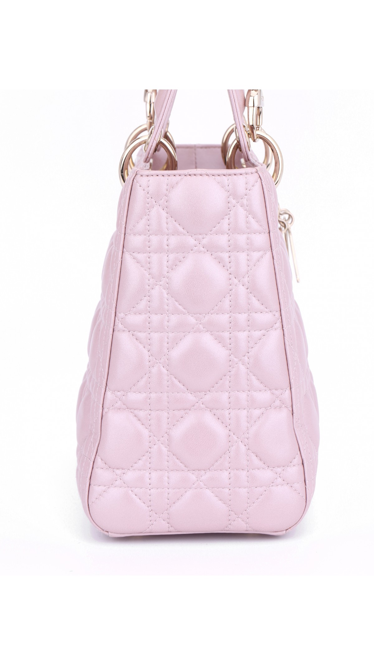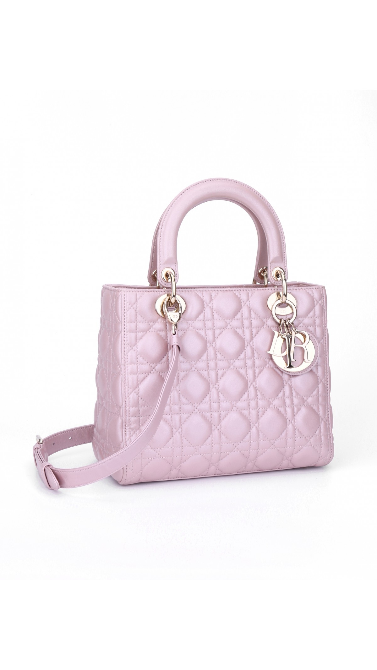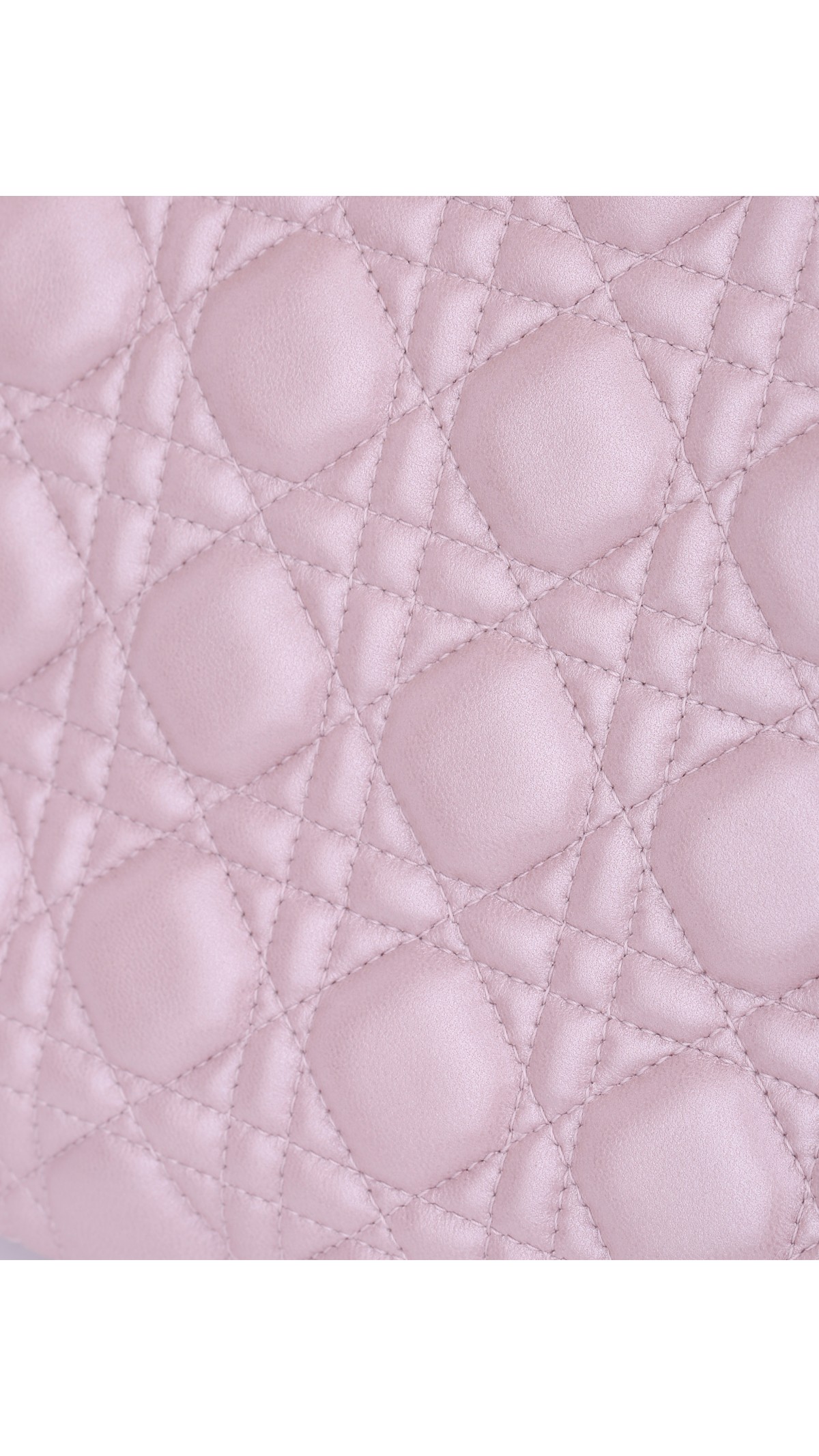 En tidløs status og flott design markerer Lady Dior-vesken. Det er en ikonisk veske som folk fortsetter å investere i den dag i dag. En klassisk veske som passer til hverdag og til fint. Denne gangen i en nydelig perle-rosa pastell farge med metallic stil. Pastell farger Kommer inn trend i vår 2024 sier Elle Norge. Nypris for vesken ligger rundt 71000,-