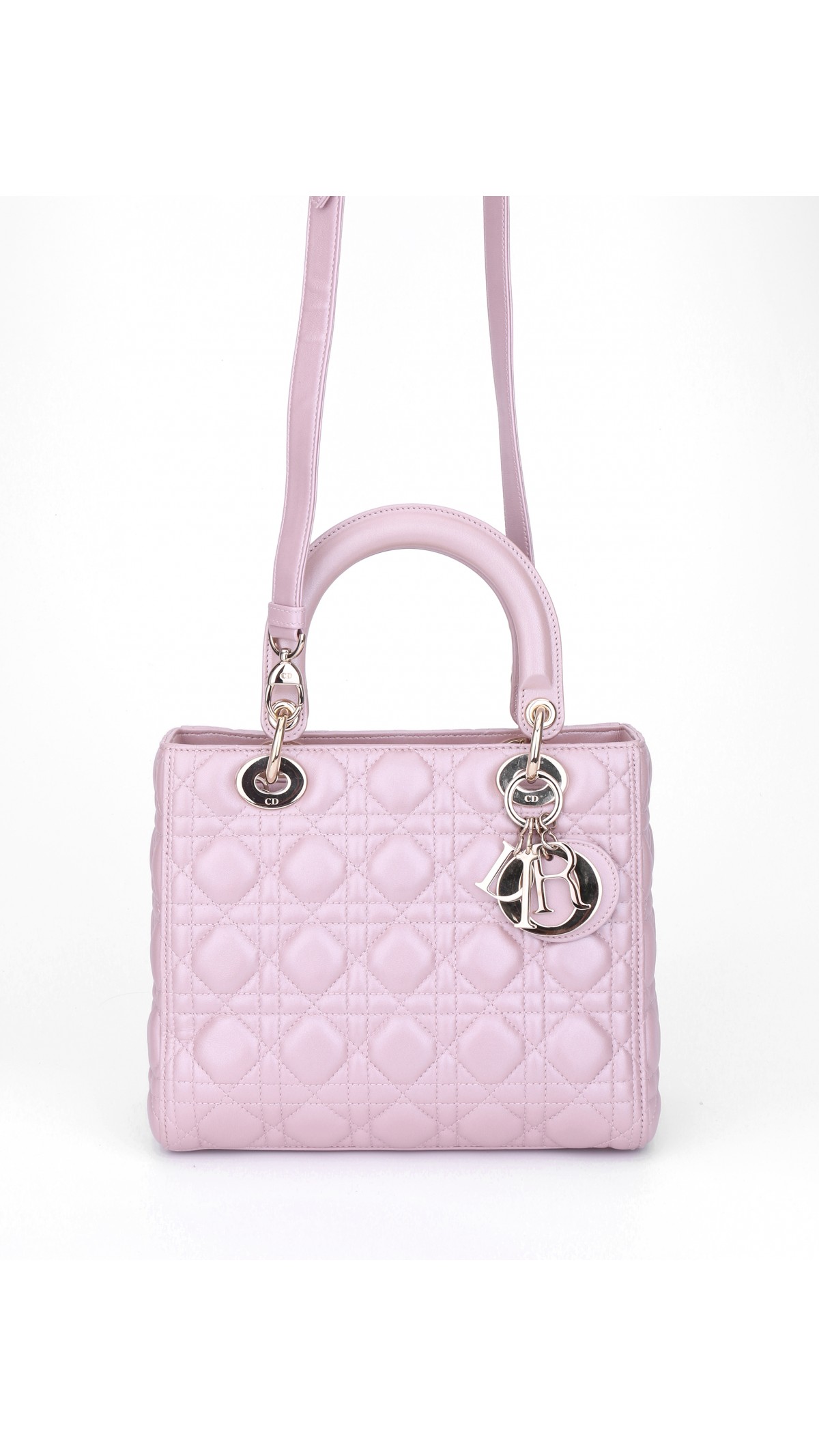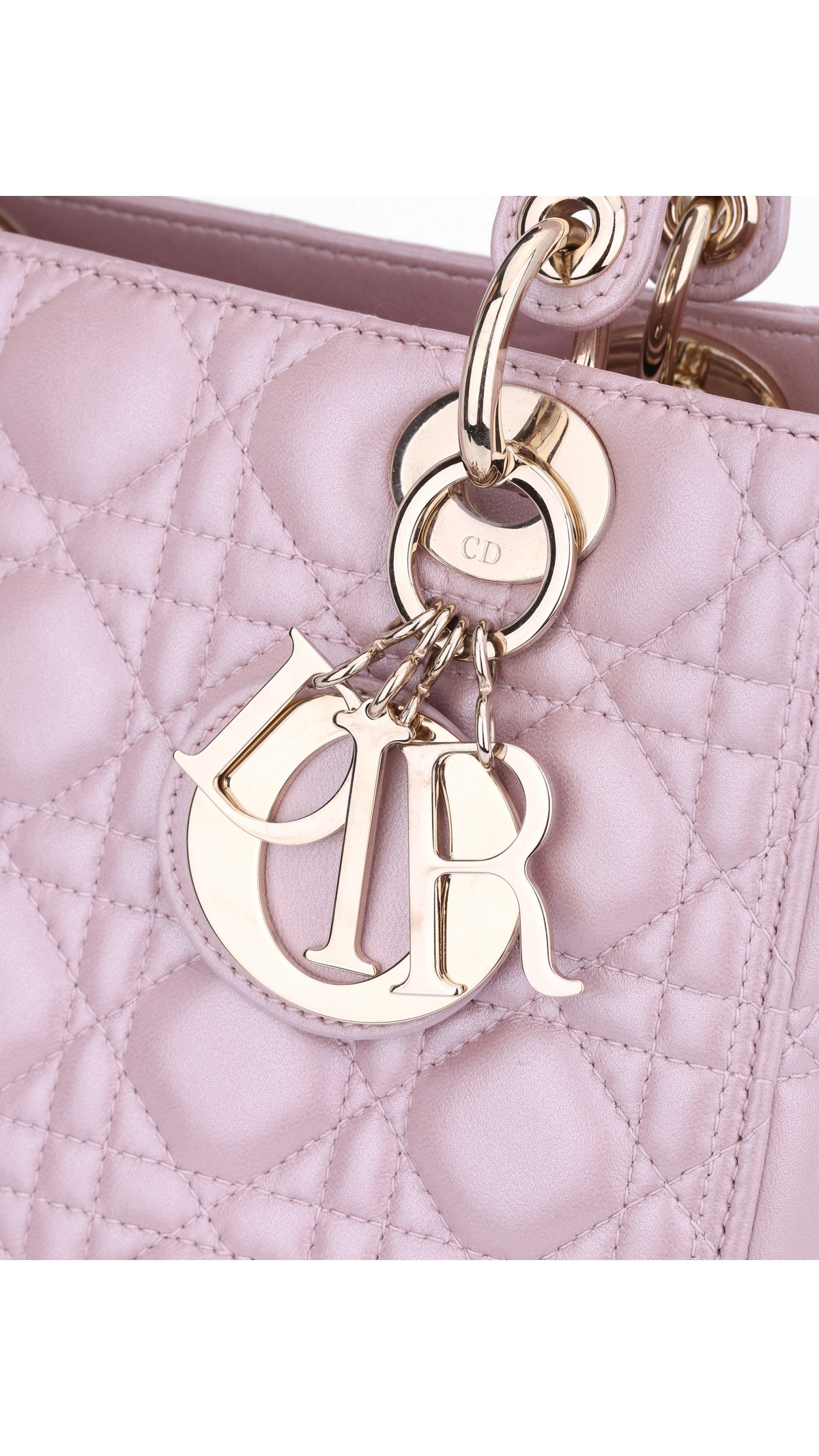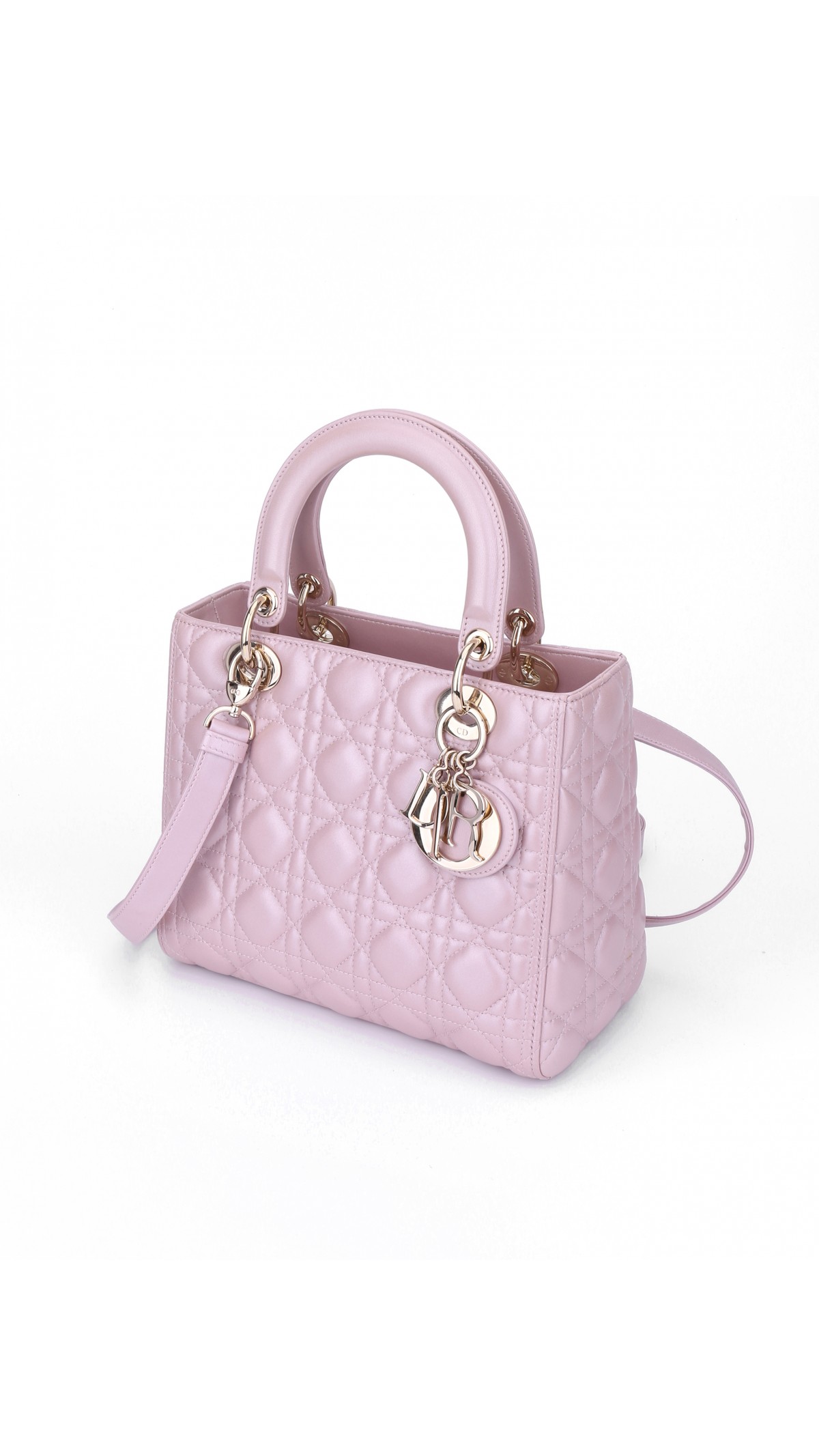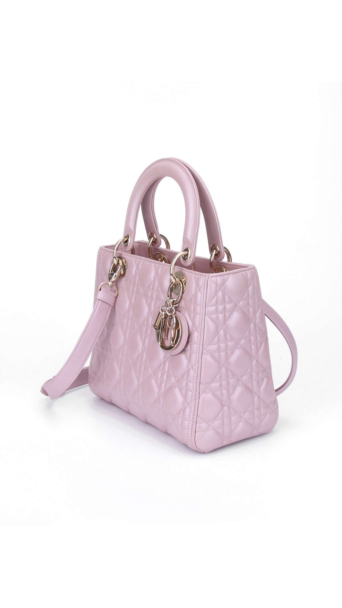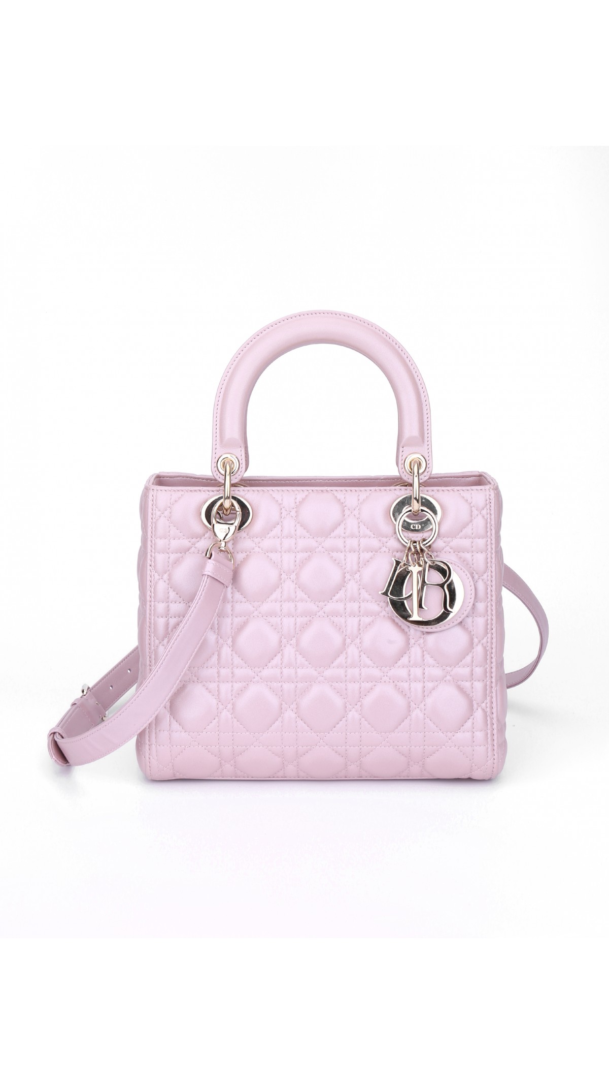 En tidløs status og flott design markerer Lady Dior-vesken. Det er en ikonisk veske som folk fortsetter å investere i den dag i dag. En klassisk veske som passer til hverdag og til fint. Denne gangen i en nydelig perle-rosa pastell farge med metallic stil. Pastell farger Kommer inn trend i vår 2024 sier Elle Norge. Nypris for vesken ligger rundt 71000,-