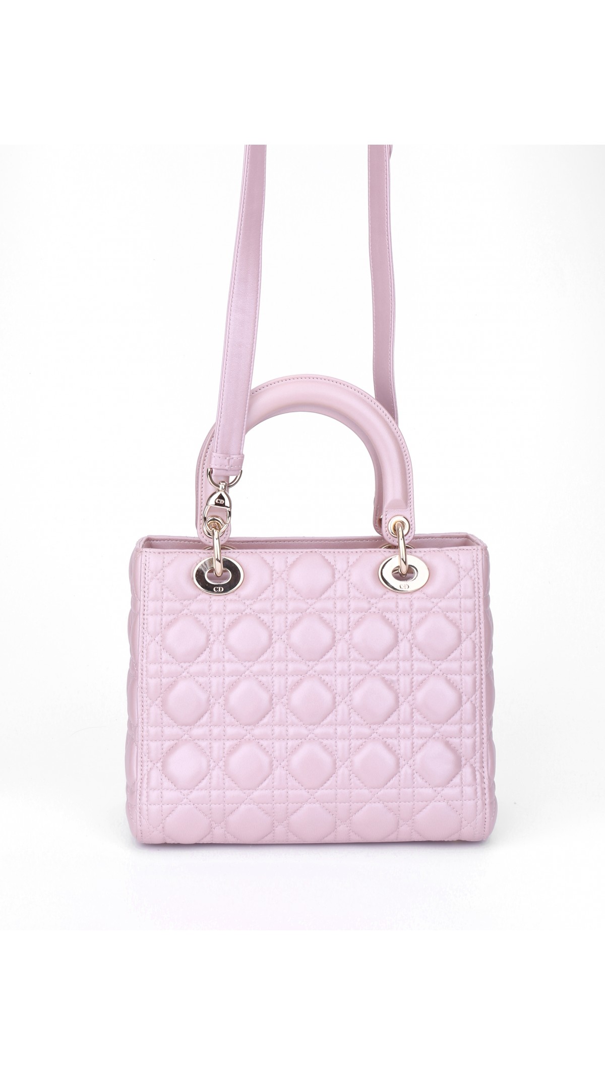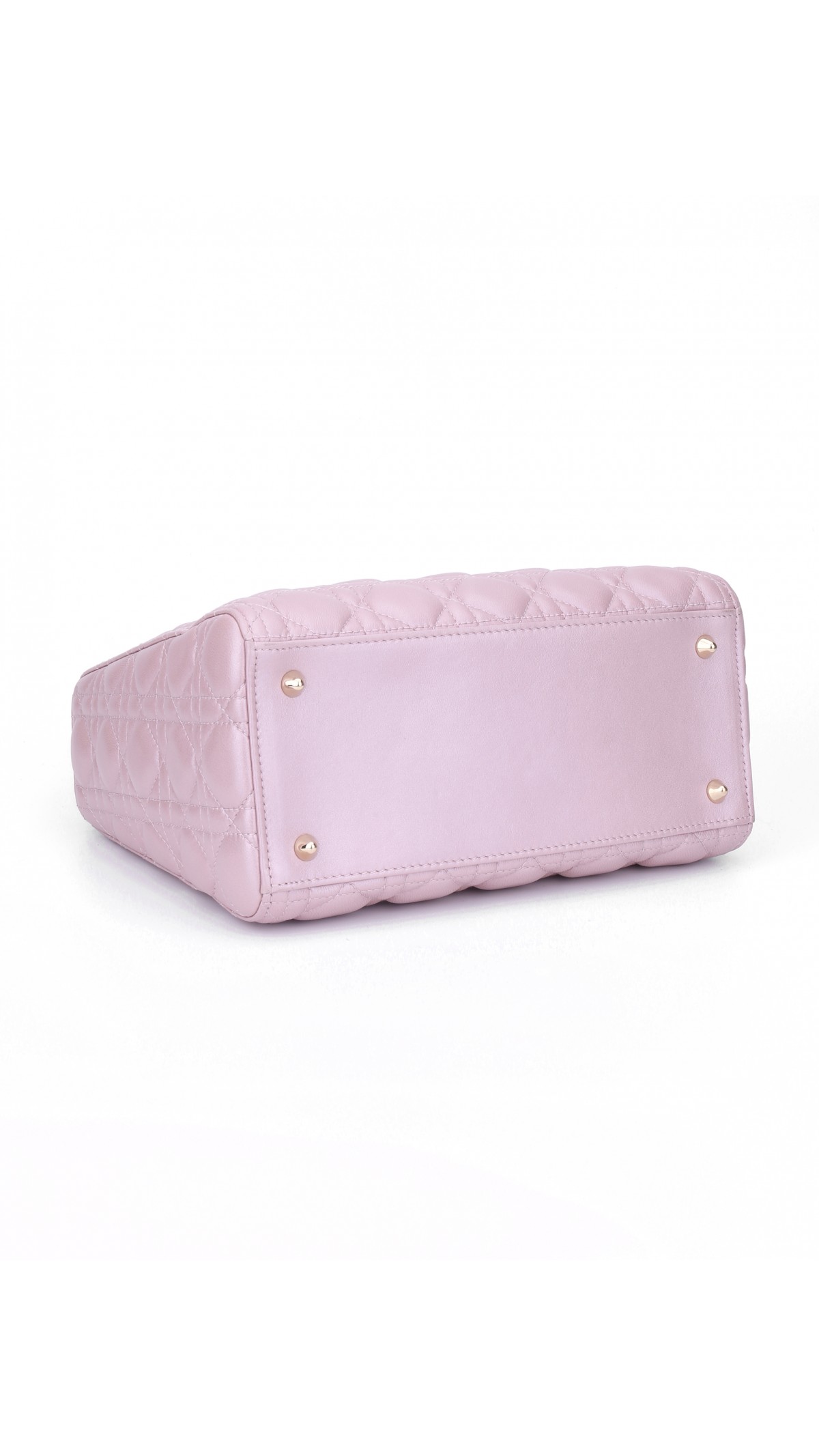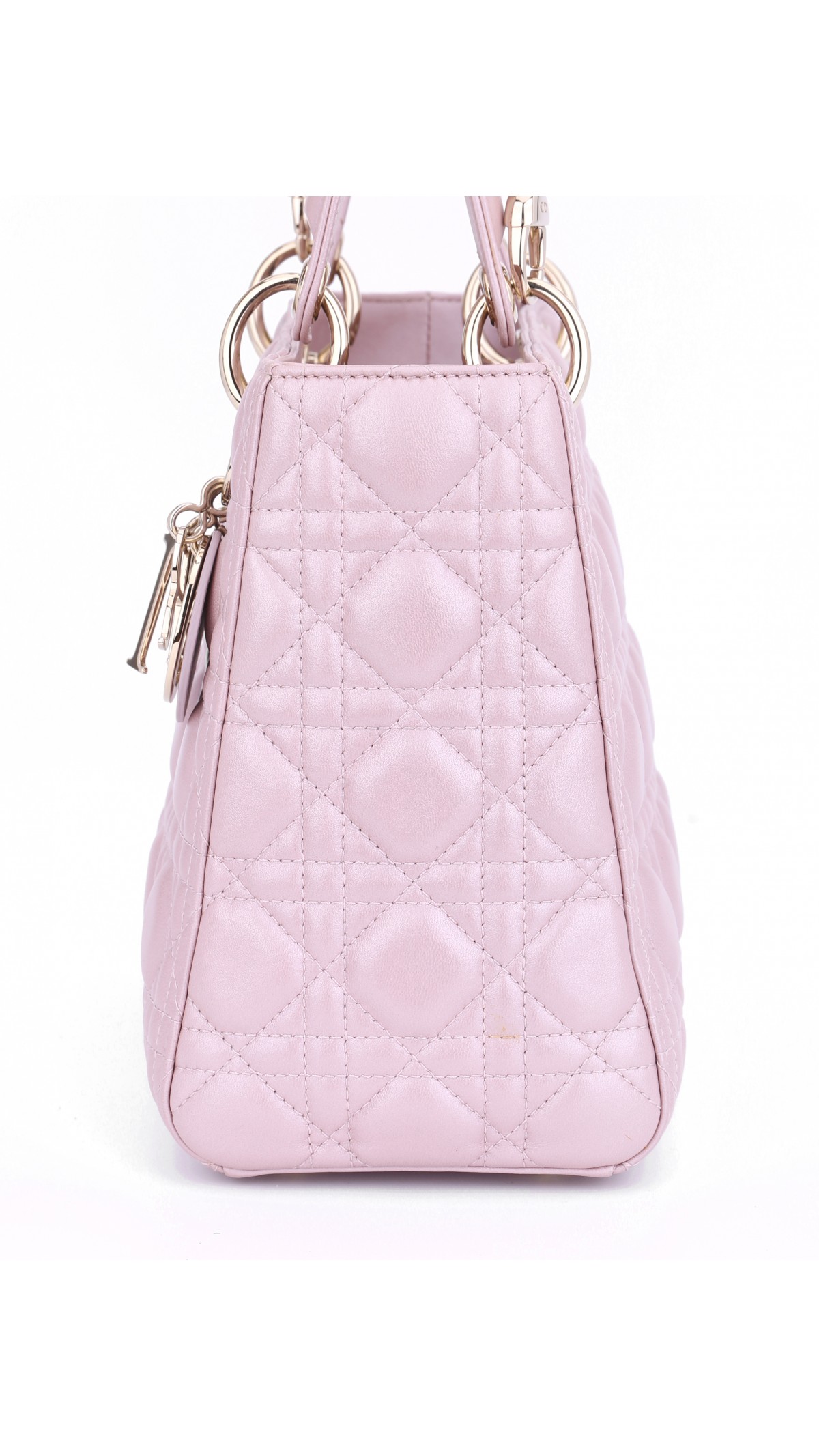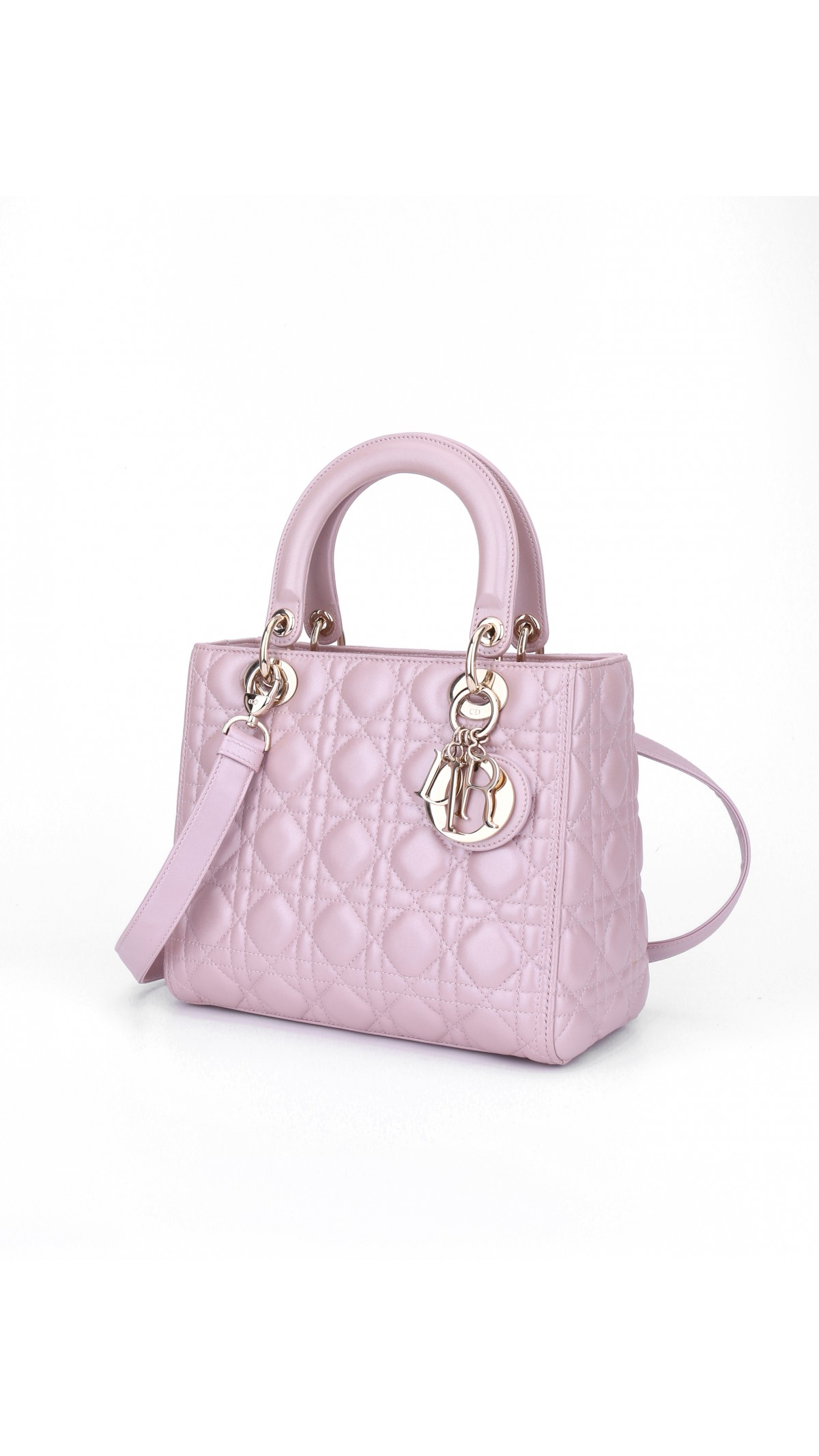 En tidløs status og flott design markerer Lady Dior-vesken. Det er en ikonisk veske som folk fortsetter å investere i den dag i dag. En klassisk veske som passer til hverdag og til fint. Denne gangen i en nydelig perle-rosa pastell farge med metallic stil. Pastell farger Kommer inn trend i vår 2024 sier Elle Norge. Nypris for vesken ligger rundt 71000,-