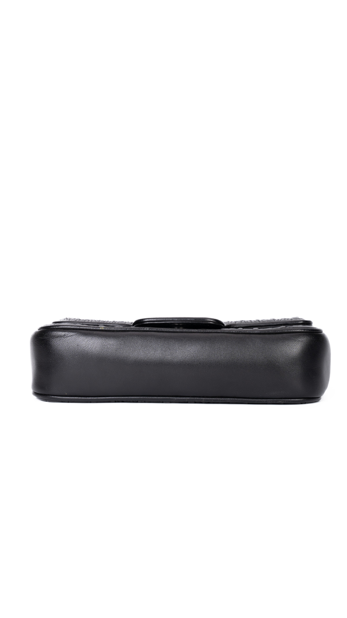 Vesken åpnes med en klaff med trykklås, og innvendig finner du et praktisk hovedrom med glidelåslomme for trygg oppbevaring av småting. Denne modellen kombinerer luksuriøs estetikk med funksjonalitet, perfekt til både hverdag og fest.