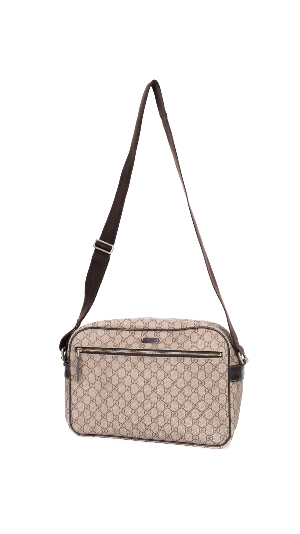 Gucci GG Supreme Messenger Bag i beige canvas med det ikoniske GG-mønsteret. Vesken har justerbar skulderrem i brun tekstil, noe som gjør den praktisk og komfortabel til daglig bruk.