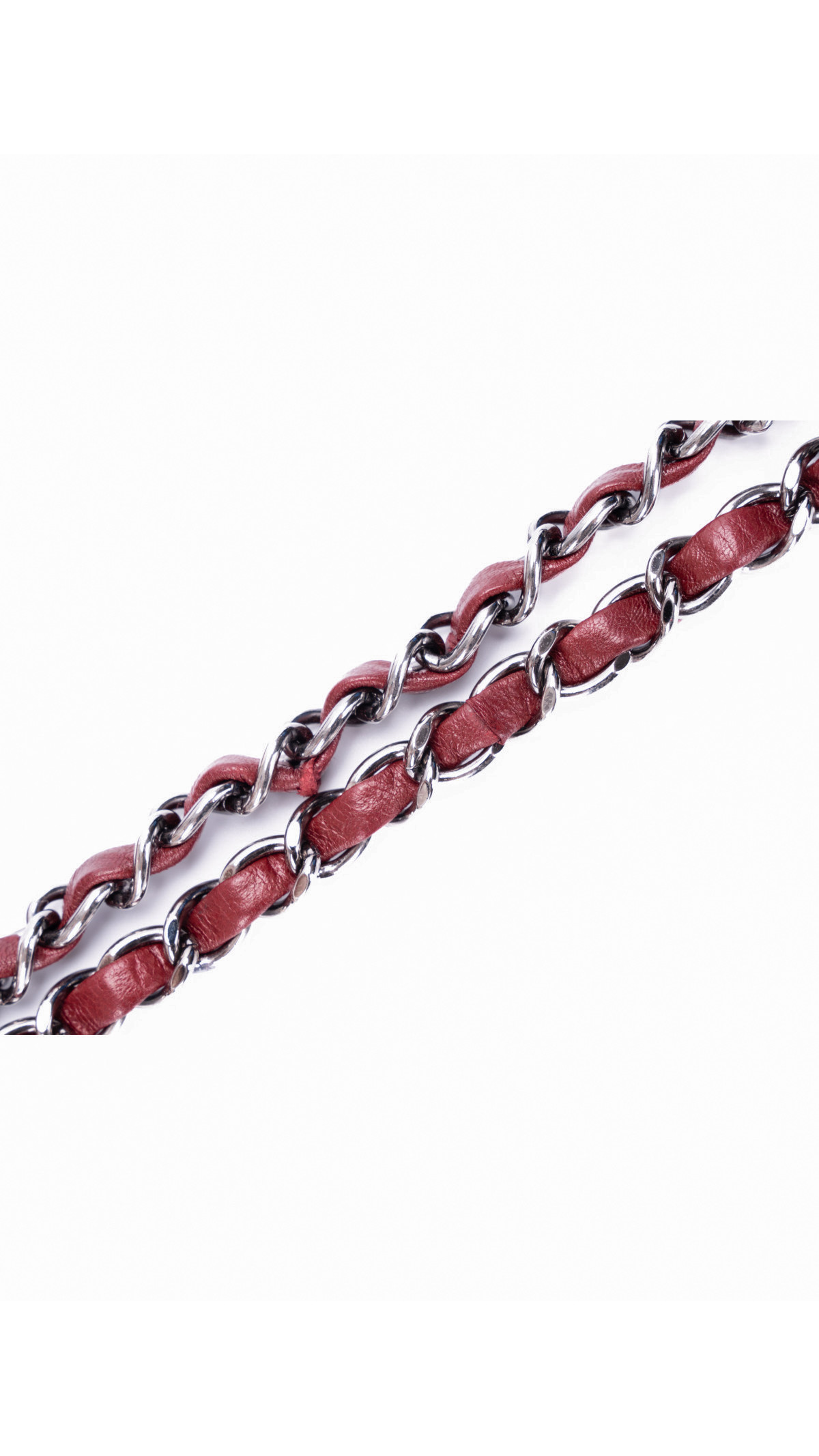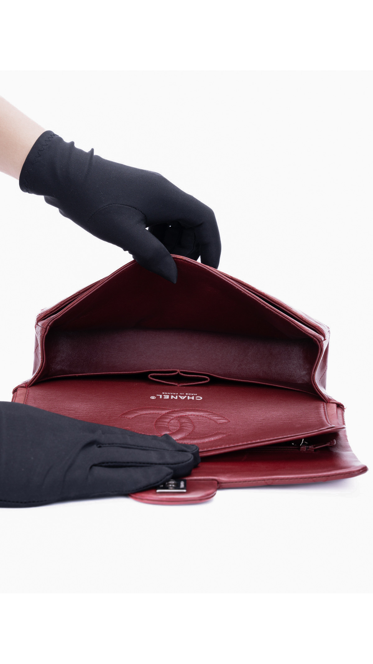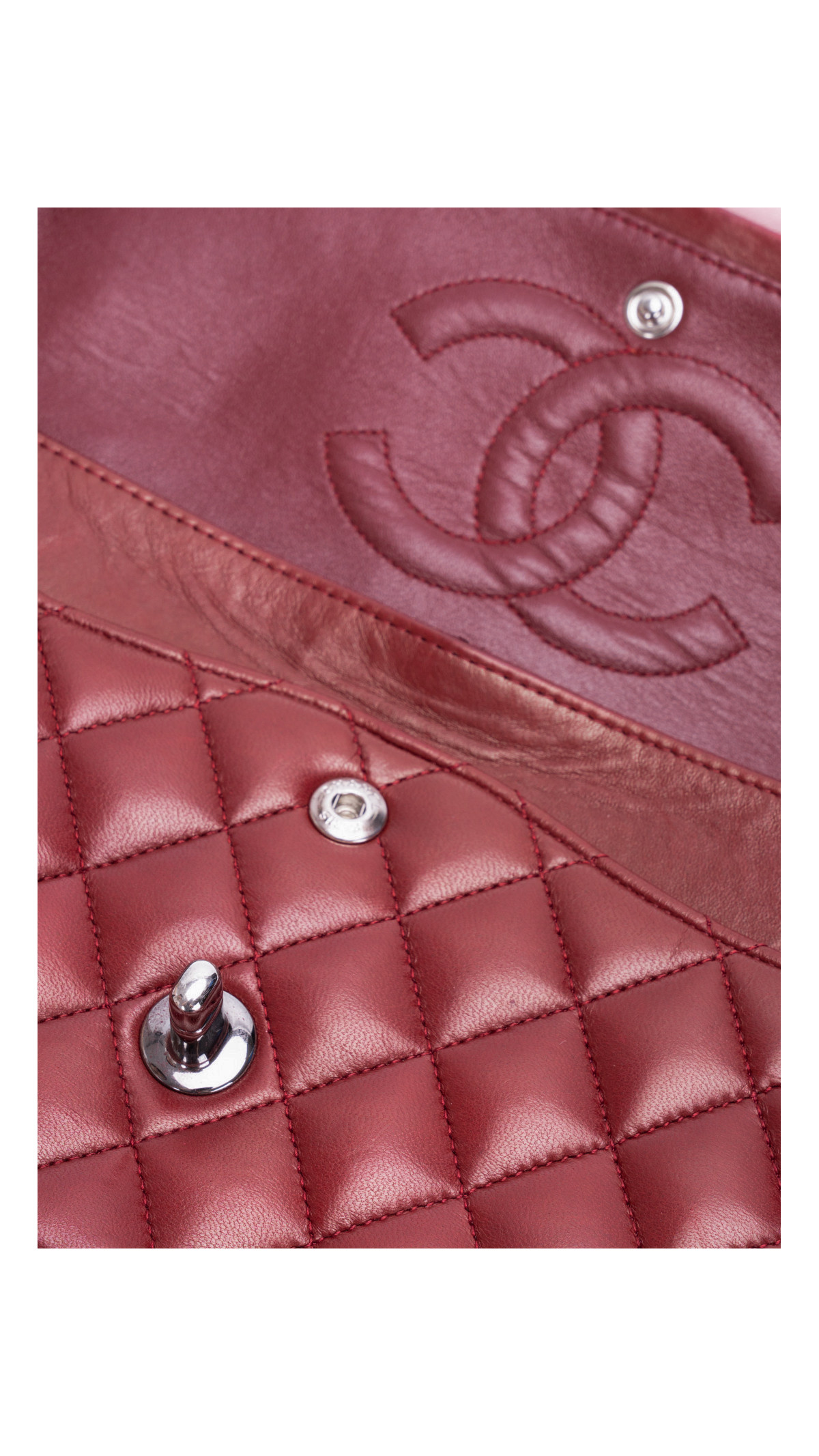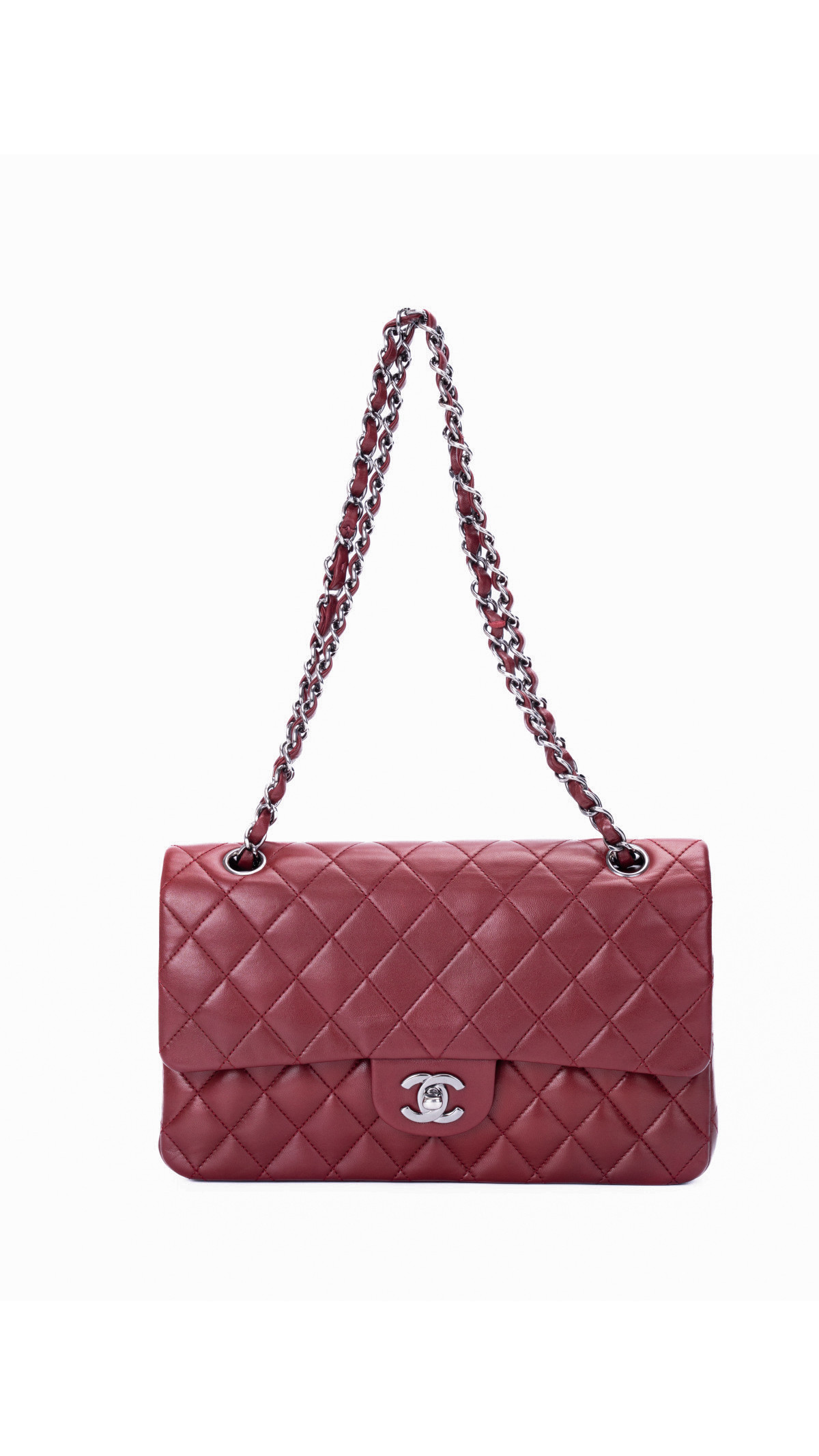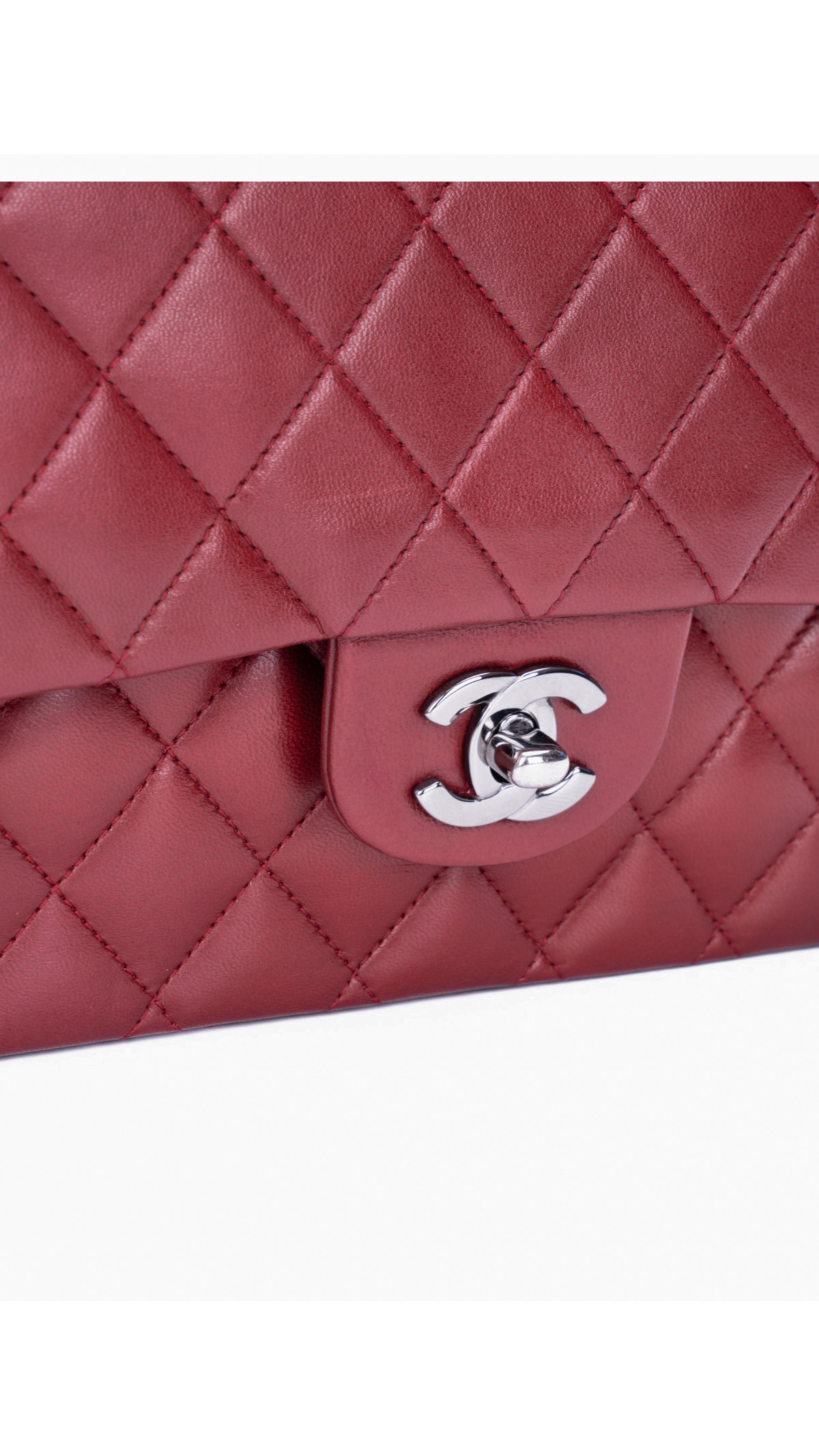 Denne vakre Chanel Classic Flap Bag er laget i mykt og luksuriøst burgunder lammeskinn med det ikoniske quiltede mønsteret. Vesken har sølvfarget hardware, klassisk CC-turnlock-lås og den doble kjede- og skinnstroppen som gjør at den kan bæres både som *under shoulder bag* og skulderveske.