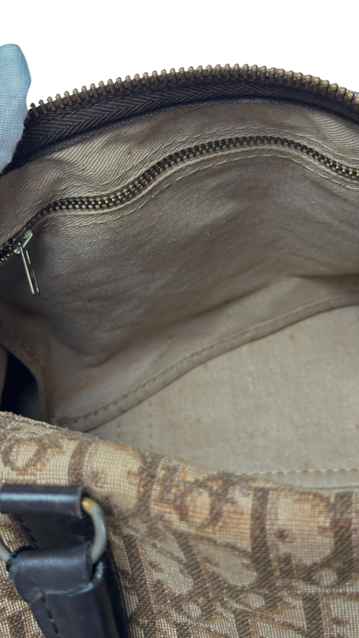 Christian Dior Monogram Boston Bag. I fargen lysebrun med et skinn håndtak i mørkebrunt. Gull hardware. Størrelse på vesken tilsvarer en LV speedy 30