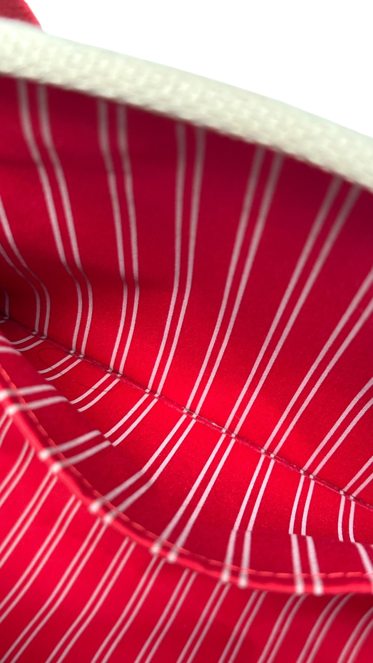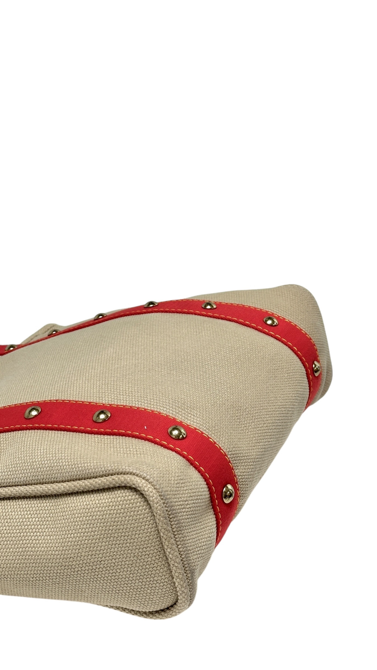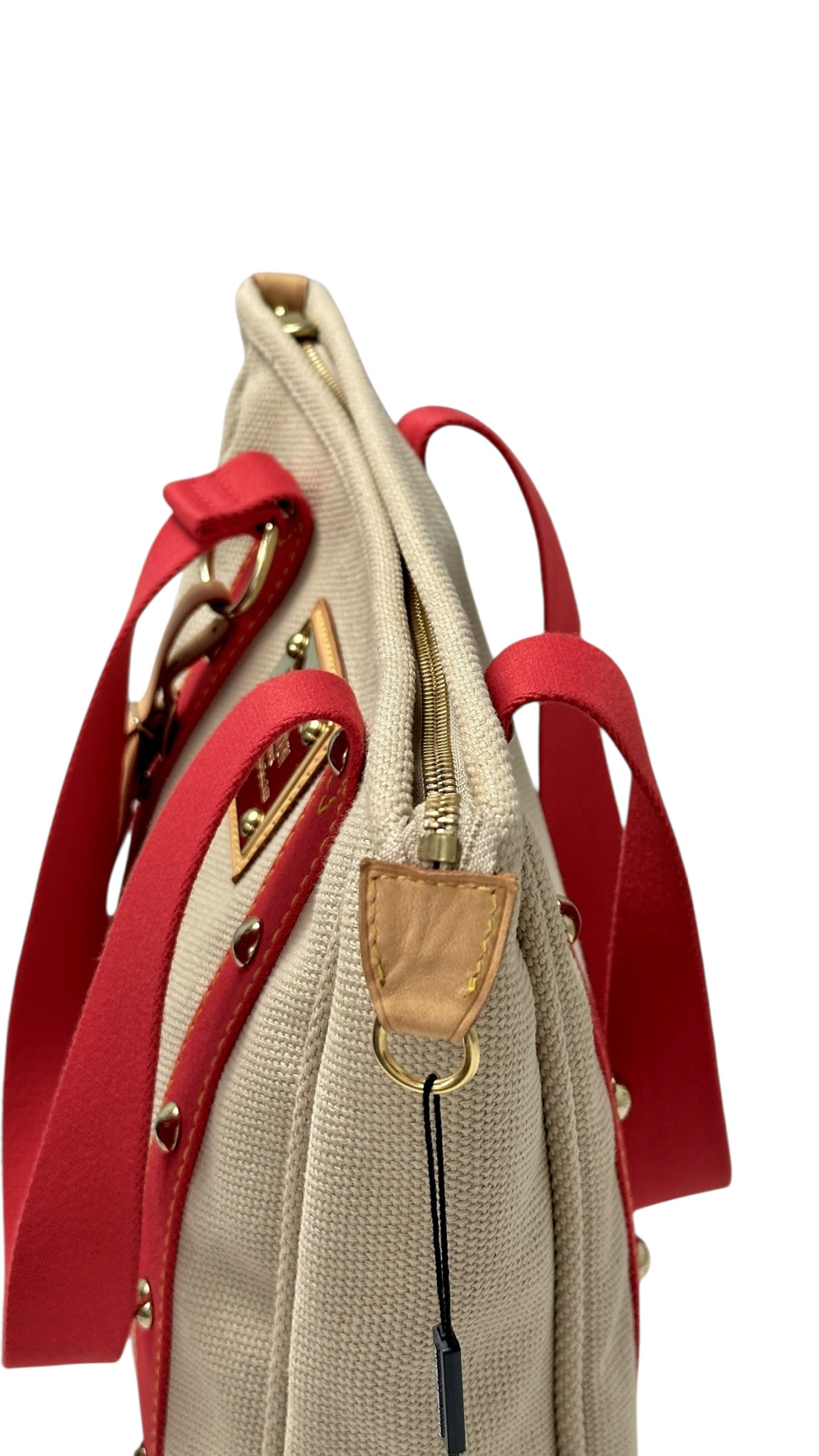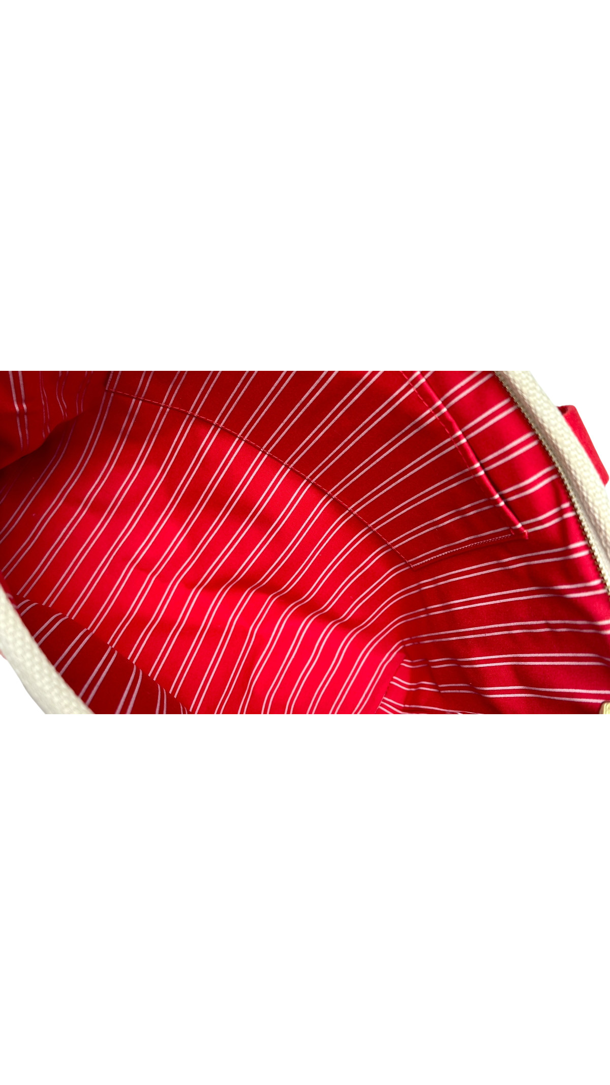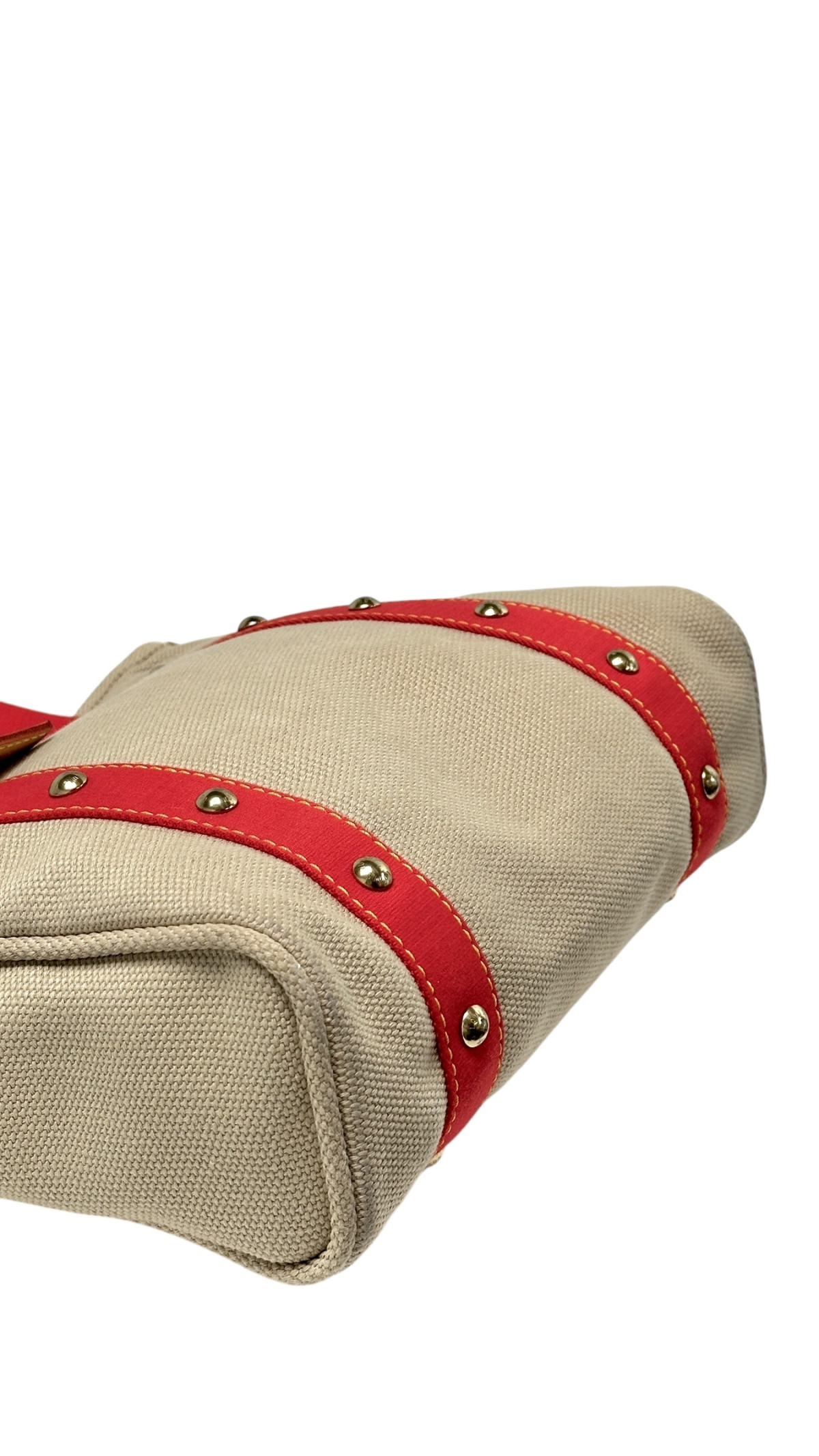 En tote bag fra Louis Vuitton i fargen beige med en skulderreim i rød. Vesken er laget i stoff. Vesken i nydelig stand med lite bruksmerker. Den har plass til en Macbook stående
