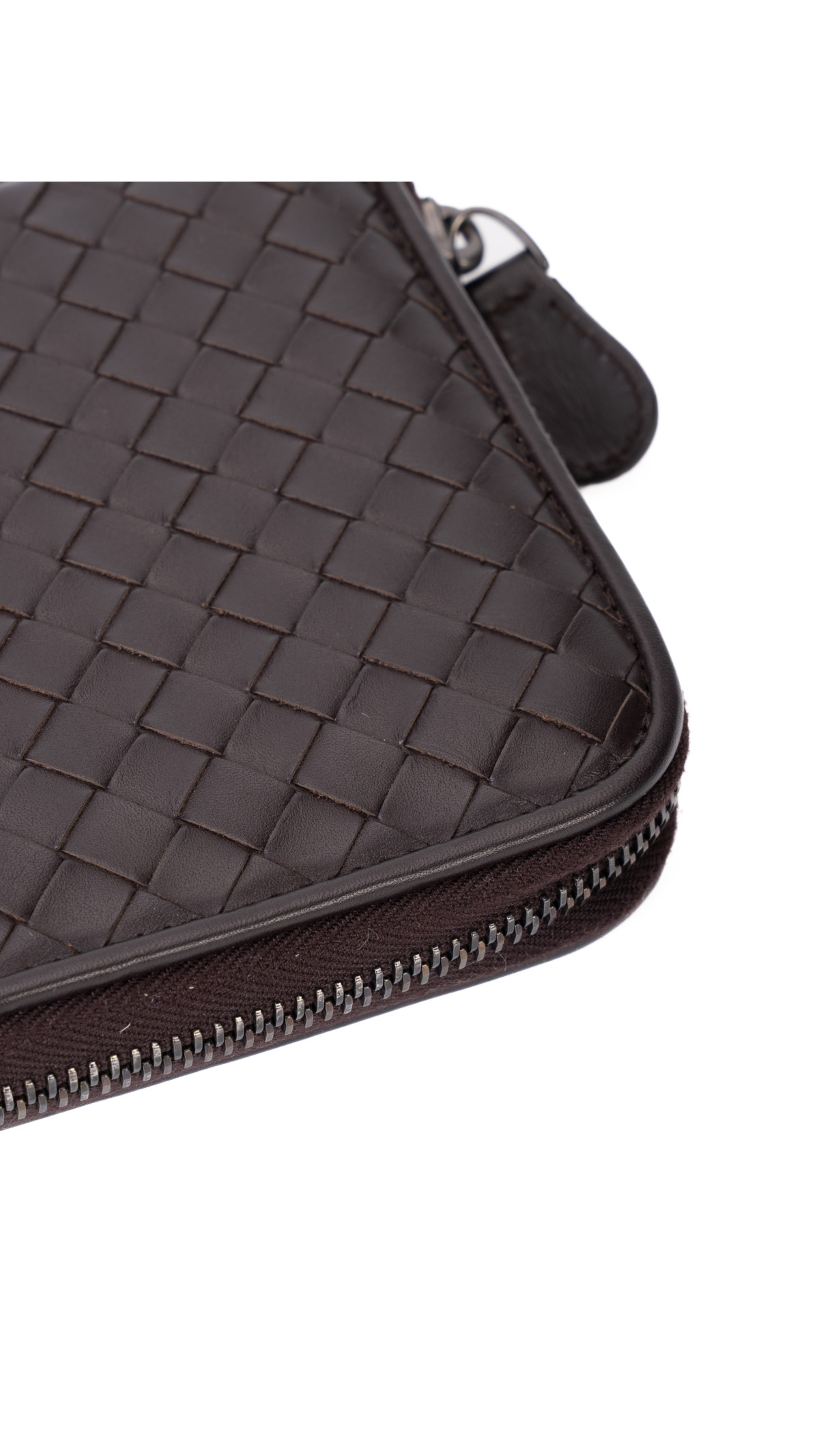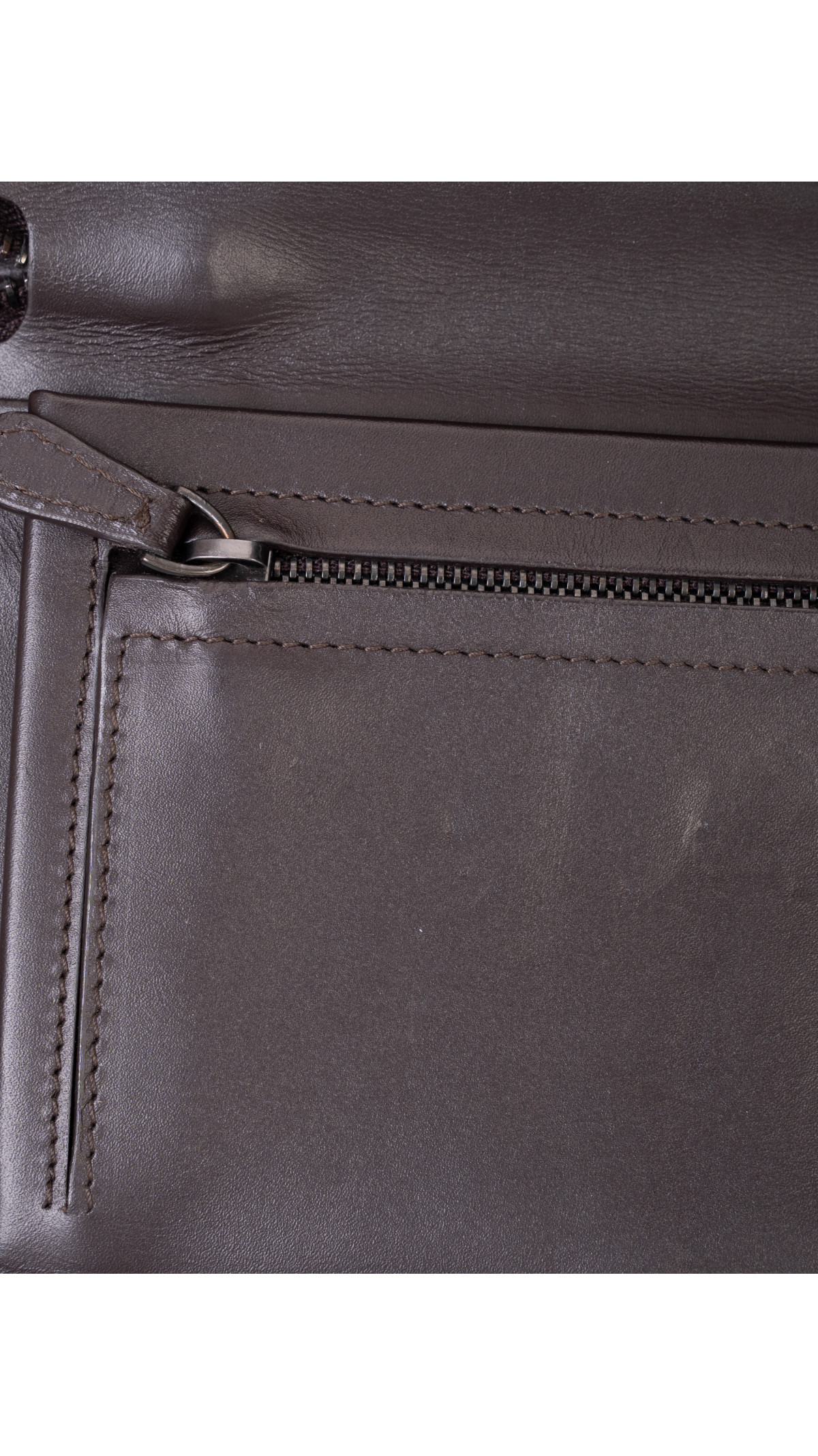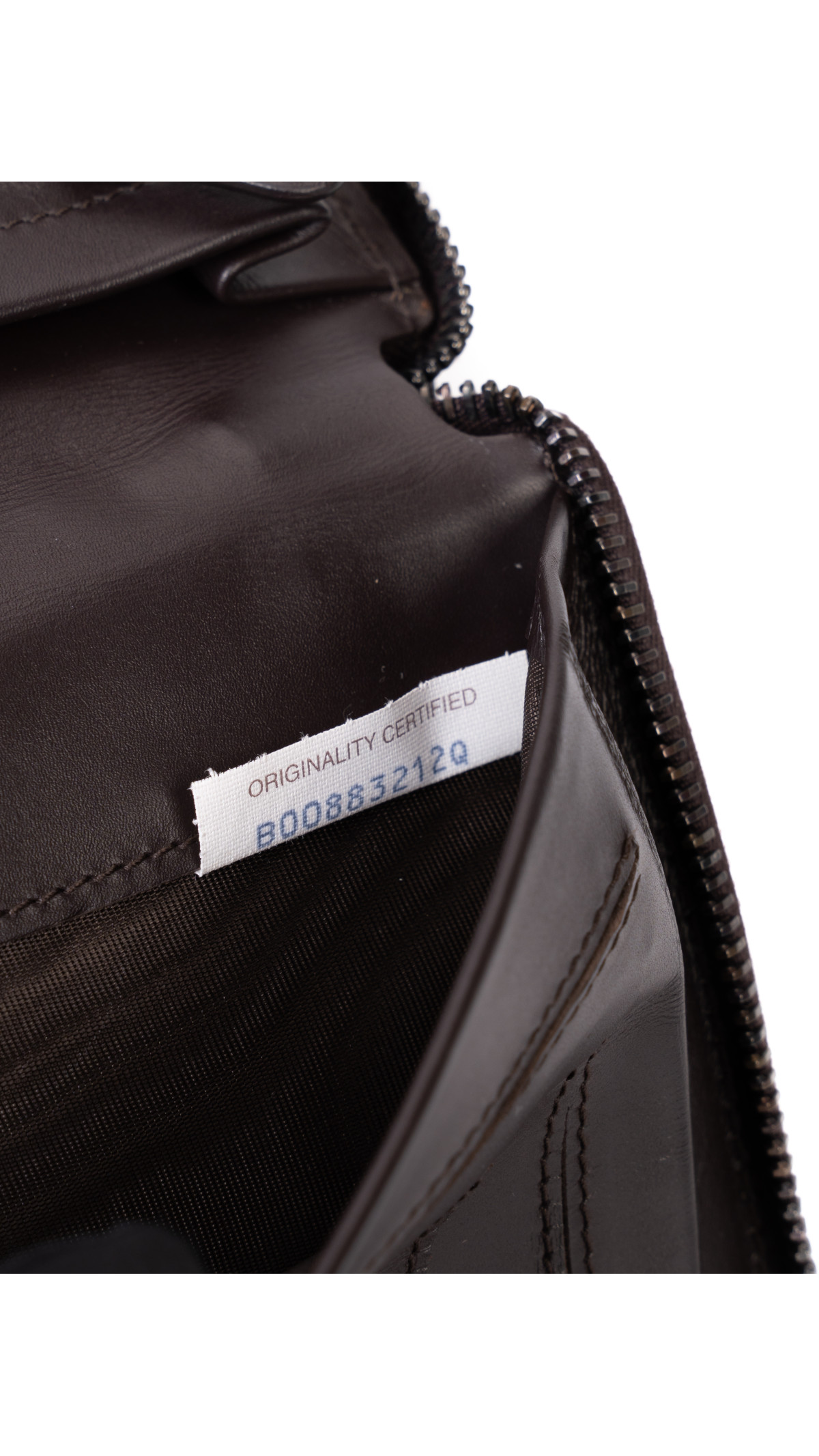 Bottega Veneta er kjent for sitt ikoniske Intrecciato-flettede skinn, og denne clutchen/toalettvesken er intet unntak. Laget i mørkebrunt mykt skinn, kombinerer den et tidløst design med funksjonalitet. Vesken har en praktisk toppglidelås, håndtak på toppen, samt romslig innside med plass til det mest nødvendige – enten du bruker den som clutch, reiseveske eller en stilfull organizer.