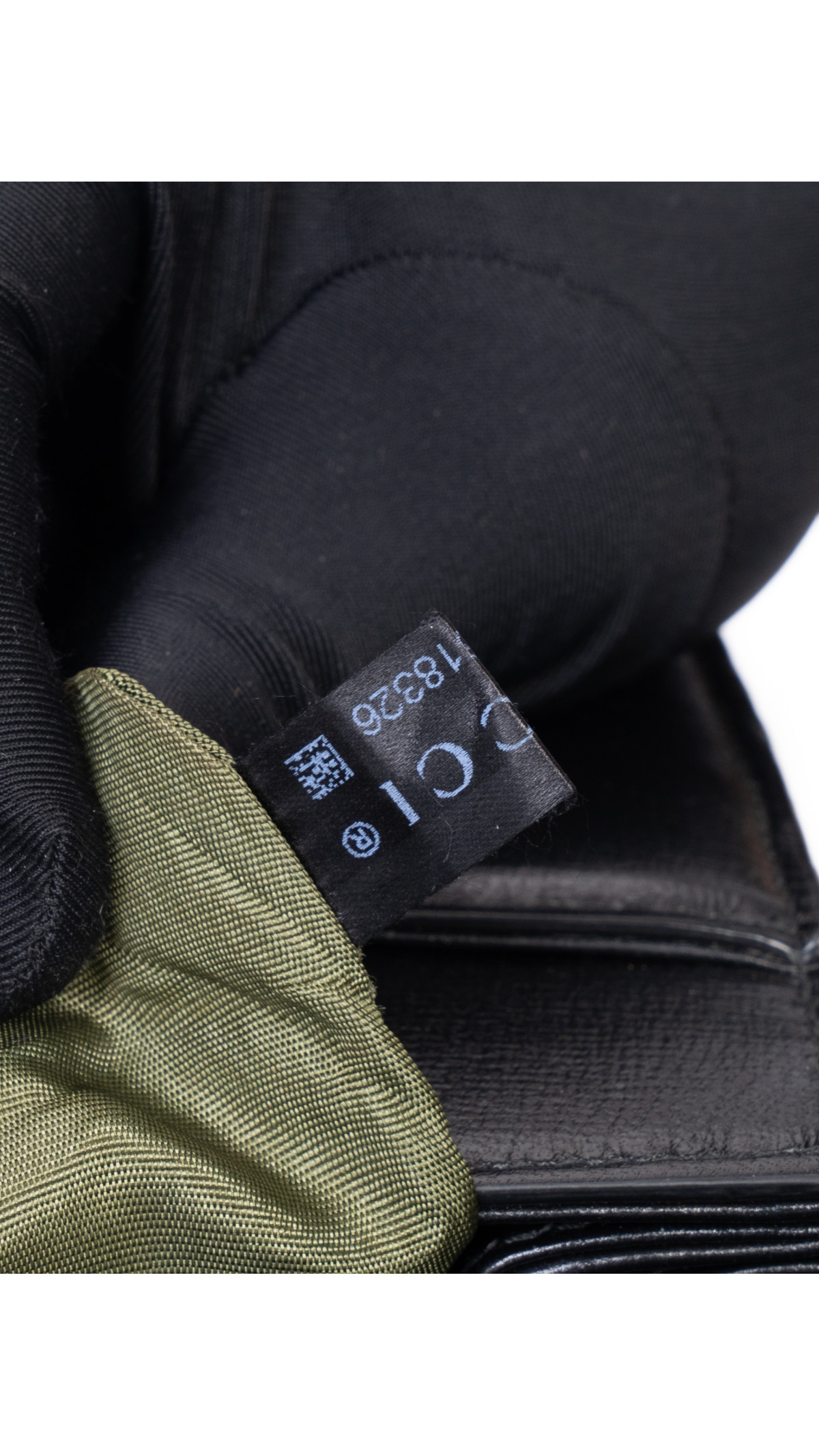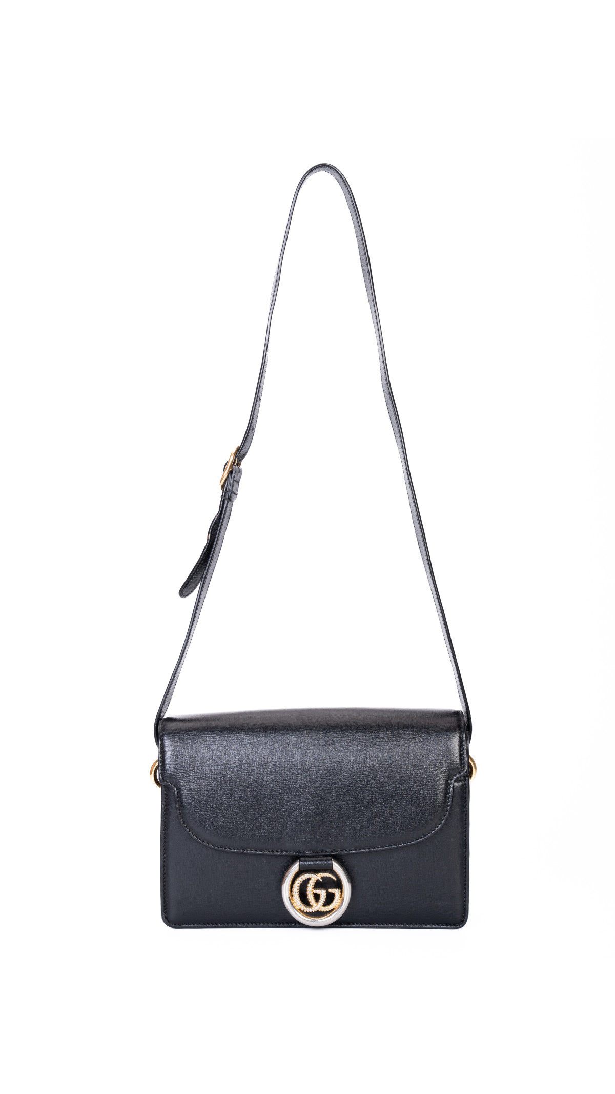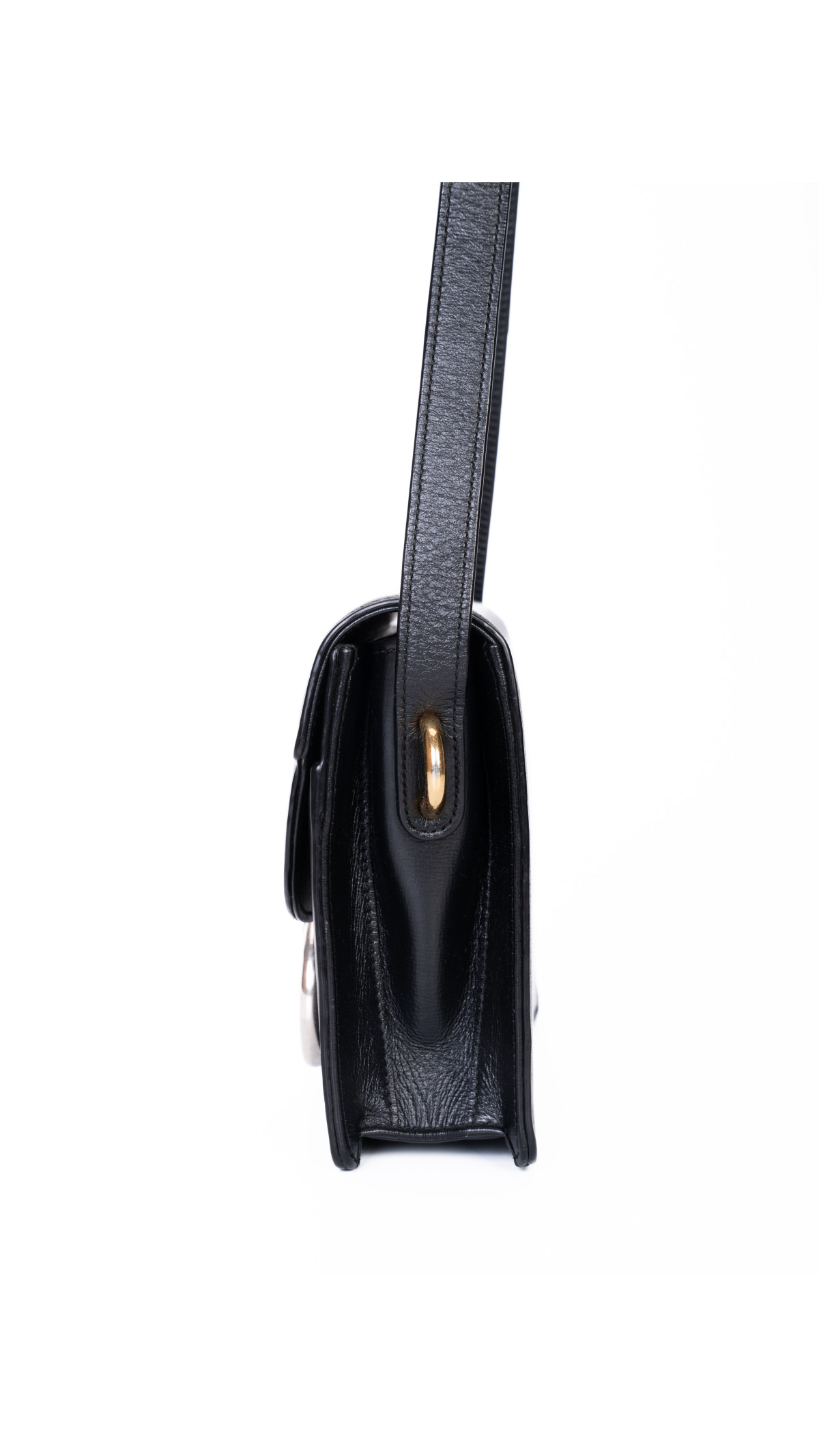 Gucci Logo Plaque Shoulder Bag er en tidløs og sofistikert veske, kjennetegnet av sitt elegante uttrykk og den ikoniske GG-logoen i gullfarget metall på fronten. Vesken er laget i sort skinn av høy kvalitet og kombinerer både stil og funksjonalitet.