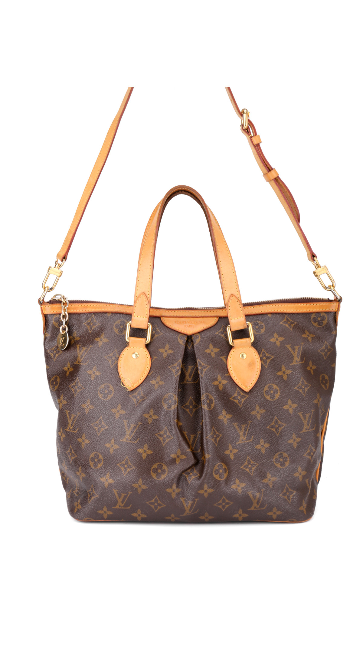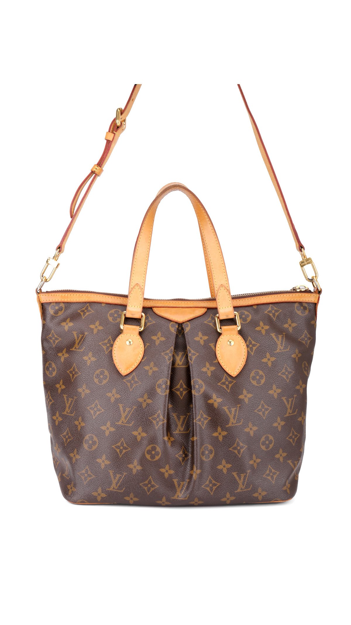 Louis Vuitton Palermo PM i klassisk Monogram Canvas er en sofistikert og praktisk veske, kjent for sin romslige form og feminine detaljer. Den er laget i slitesterkt canvas med naturlig vachetta-skinn på håndtak og detaljer, samt gullfarget hardware.