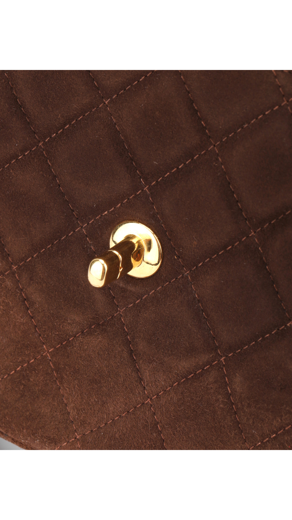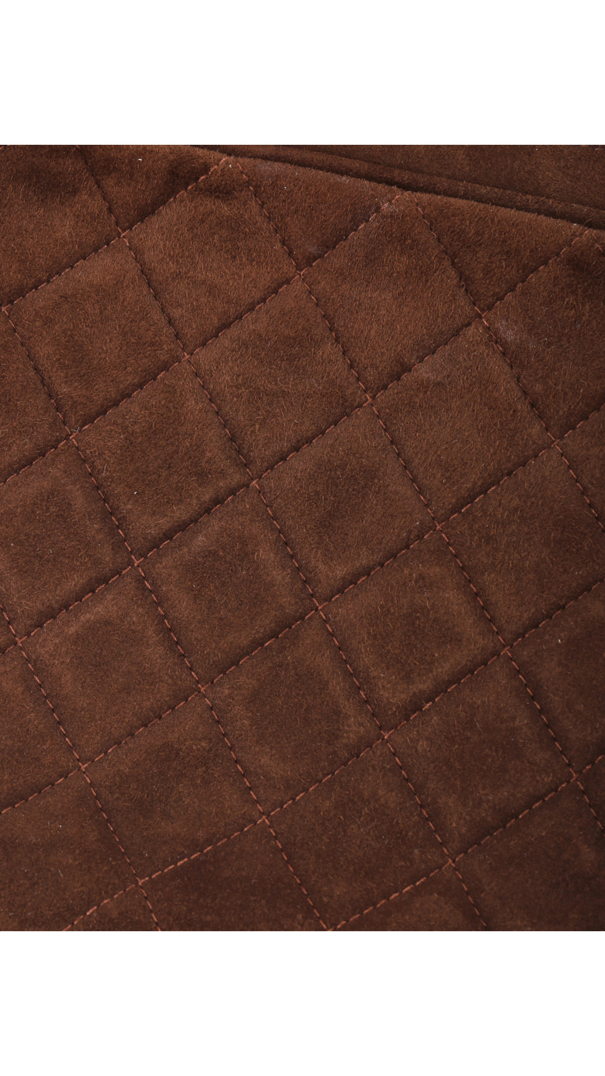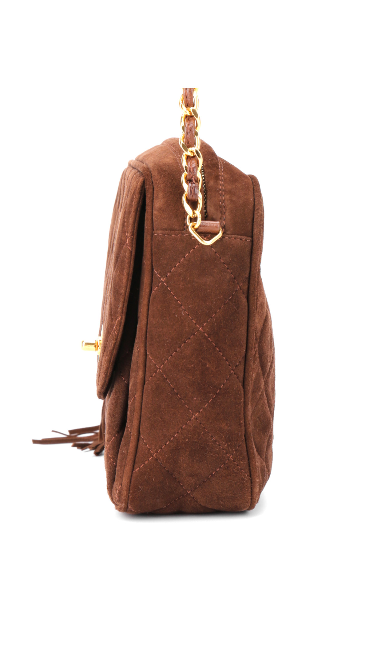 Chanel Camera Bag i brun semsket skinn er en sjelden og elegant veske med ikonisk quiltet design og klassiske CC-detaljer i gullfarget hardware. Den kjennetegnes av den lekre dusken på glidelåsen og den tidløse kjederemmen med lærinnfletting.