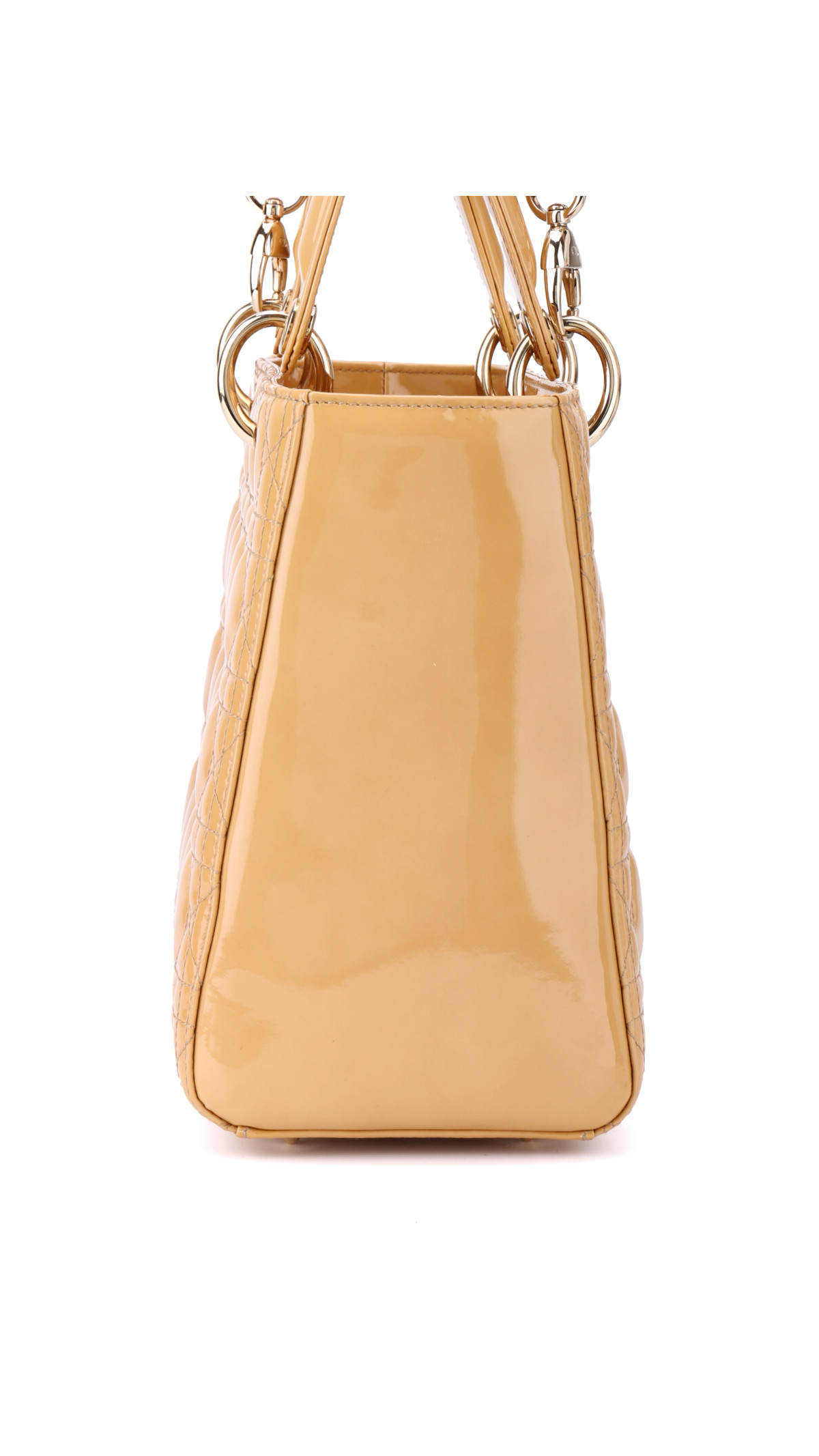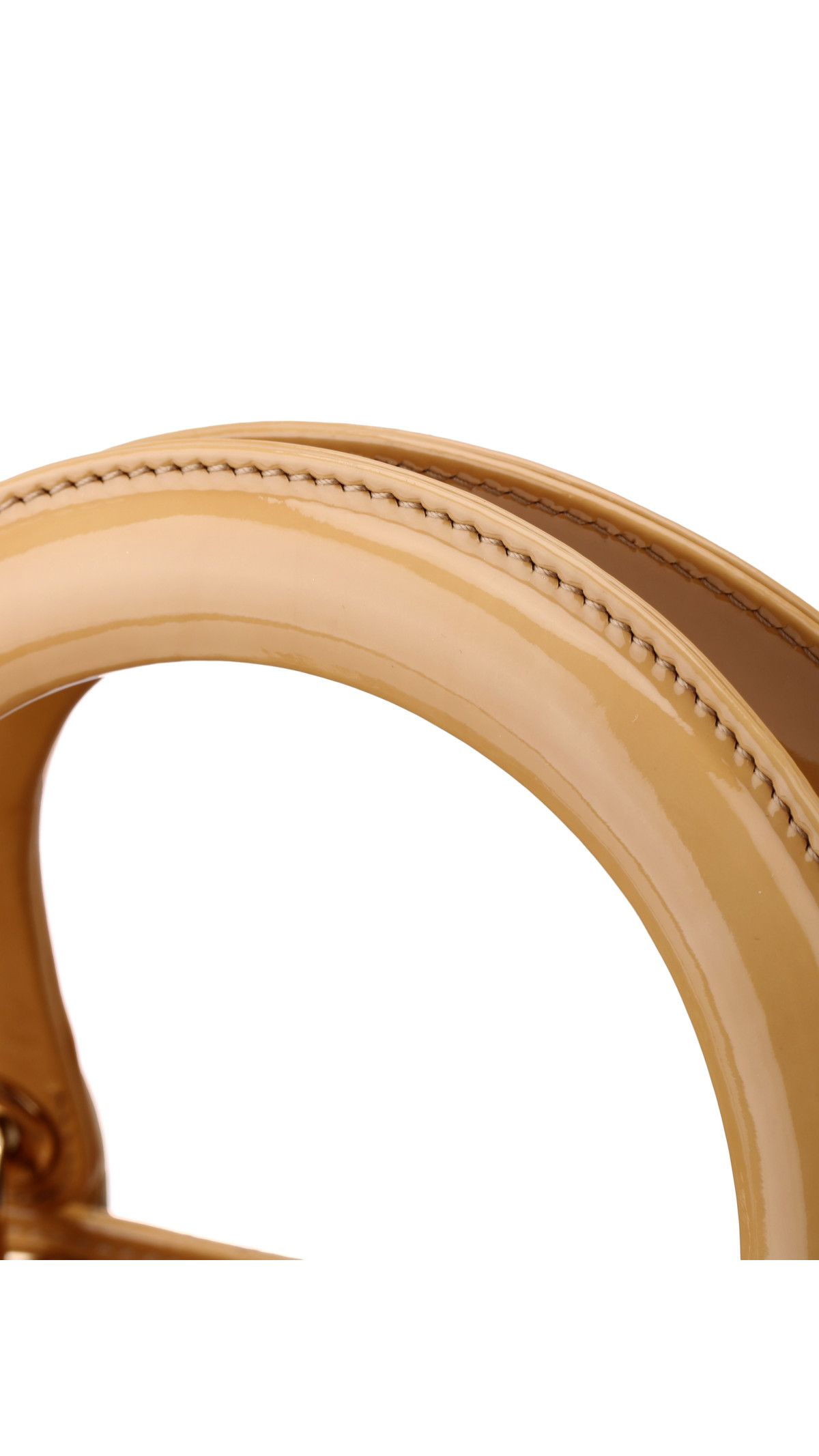 Farge: Beige patent skinn med gullfarget hardware