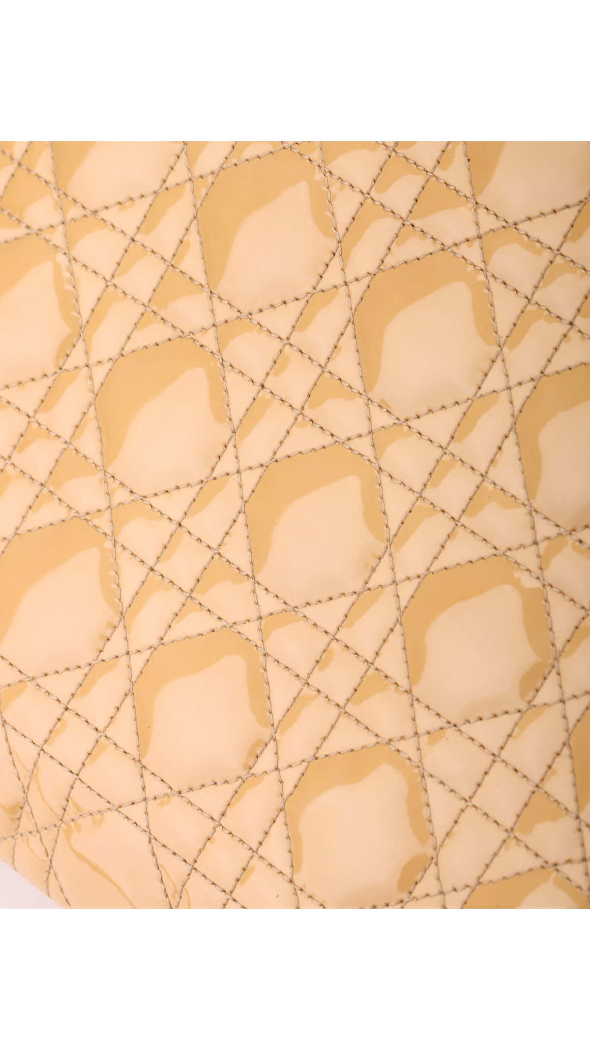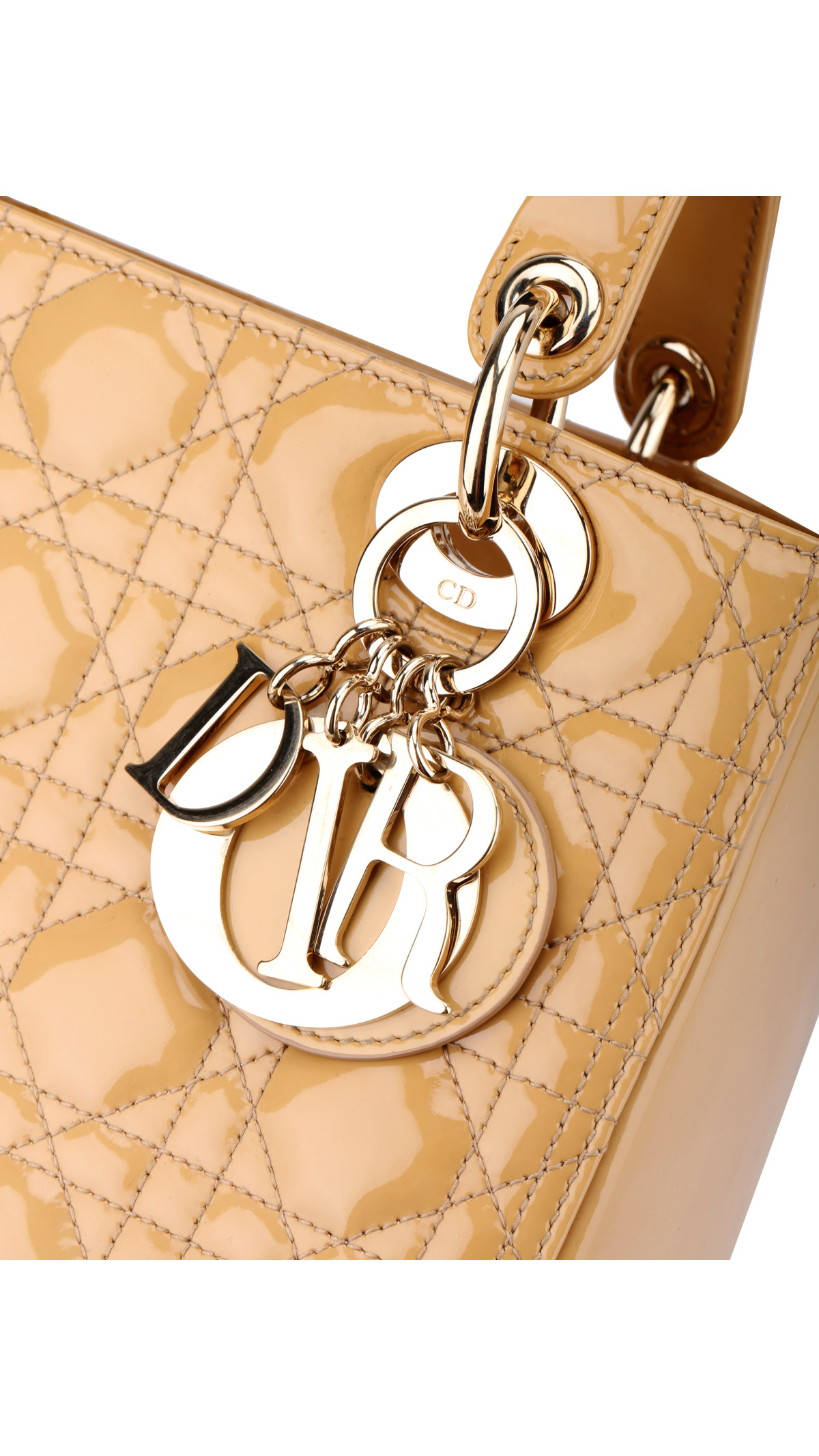 Christian Dior Lady Dior i beige patent skinn er en tidløs og elegant veske med den ikoniske quiltede "Cannage"-syddetaljen og gullfargede Dior-bokstavanheng. Denne modellen er kjent for sitt sofistikerte uttrykk og feminine design.