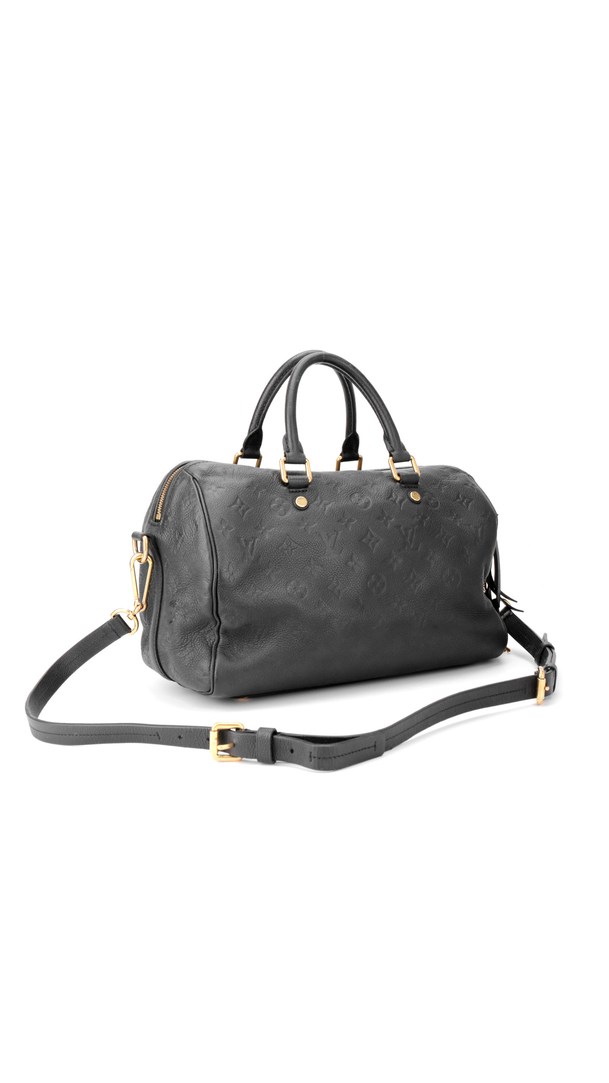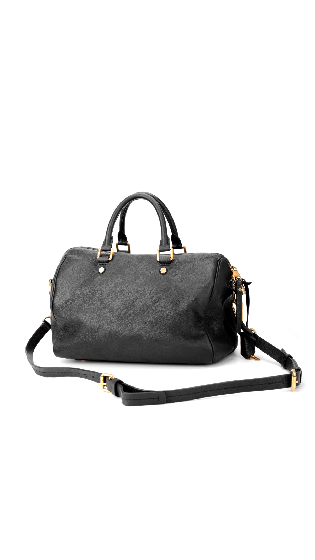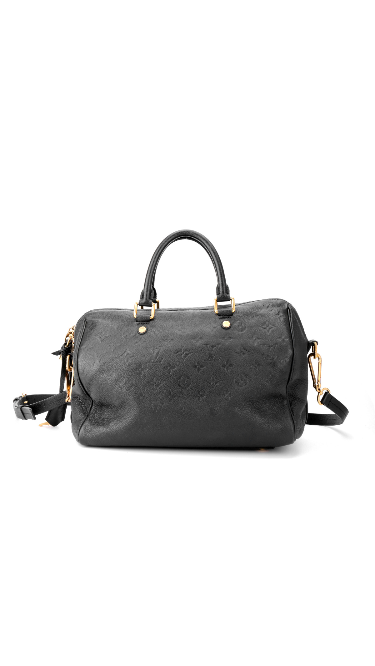 Louis Vuitton Speedy 30 i sort Monogram Empreinte skinn kombinerer klassisk eleganse med moderne luksus. Vesken er laget i preget mykt skinn med den ikoniske monogramstrukturen og gullfarget metallhardware. Den har doble topphåndtak og en avtagbar skulderrem som gir fleksibilitet til både håndholdt og crossbody-bruk.
