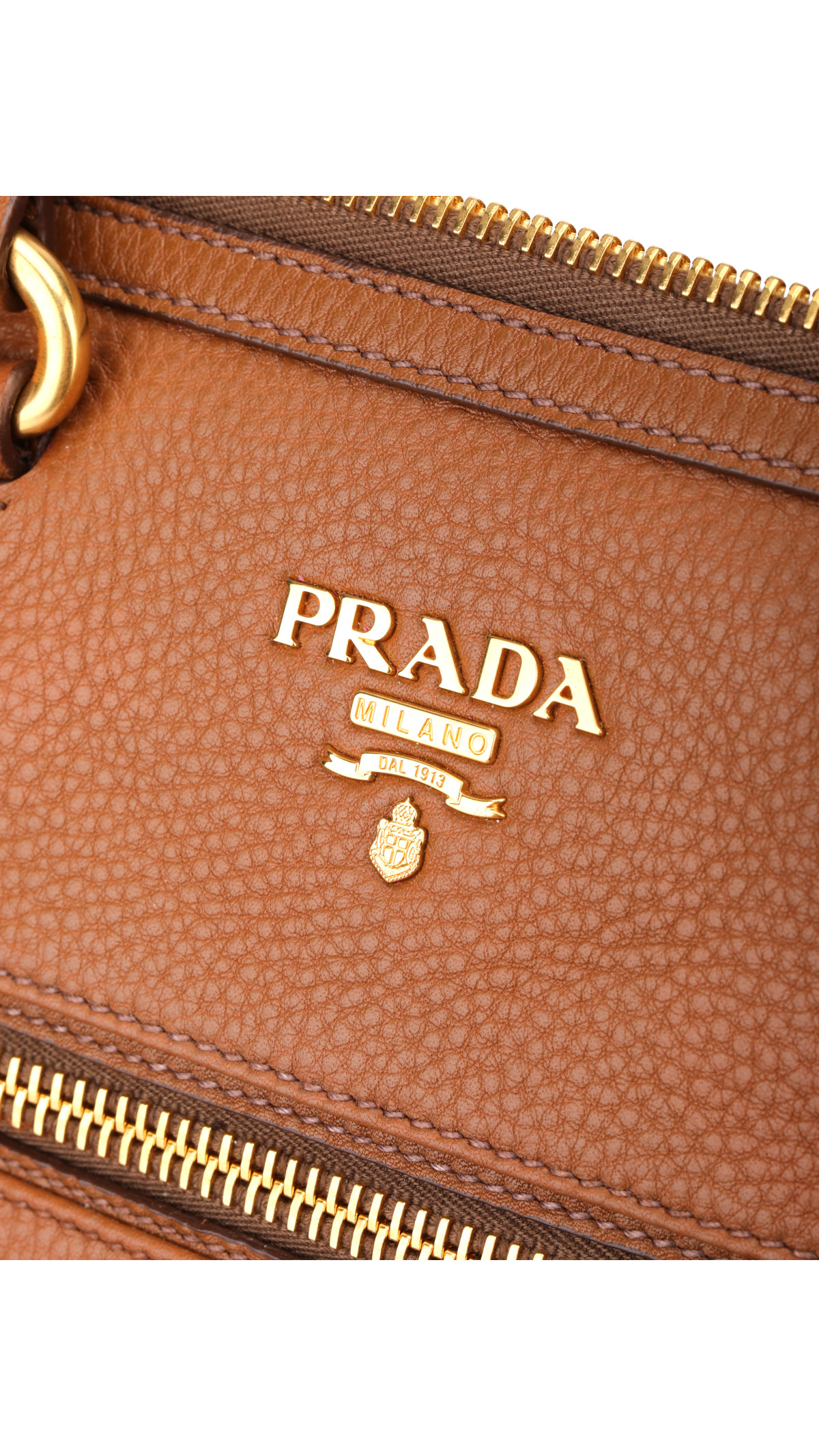 Prada Vitello Daino Front Zip Tote Shoulder Bag Cognac