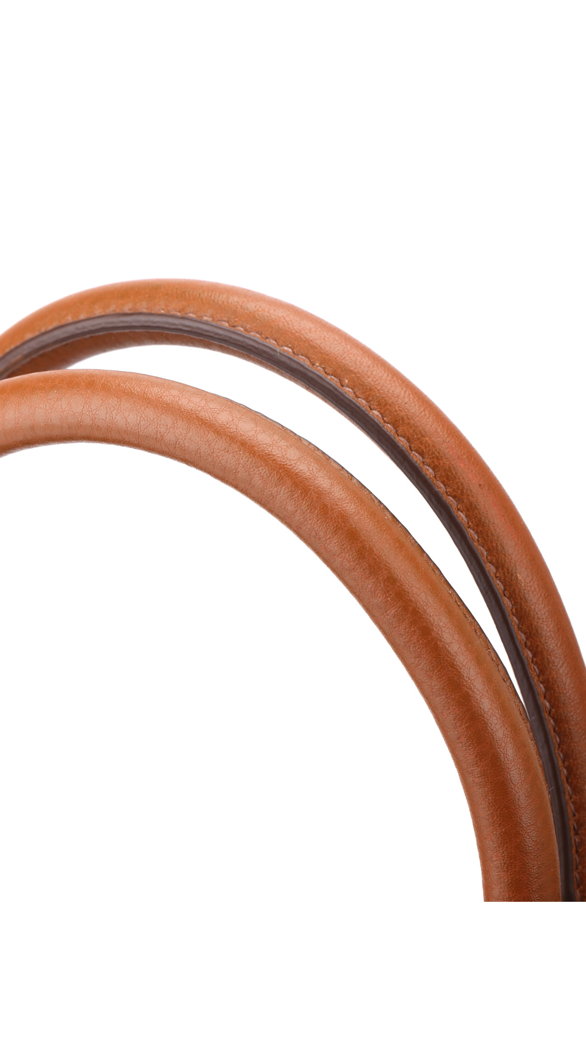 Prada Vitello Daino Tote i cognacfarget skinn er en praktisk og tidløs hverdagsveske, kjent for sitt myke og slitesterke skinn med elegant kornet tekstur. Vesken har doble topphåndtak, avtagbar skulderrem og gullfarget metallhardware som gir et luksuriøst preg.