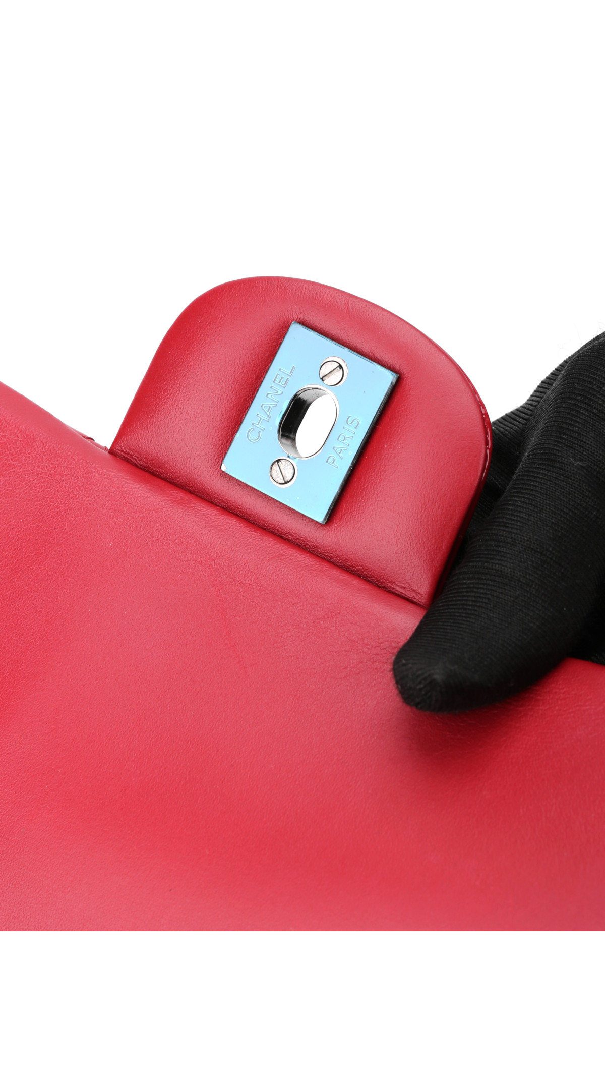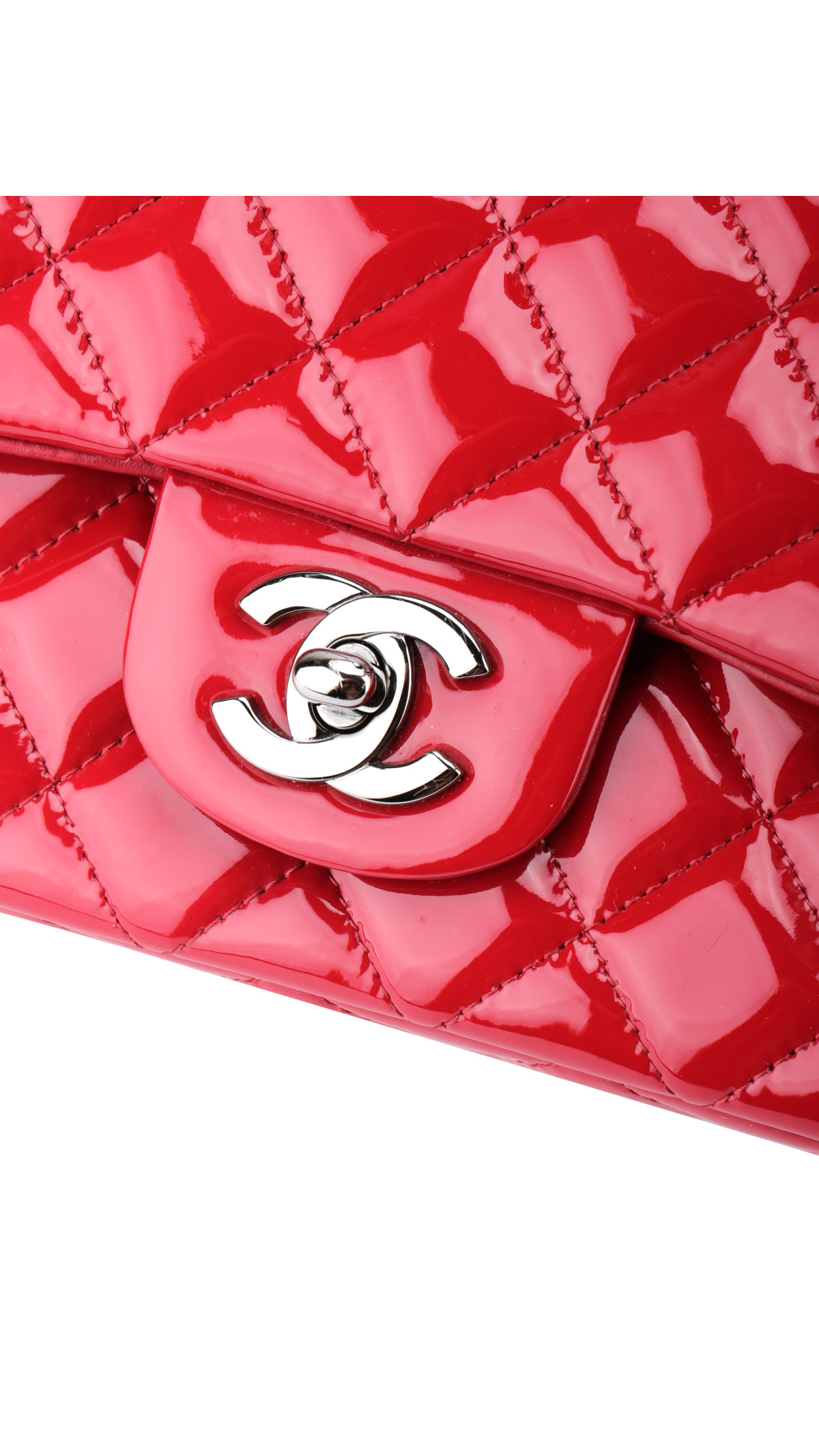 Chanel Classic Flap Bag i rødt patent skinn er en tidløs og iøynefallende veske som kombinerer luksus og eleganse. Det quiltede skinnet fremheves av sølvfarget metallhardware og den ikoniske CC-turnlock-låsen i front.