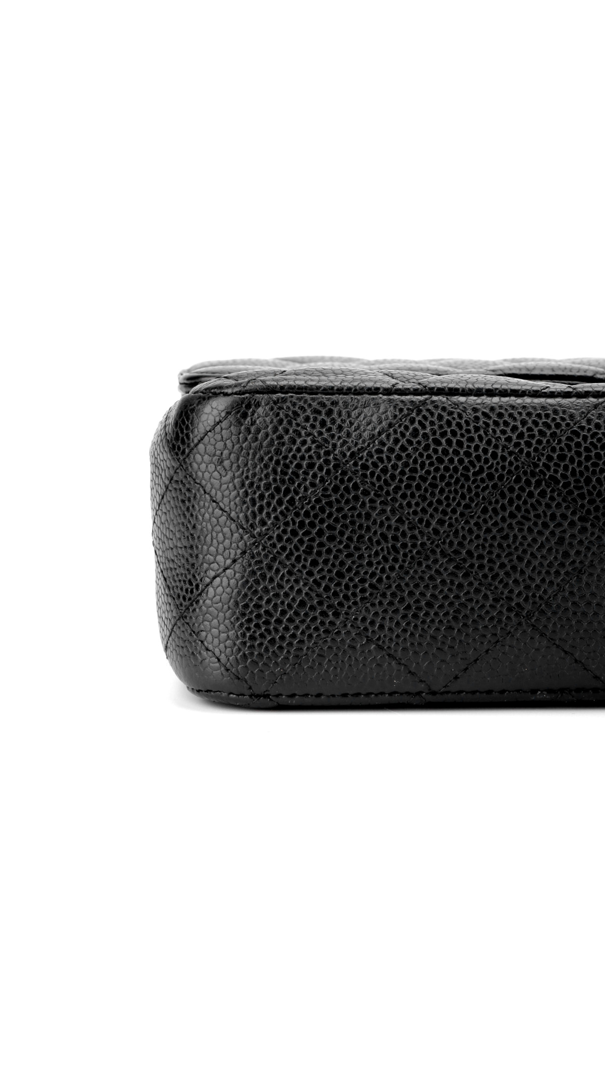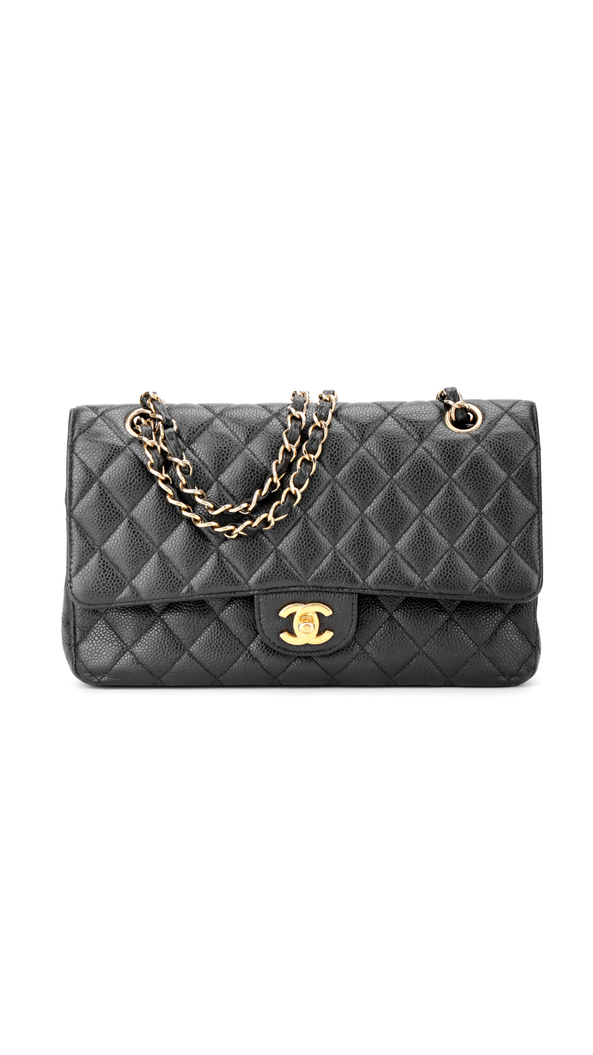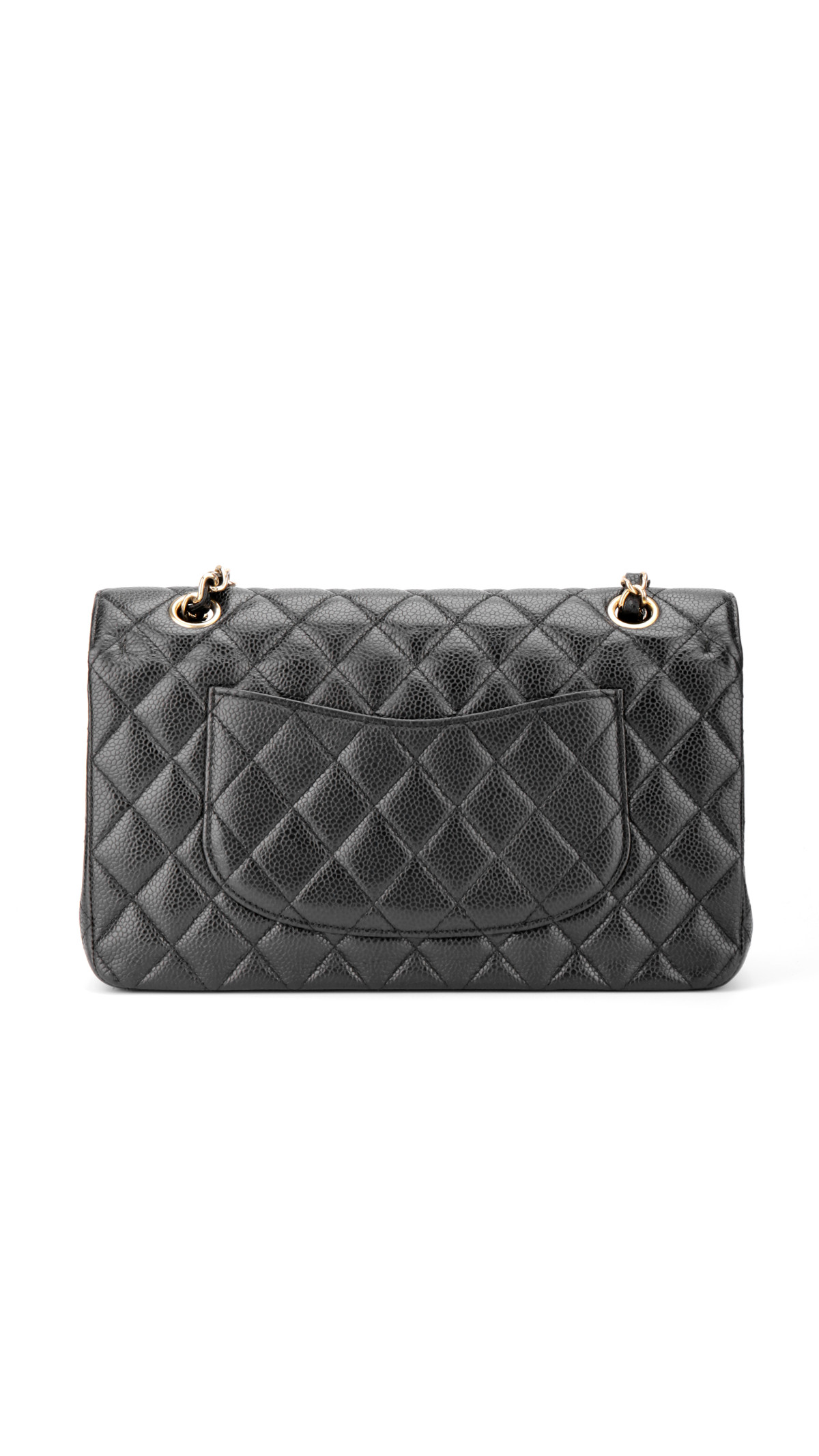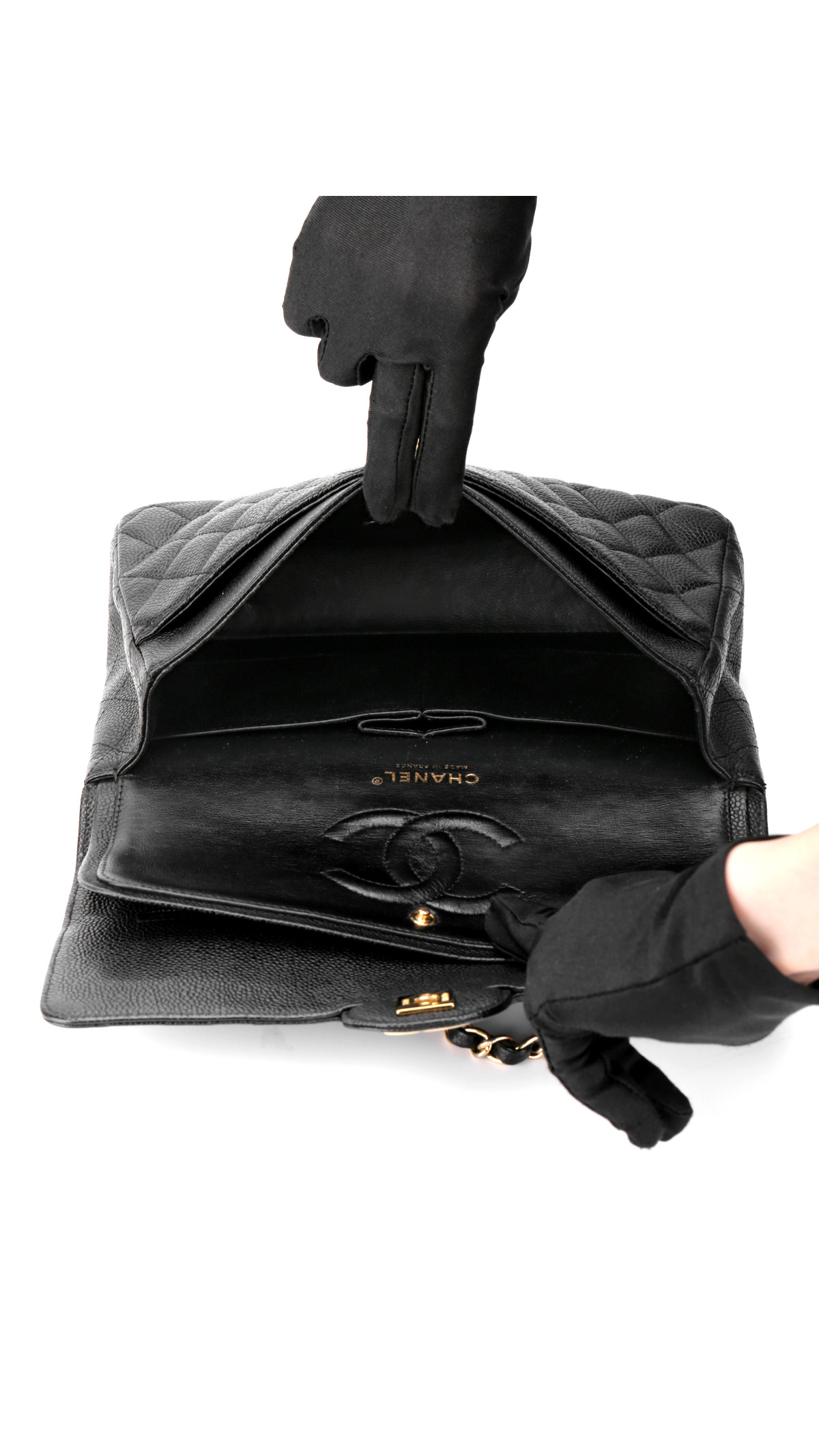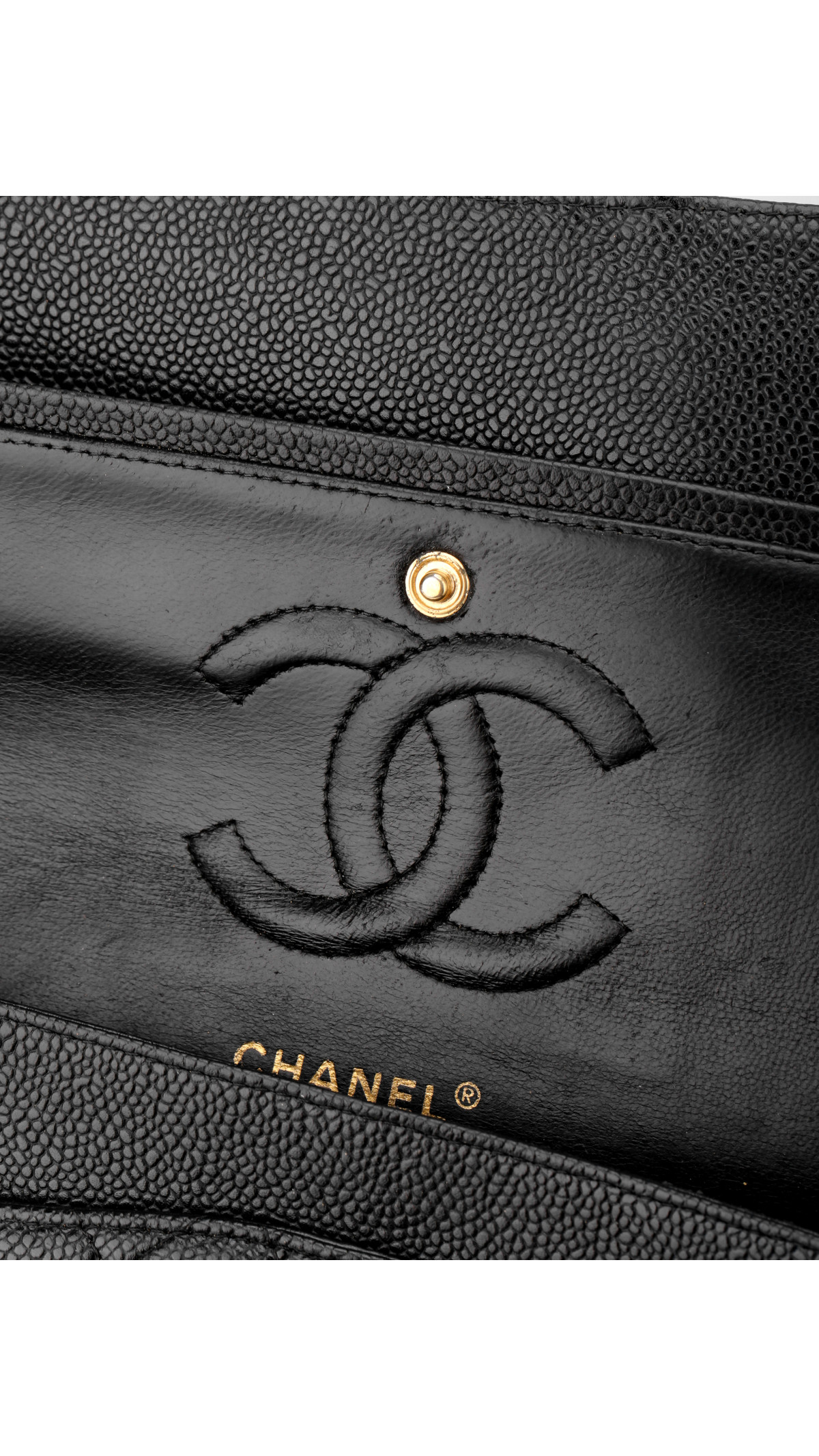 Chanel Classic Double Flap i sort caviar-skinn er en av de mest ikoniske og tidløse veskene fra Chanel. Den er laget i slitesterkt quiltet caviar-skinn med elegant gullfarget metallhardware og den klassiske CC-turnlock-låsen i front.