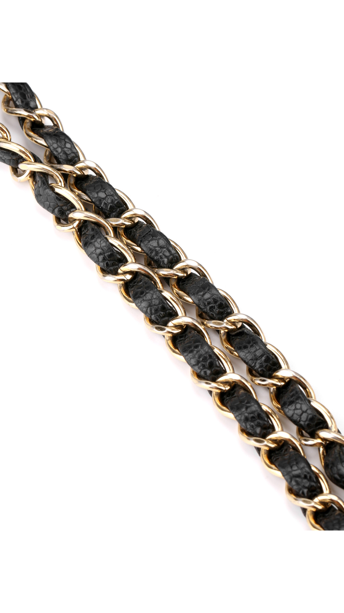 Vesken har et dobbelt klaff-design som gir ekstra sikkerhet og flere rom for organisering. Innsiden er foret i skinn og har både glidelåslomme og små lommer. Den ikoniske kjedestroppen med innflettet skinn kan bæres både enkelt og dobbelt, slik at vesken kan brukes som skulderveske eller crossbody.