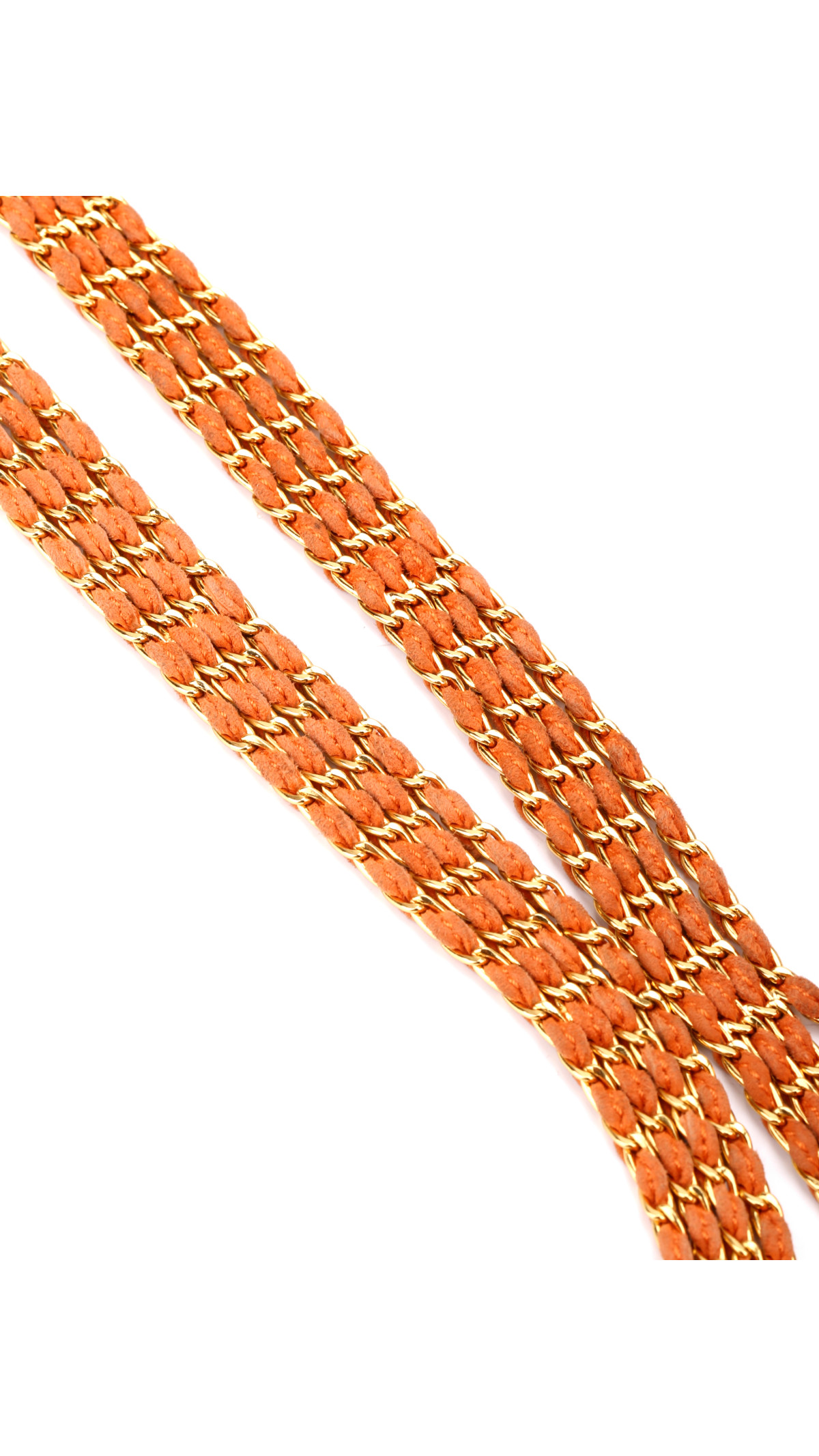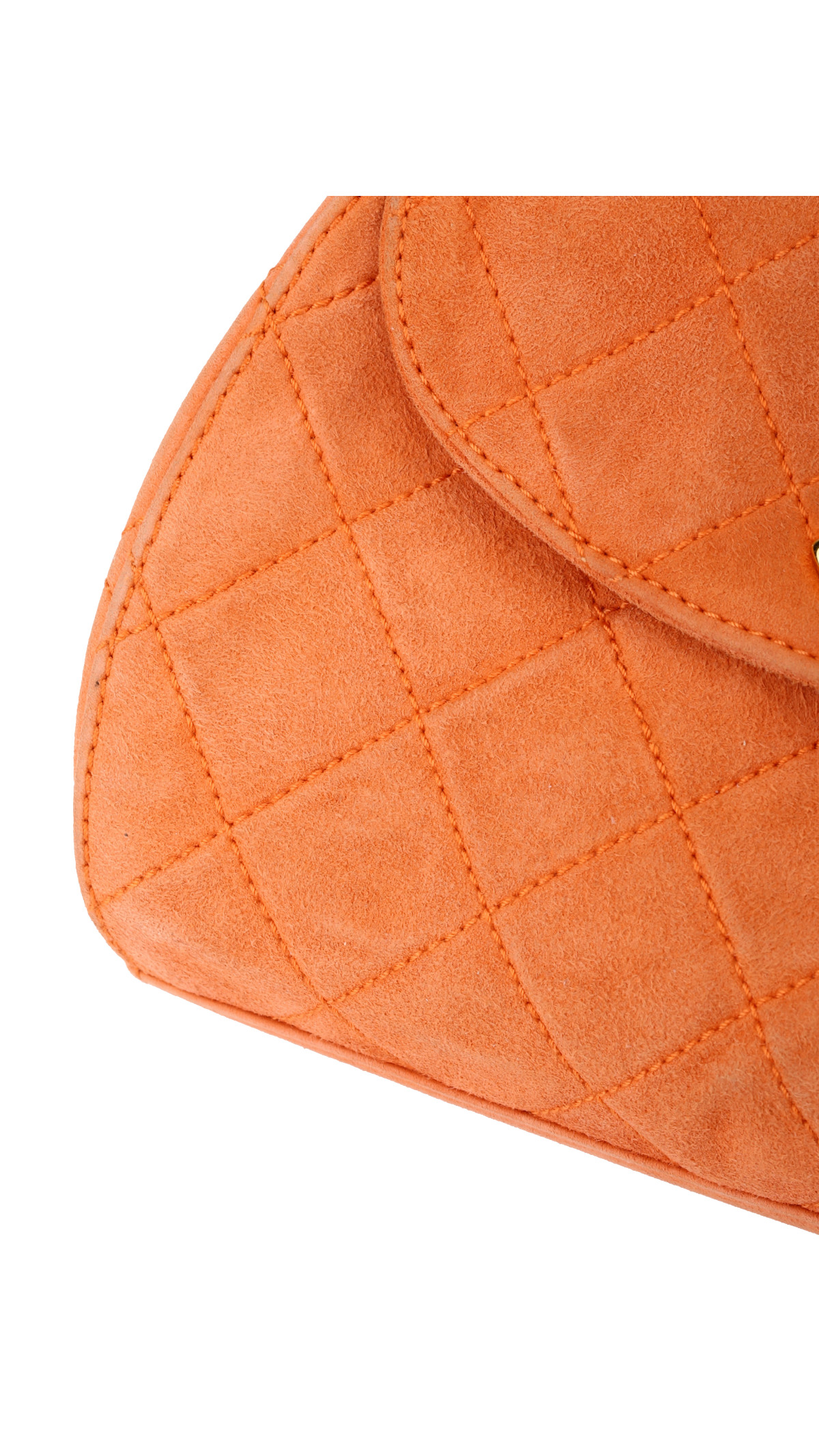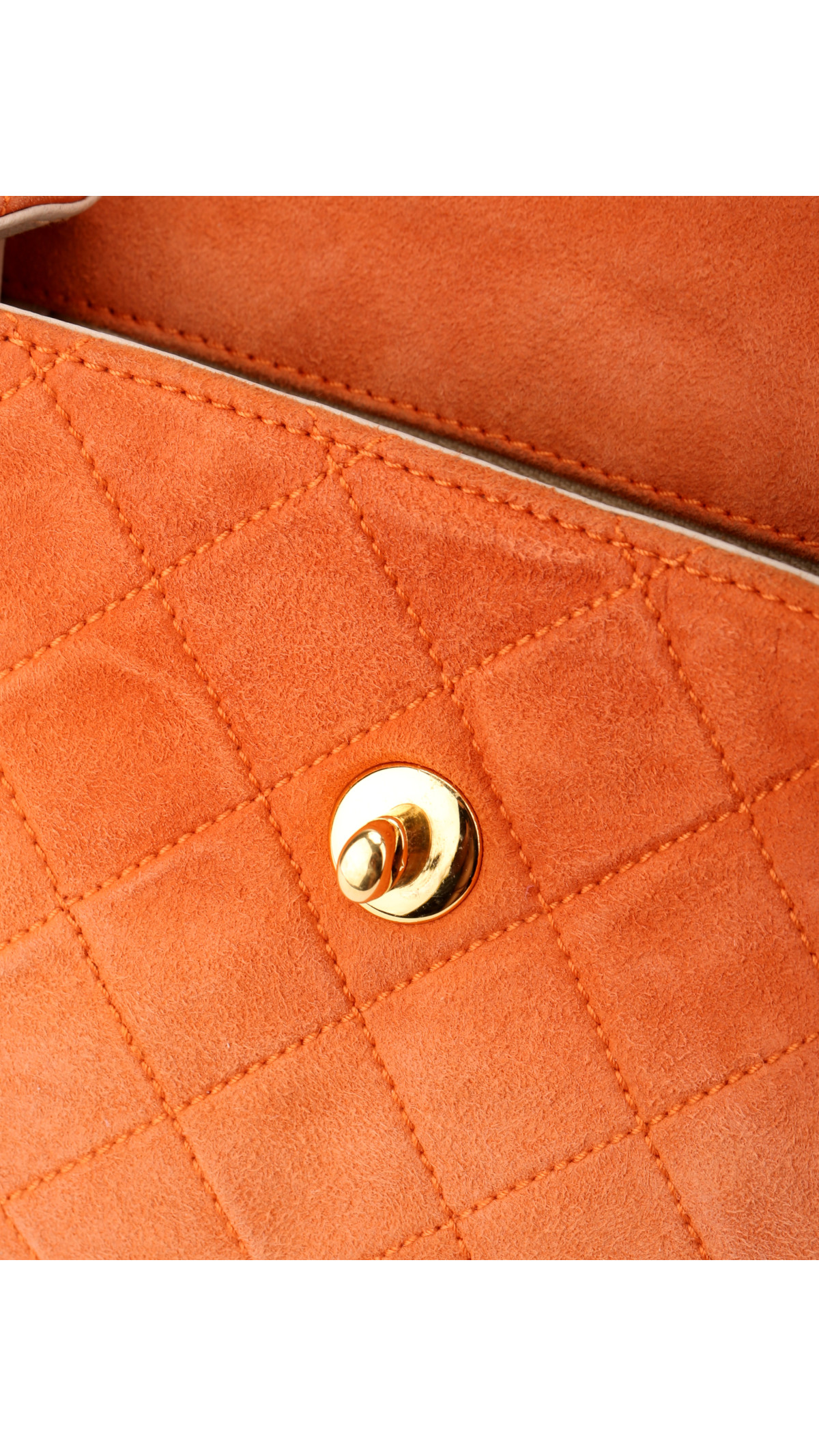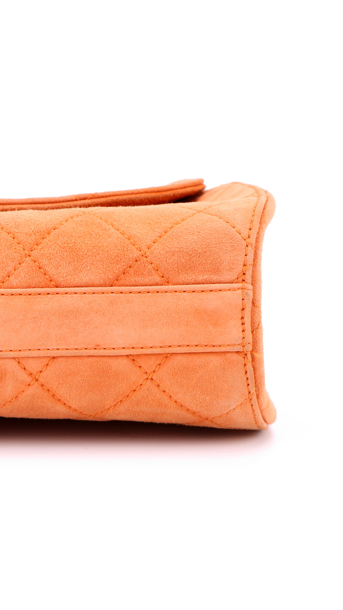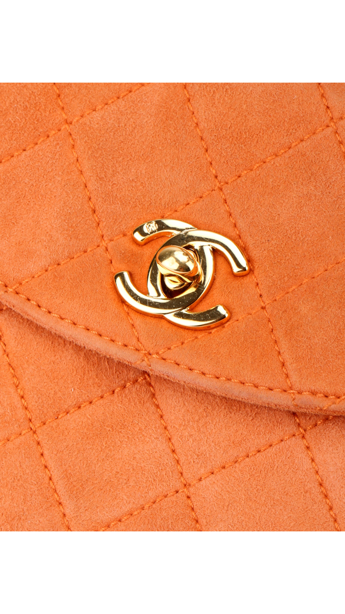 Chanel Mini Single Flap Bag i oransje semsket skinn er en sjelden og elegant variant av den ikoniske Chanel-modellen. Det quiltede semskede skinnet gir vesken et unikt og sofistikert preg, kombinert med gullfarget metallhardware og den klassiske CC-turnlock-låsen i front.