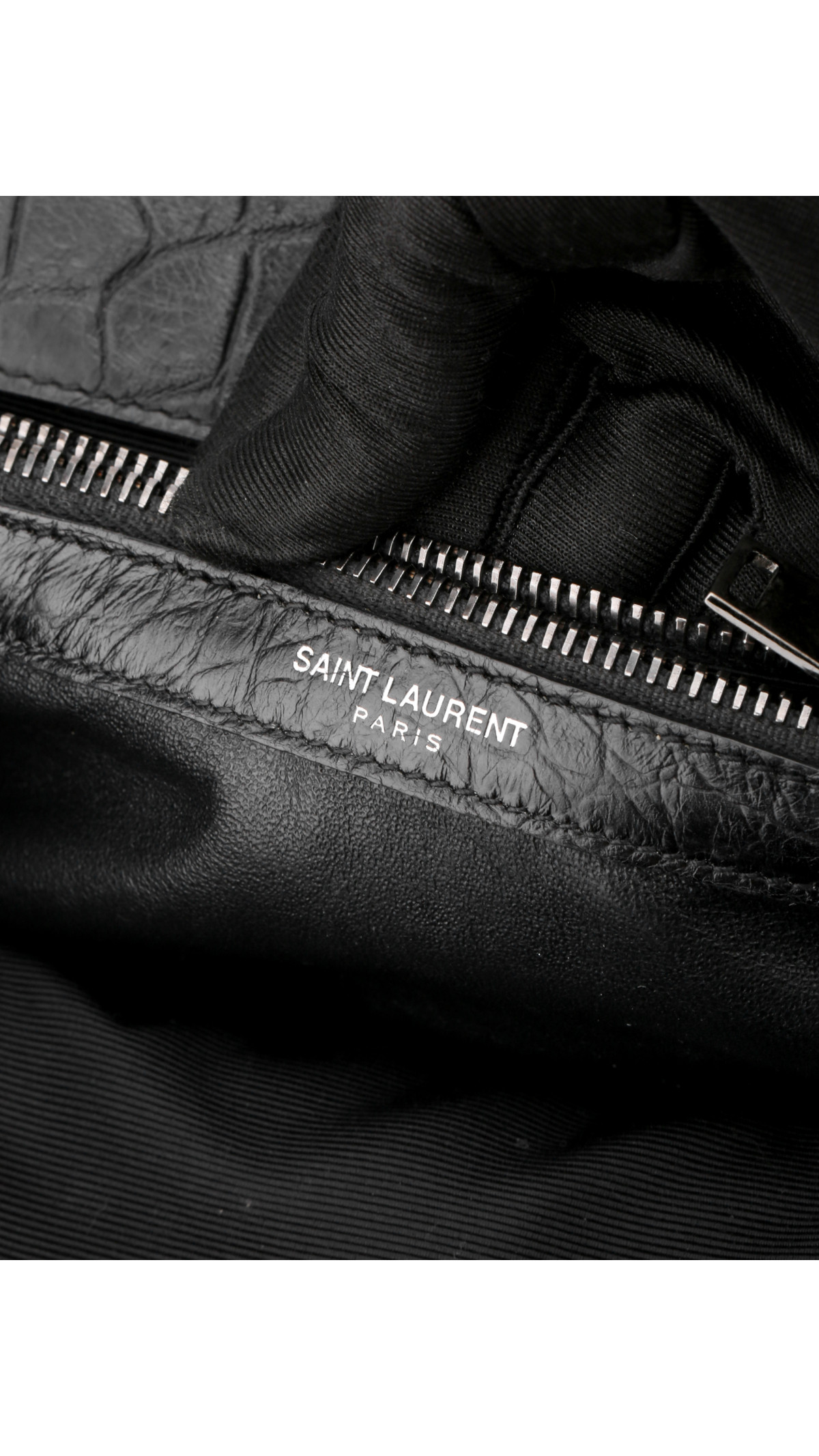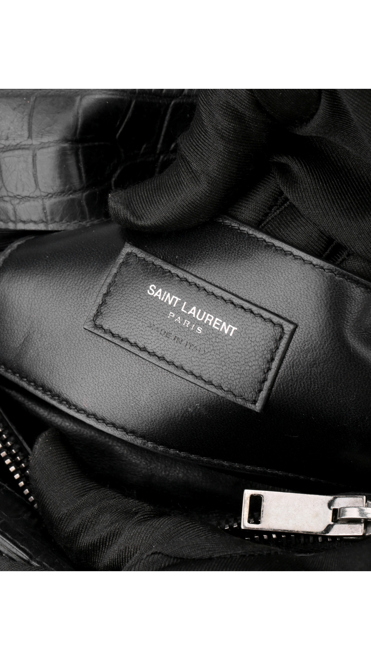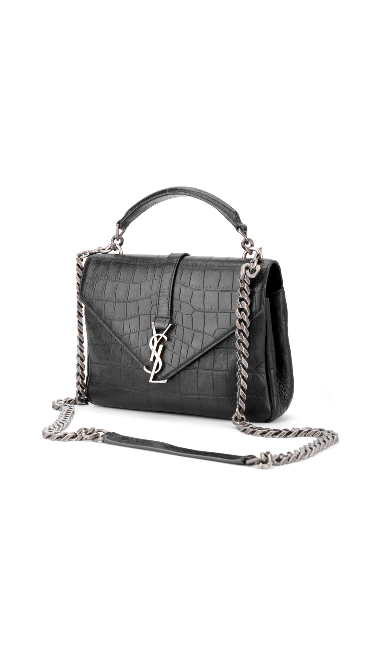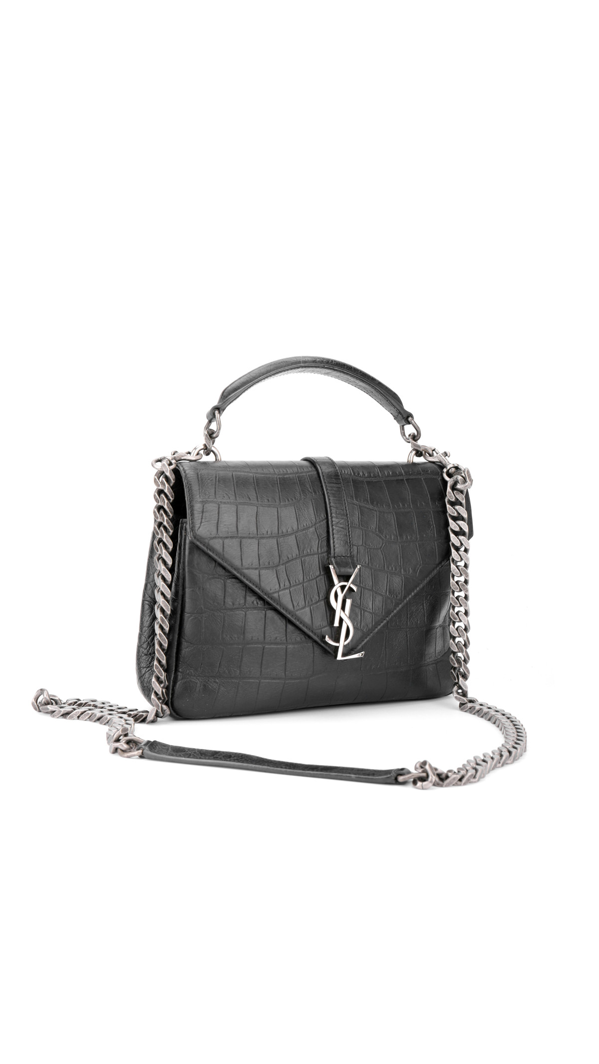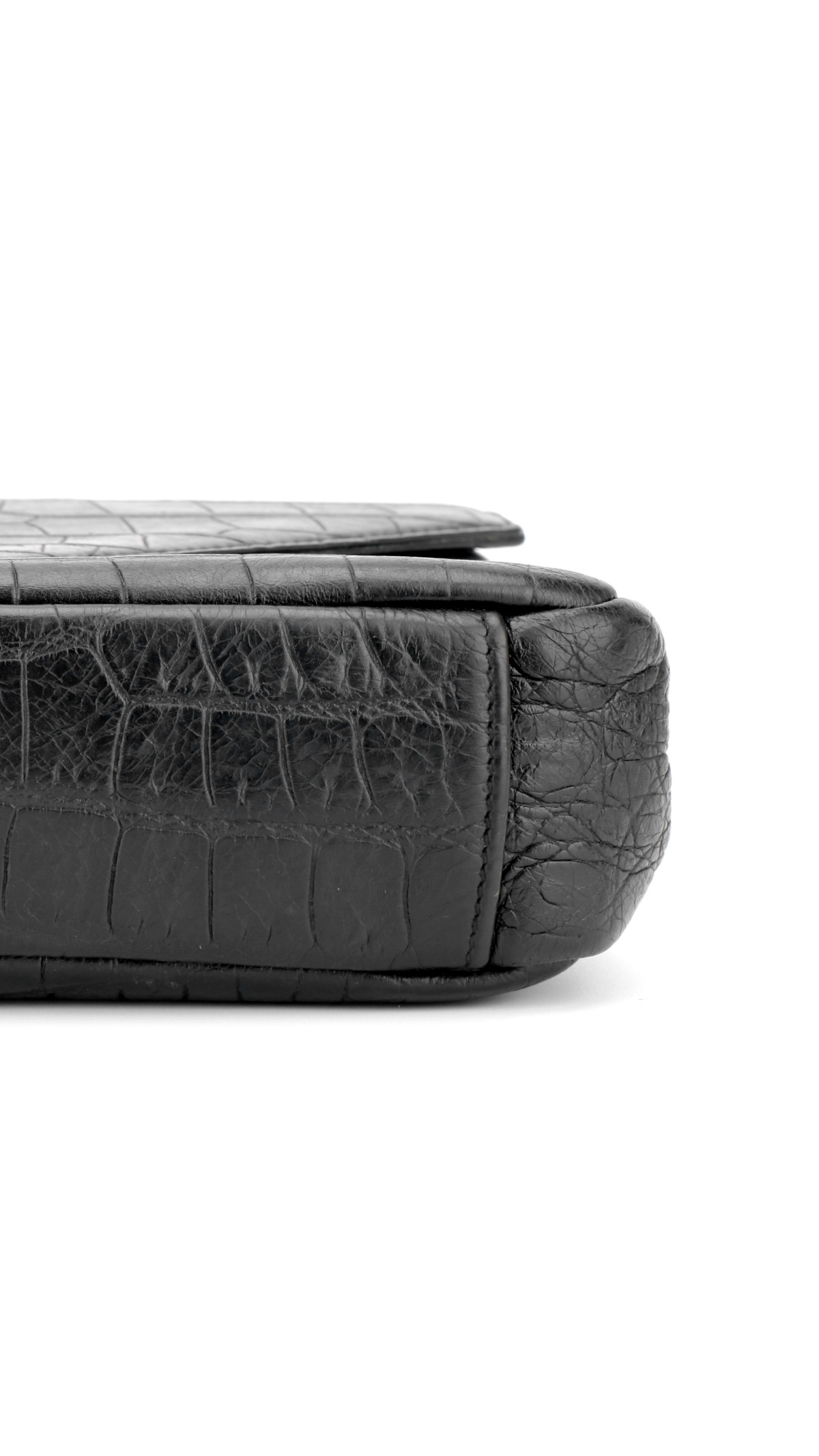Saint Laurent College Medium i sort krokopreget skinn er en elegant og moderne veske som kombinerer strukturert design med luksuriøse detaljer. Fronten prydes av den ikoniske YSL-logoen i sølvfarget metall, og vesken har den karakteristiske vatterte looken som kjennetegner College-serien.