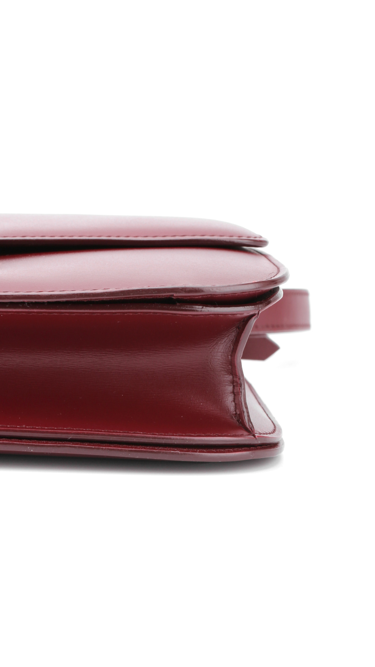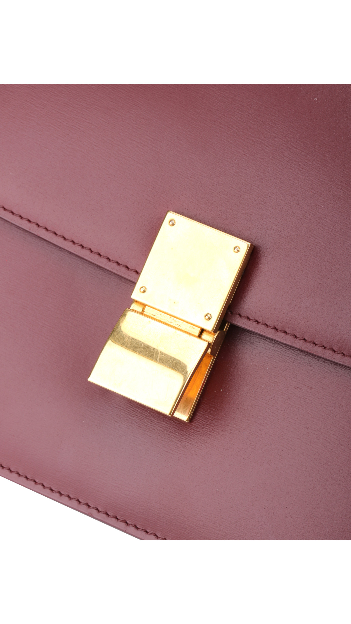 Céline Box Bag Medium i burgunder kalveskinn er en tidløs og elegant veske kjent for sitt minimalistiske og sofistikerte design. Modellen har et strukturert uttrykk med glatt skinn og gullfarget metallhardware som gir et luksuriøst preg.