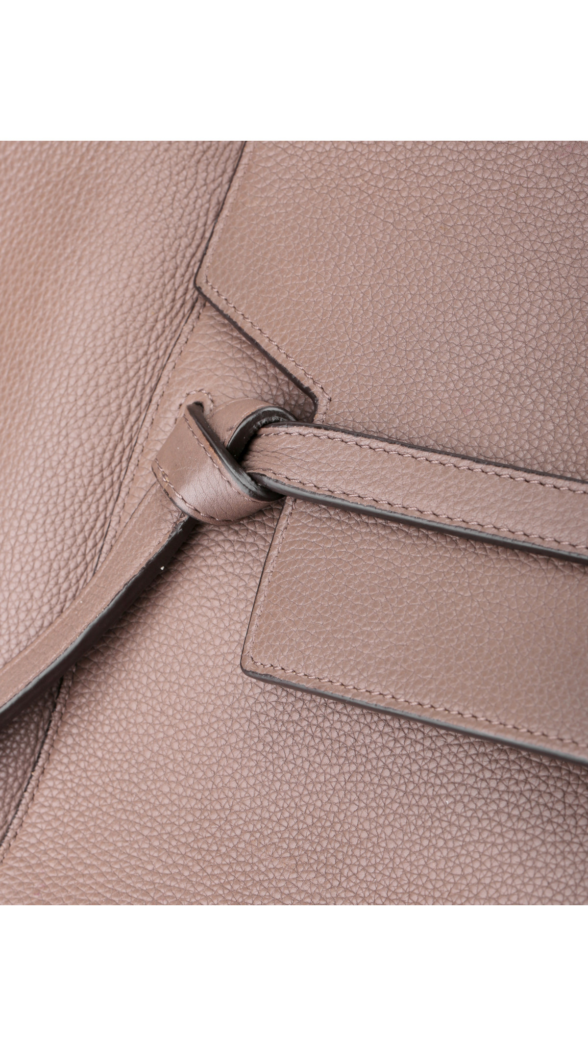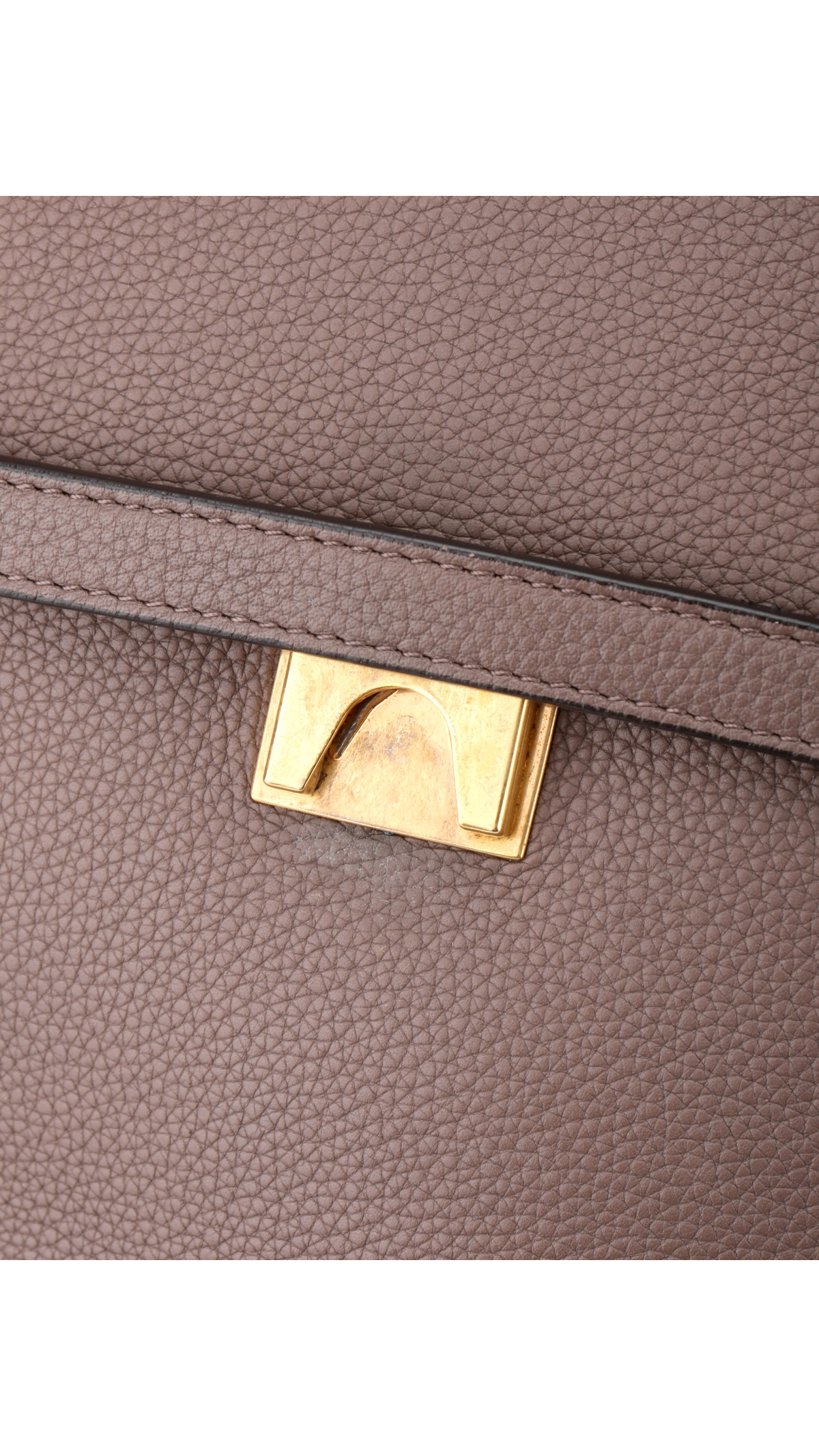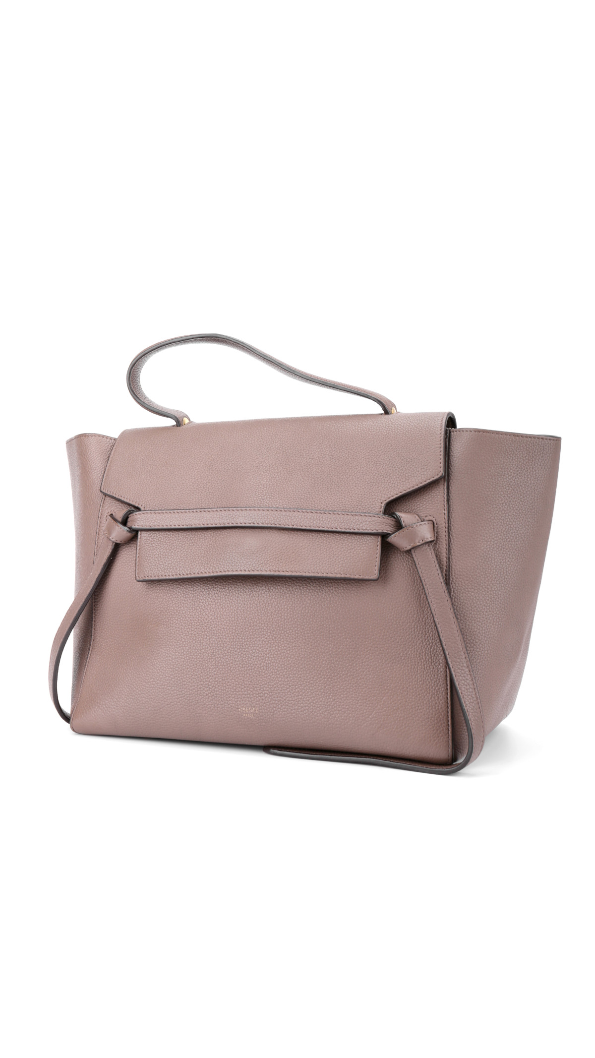 Céline Belt Bag Medium i taupefarget grained skinn er en moderne og sofistikert veske med et minimalistisk design. Modellen har en strukturert fasong med den karakteristiske frontklaffen og beltedetaljen, kombinert med gullfarget metallhardware som gir et luksuriøst preg.