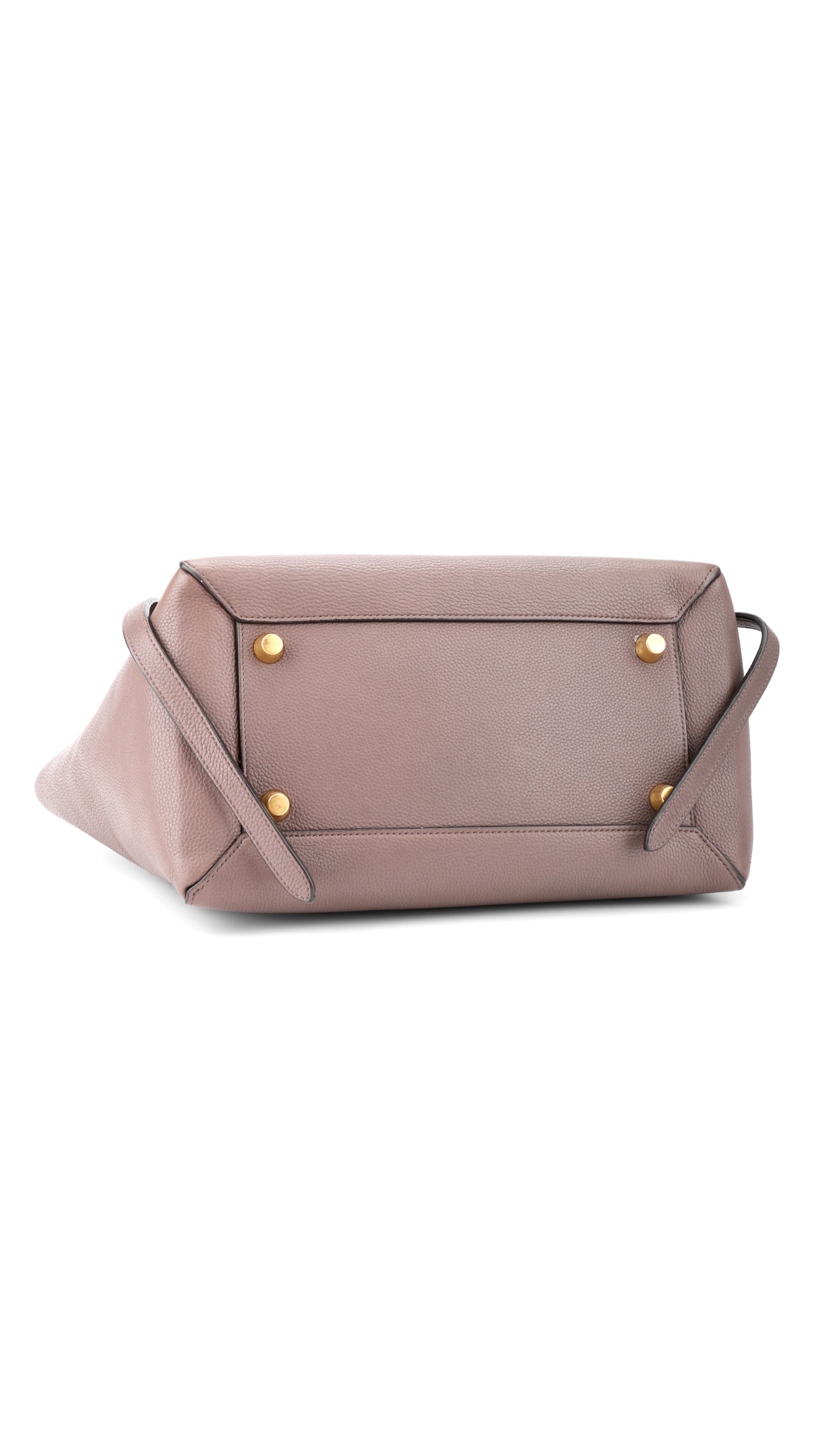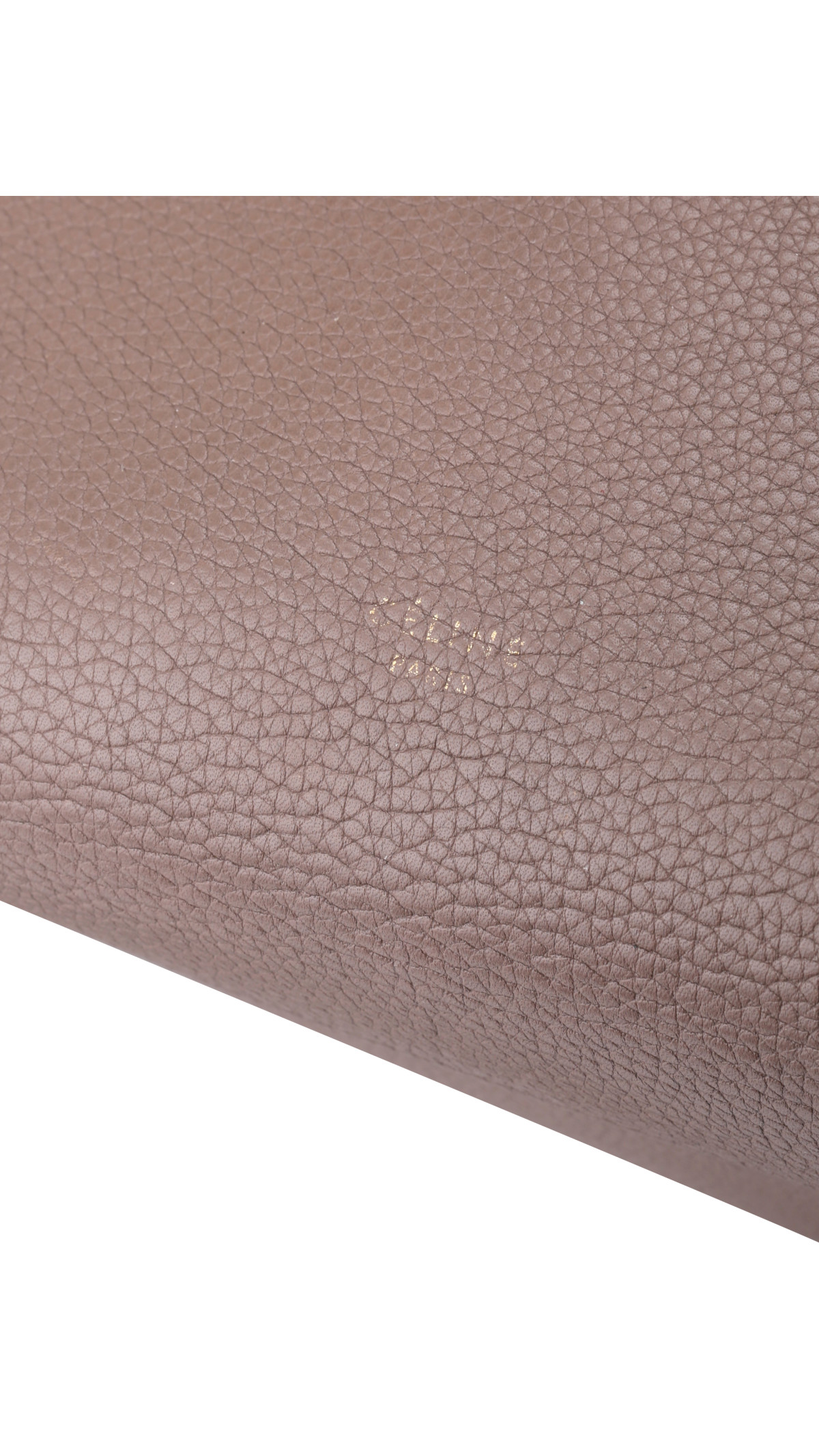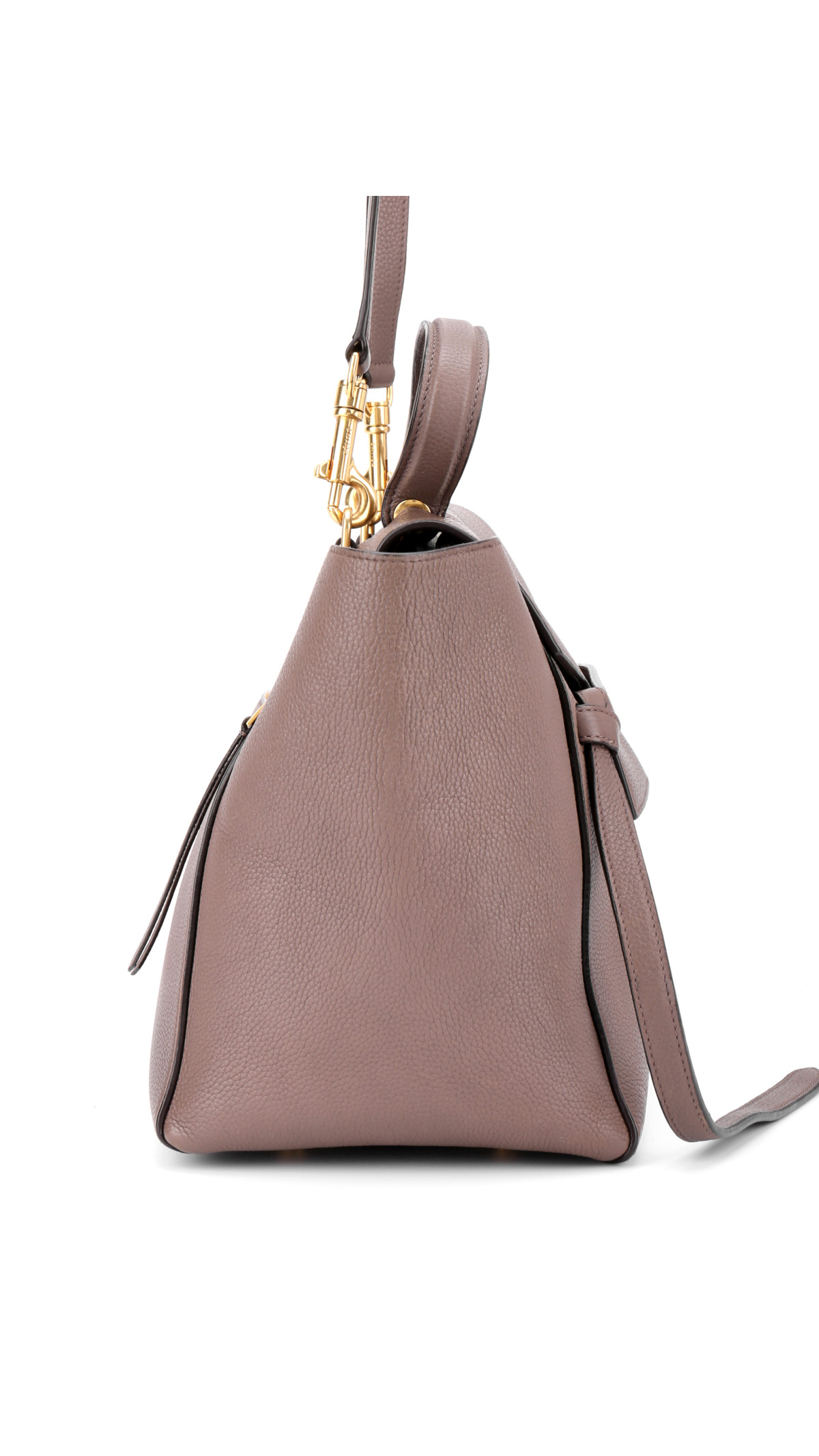Céline Belt Bag Medium i taupefarget grained skinn er en moderne og sofistikert veske med et minimalistisk design. Modellen har en strukturert fasong med den karakteristiske frontklaffen og beltedetaljen, kombinert med gullfarget metallhardware som gir et luksuriøst preg.