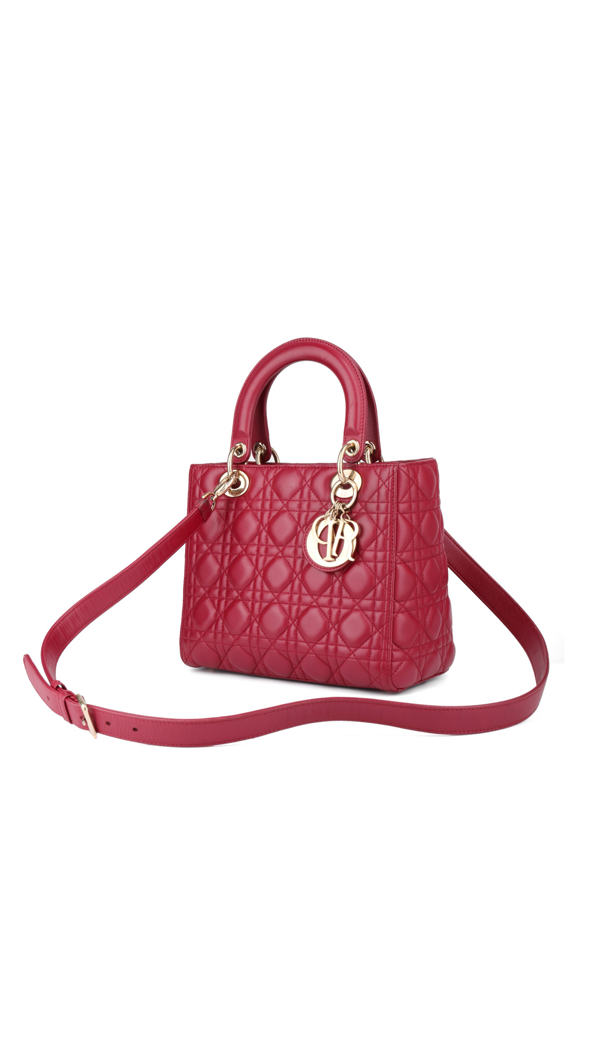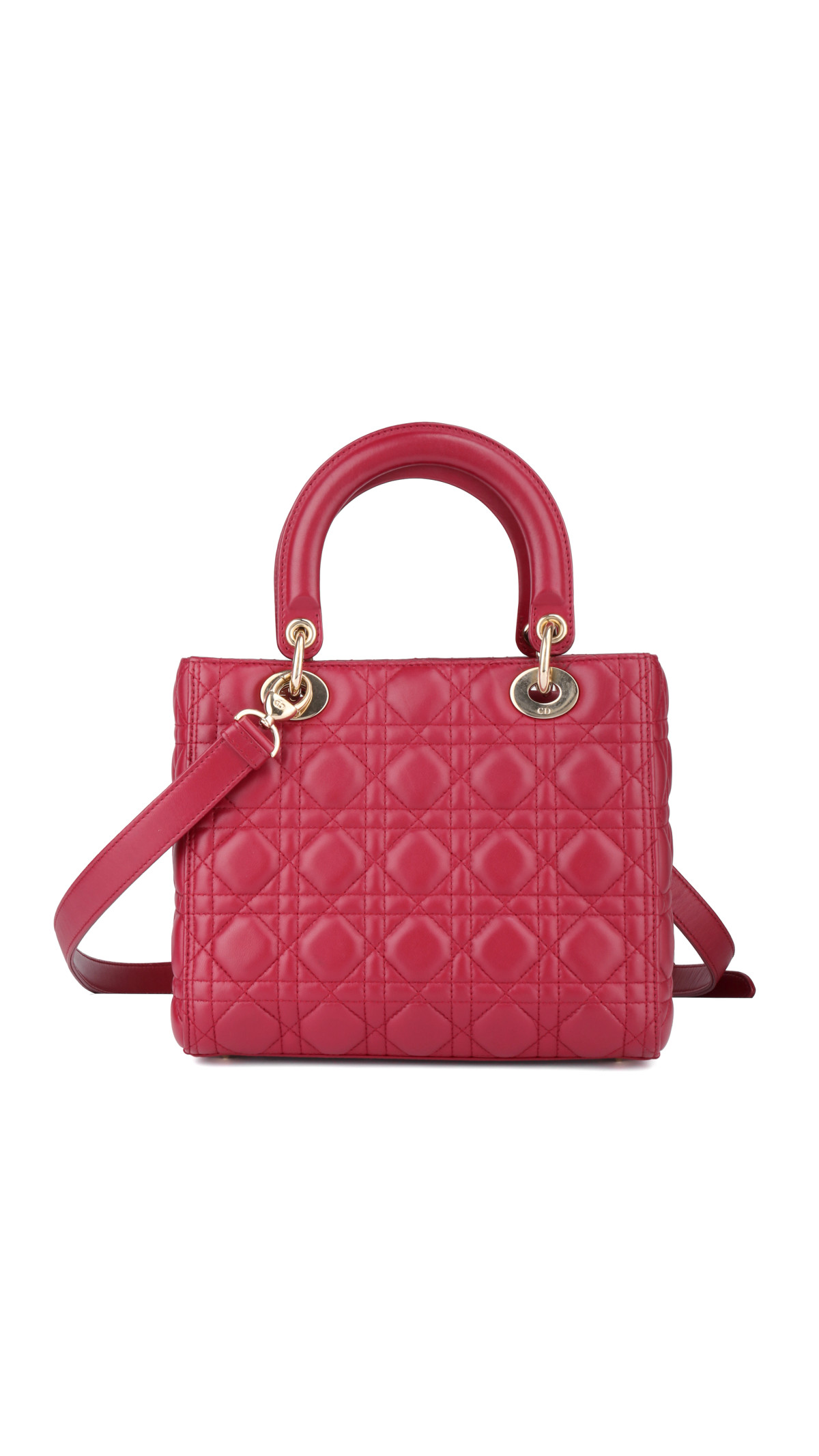 Christian Dior Lady Dior Medium i rødt lammeskinn er en tidløs og ikonisk veske kjent for sitt elegante "Cannage"-quiltede mønster. Vesken er utsmykket med gullfarget metallhardware og de klassiske Dior-bokstavanhengene som gir et luksuriøst preg.