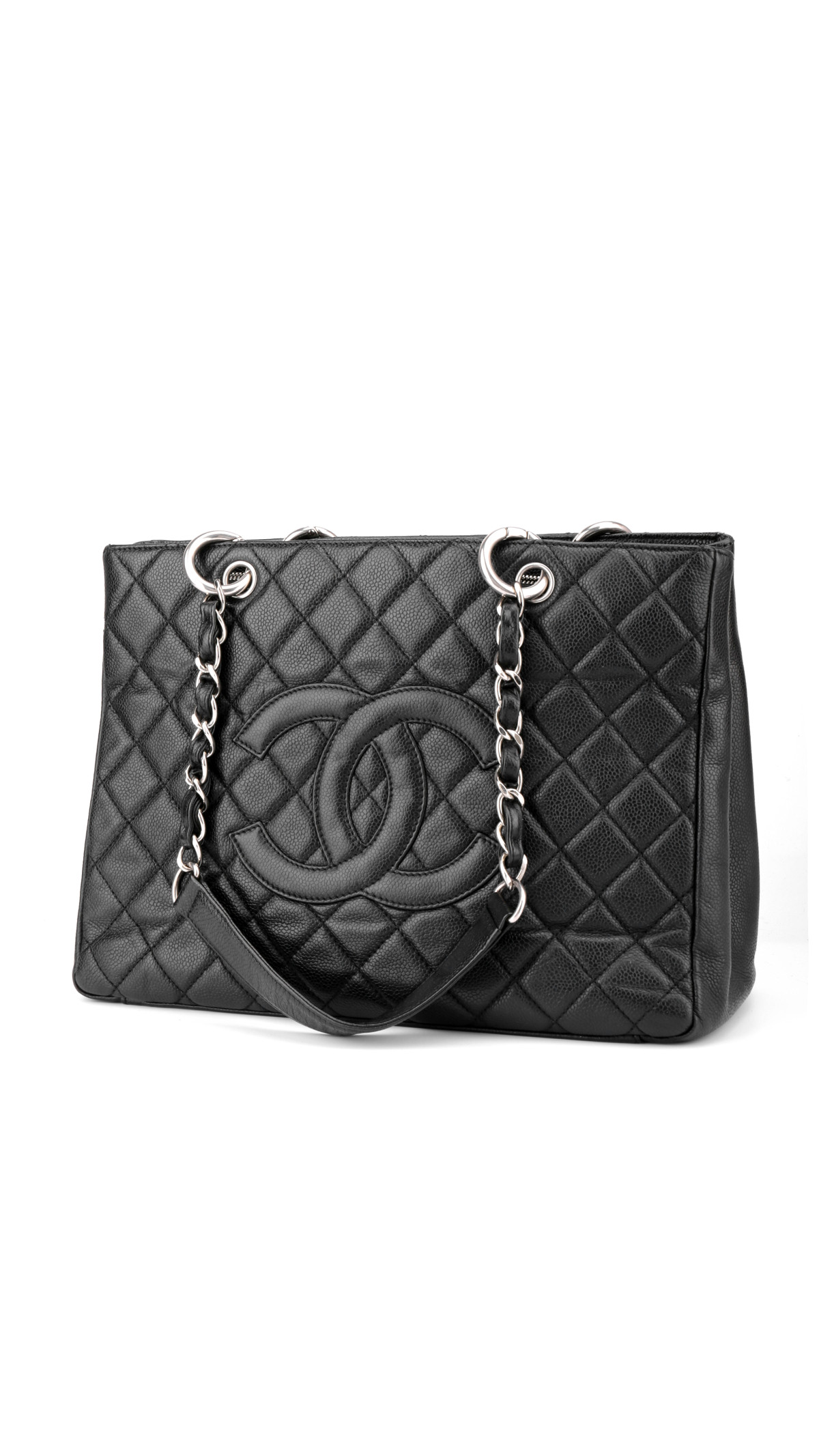 Chanel Grand Shopping Tote, ofte kalt GST, er en av merkets mest ettertraktede tote-vesker. Denne modellen er utført i sort caviar-lær med det ikoniske quiltede mønsteret og en stor CC-logo på fronten. Vesken er utstyrt med sølvfarget metallhardware og de klassiske doble kjedehåndtakene med lærfletting, som gjør den både robust og elegant.