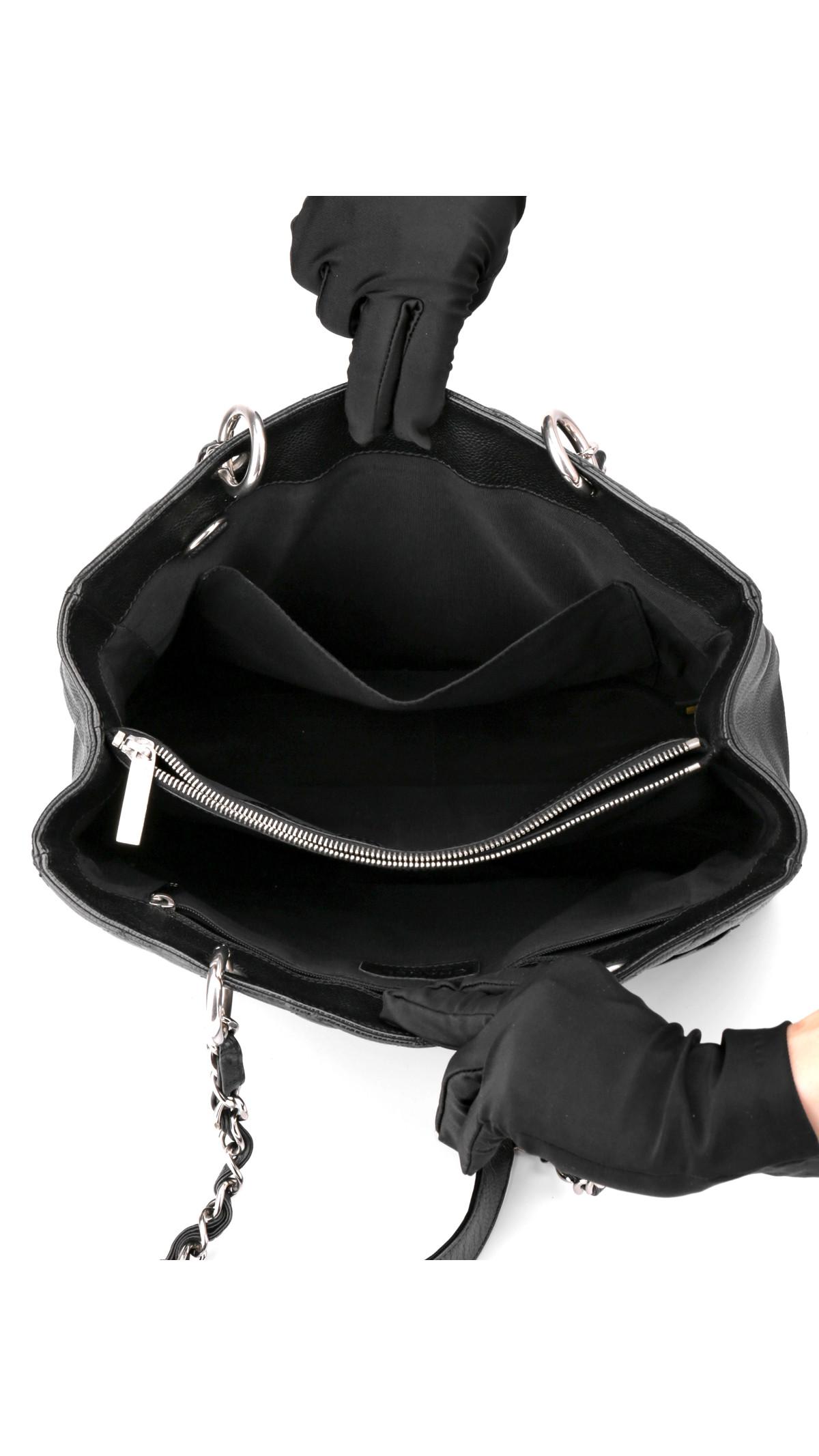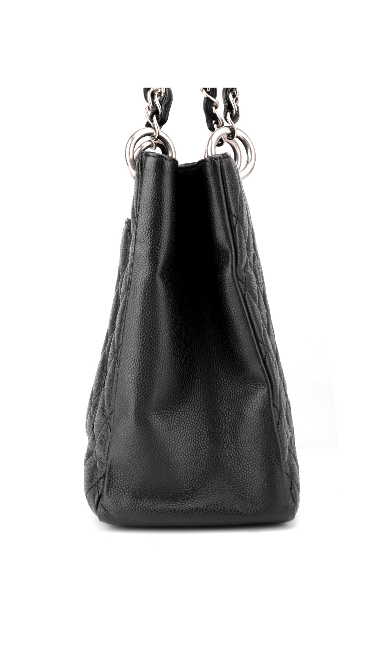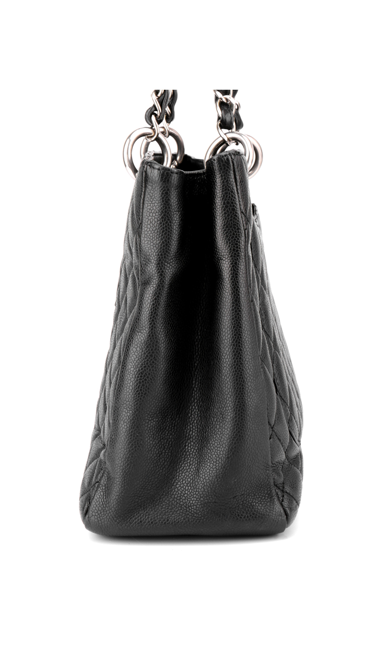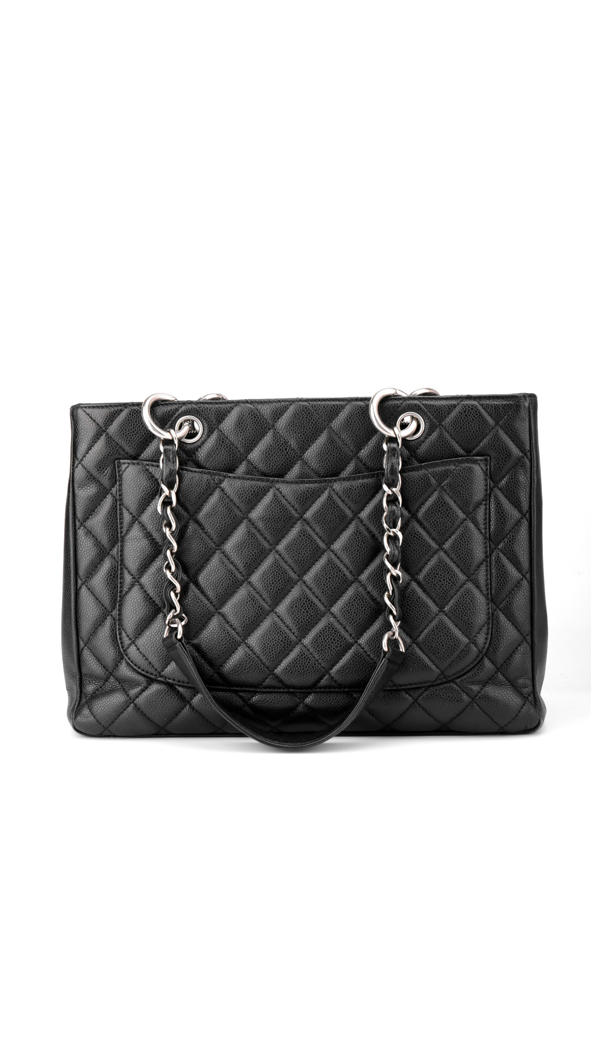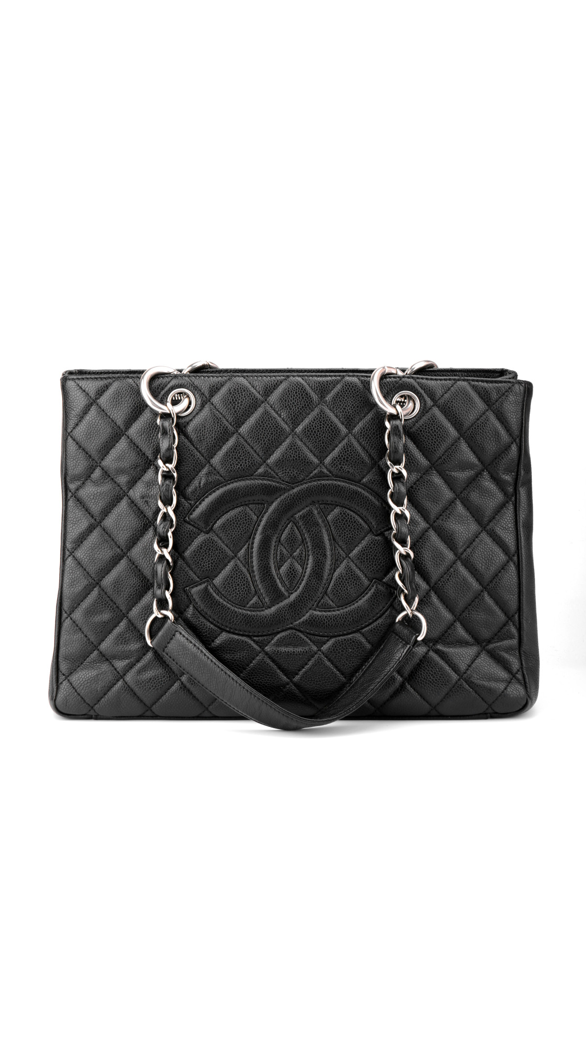 Chanel Grand Shopping Tote, ofte kalt GST, er en av merkets mest ettertraktede tote-vesker. Denne modellen er utført i sort caviar-lær med det ikoniske quiltede mønsteret og en stor CC-logo på fronten. Vesken er utstyrt med sølvfarget metallhardware og de klassiske doble kjedehåndtakene med lærfletting, som gjør den både robust og elegant.