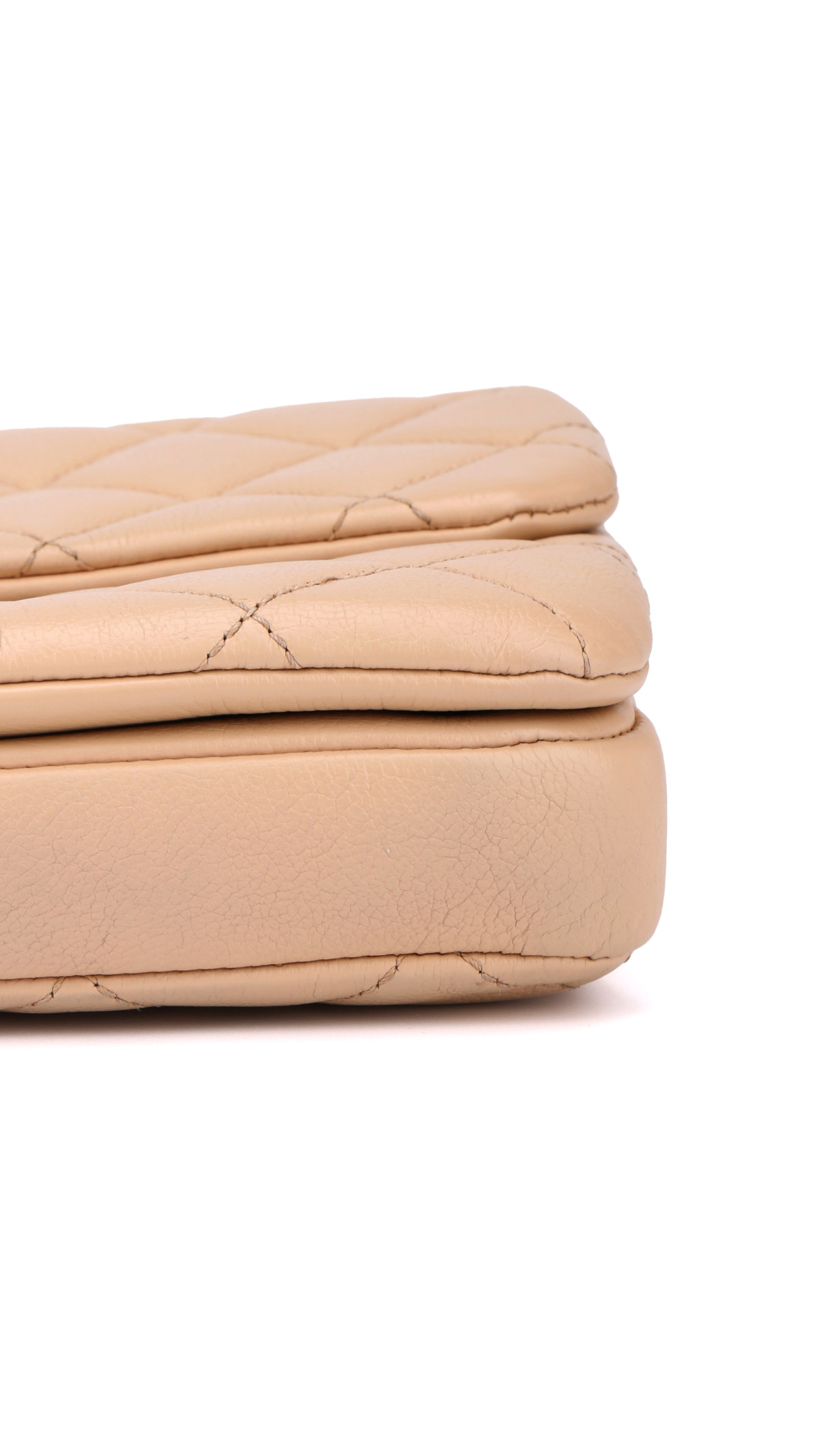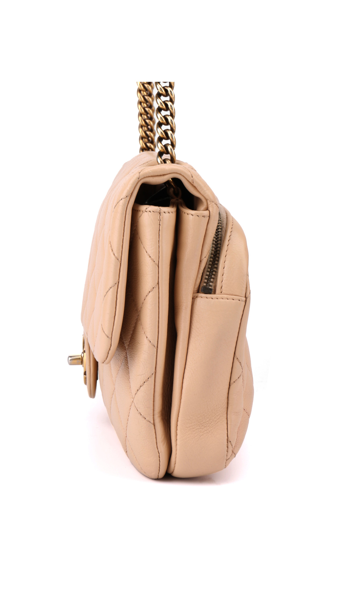 Denne modellen er laget i mykt beige calfskinn med det klassiske quiltede mønsteret, utsmykket med gullfarget metallhardware og den ikoniske CC-turnlock-låsen.