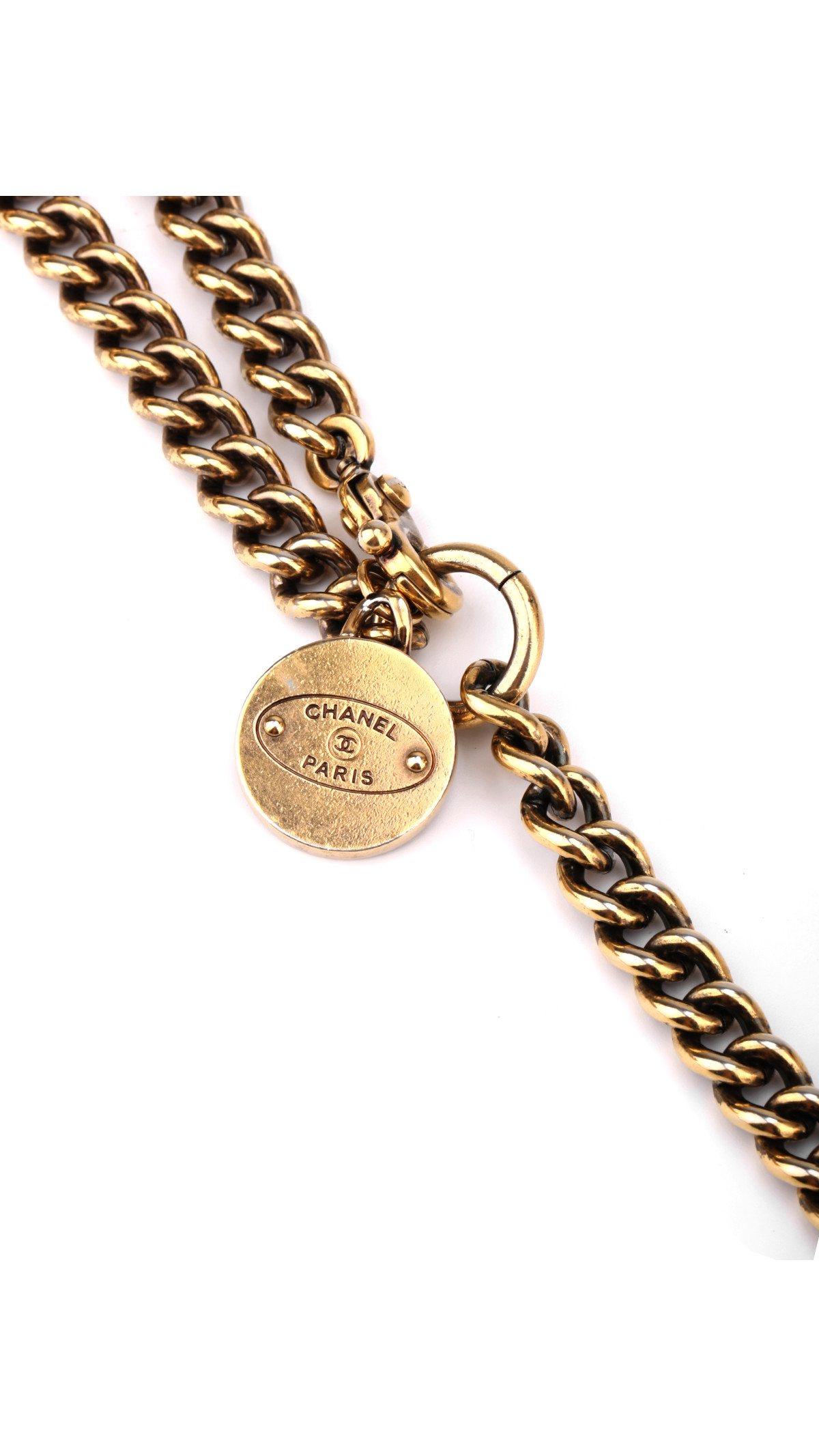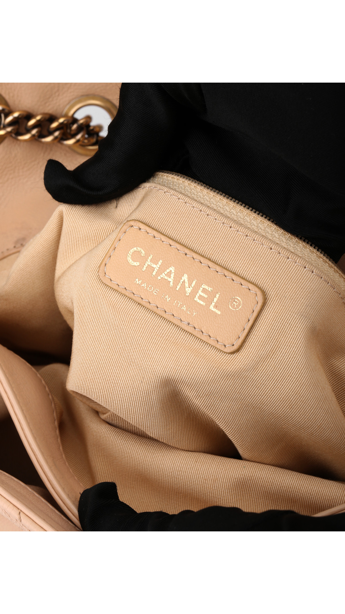Vesken har den karakteristiske doble klaffen som gir ekstra sikkerhet og bevarer den sofistikerte strukturen. Interiøret er foret i beige skinn og byr på flere lommer, inkludert en glidelåslomme, perfekt for organisering. Den ikoniske kjedestroppen med lærfletting kan bæres både enkelt og dobbelt over skulderen.