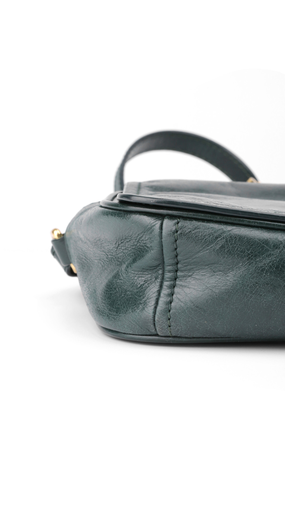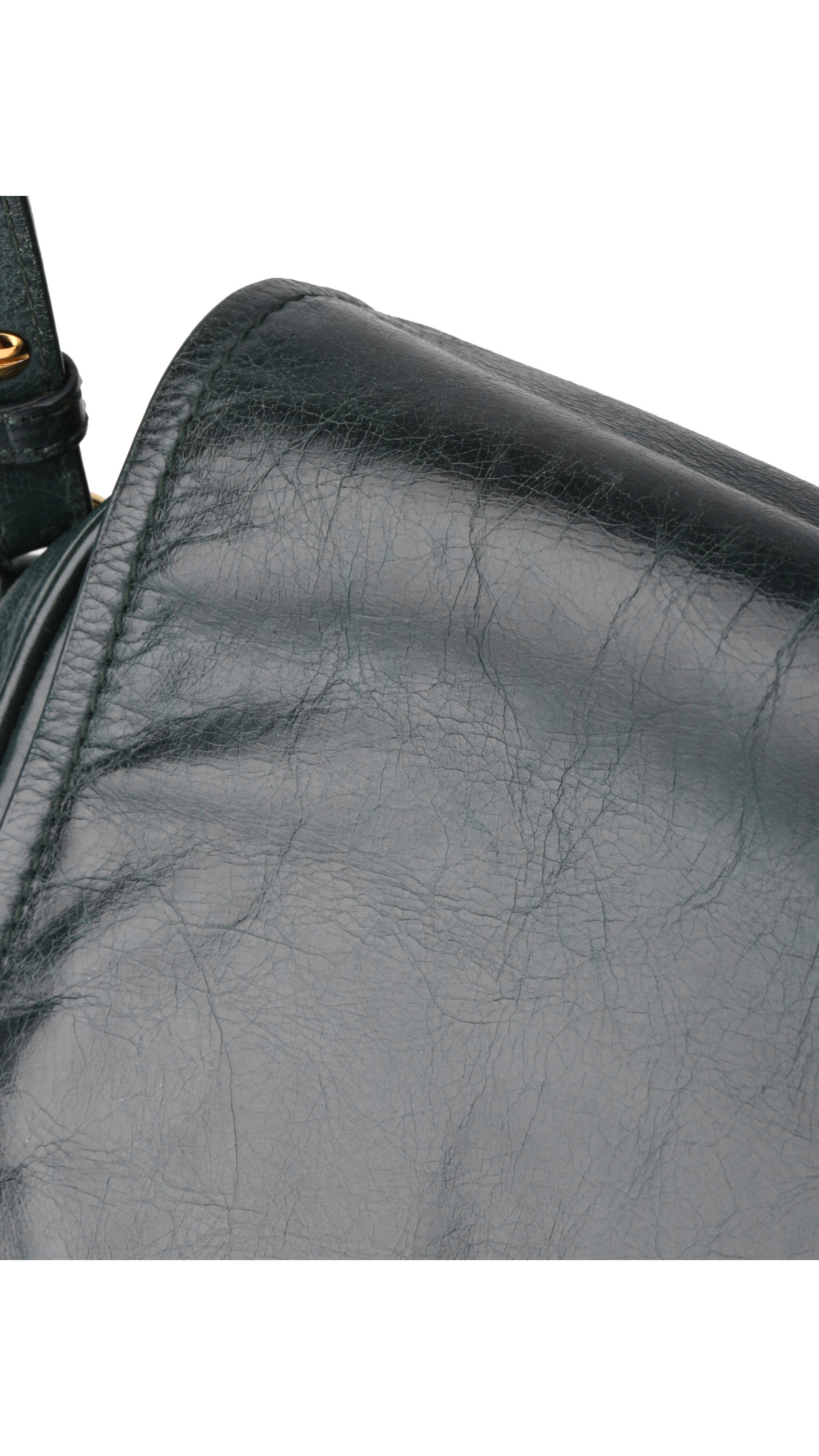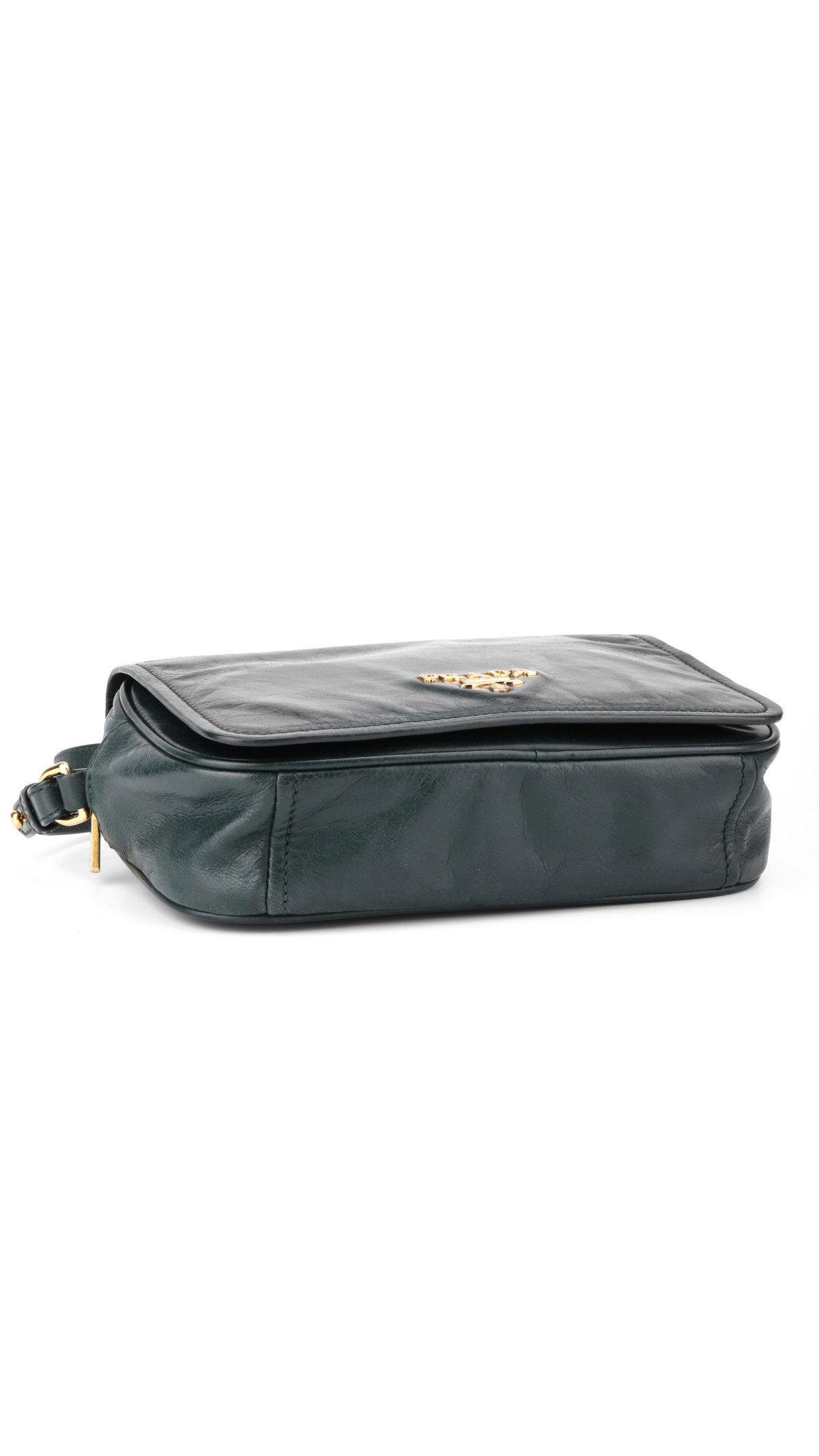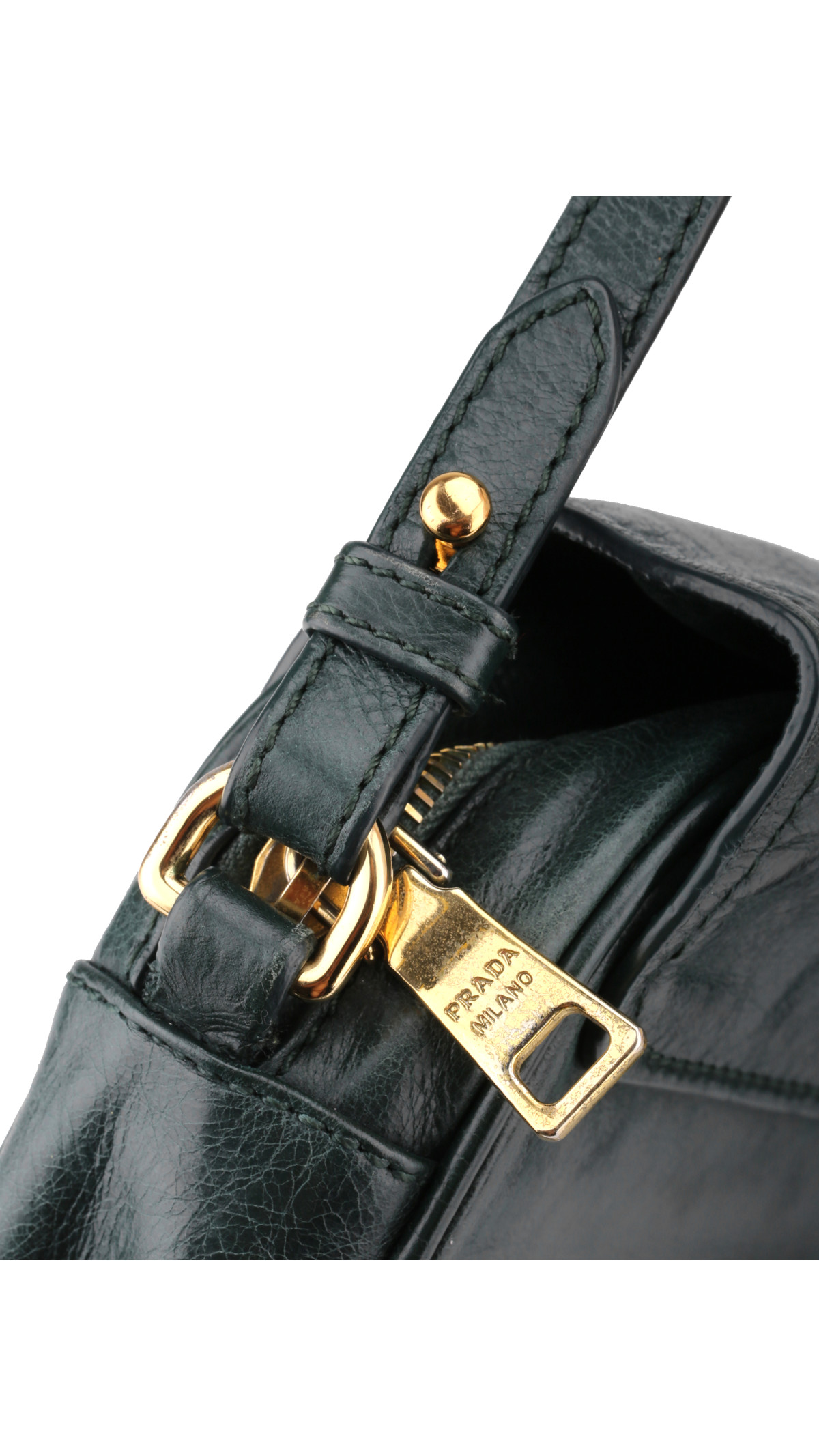 Denne klassiske crossbody-vesken fra Prada kombinerer avslappet eleganse med funksjonell design. Utført i mykt, krakelert skinn i en dyp mørkegrønn tone, har vesken et subtilt, luksuriøst uttrykk som gjør den perfekt til både hverdag og kveldsbruk.