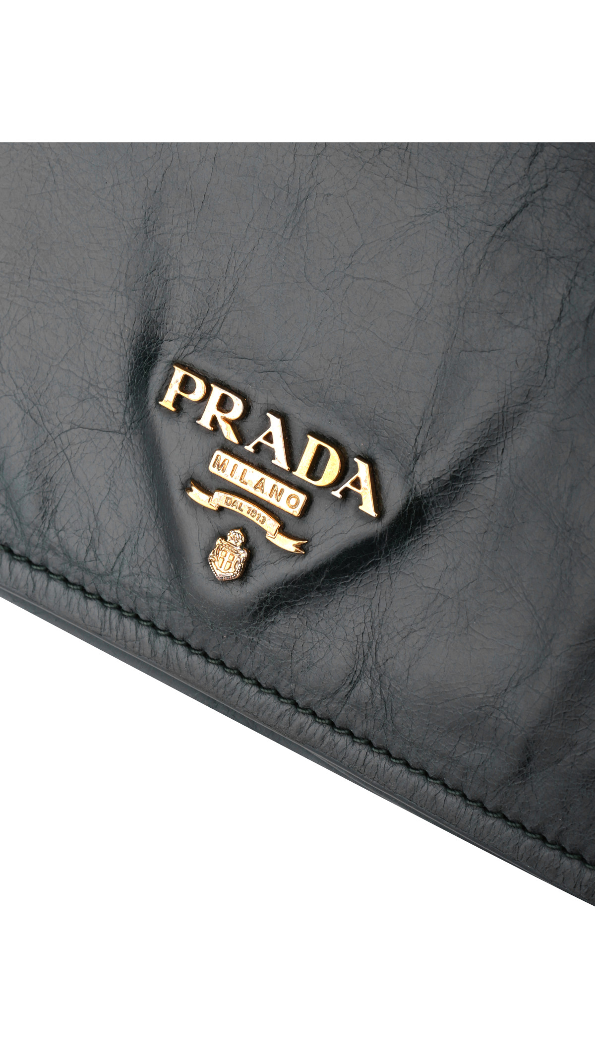 Fronten prydes av det ikoniske Prada-logoet i gullfarget metall, som gir en sofistikert kontrast mot det mørke skinnet. Vesken åpnes med magnetisk klaff og har et romslig hovedrom med praktiske innerlommer for organisering av småting. Den justerbare skulderstroppen gjør det enkelt å bære vesken komfortabelt over skulderen eller crossbody.