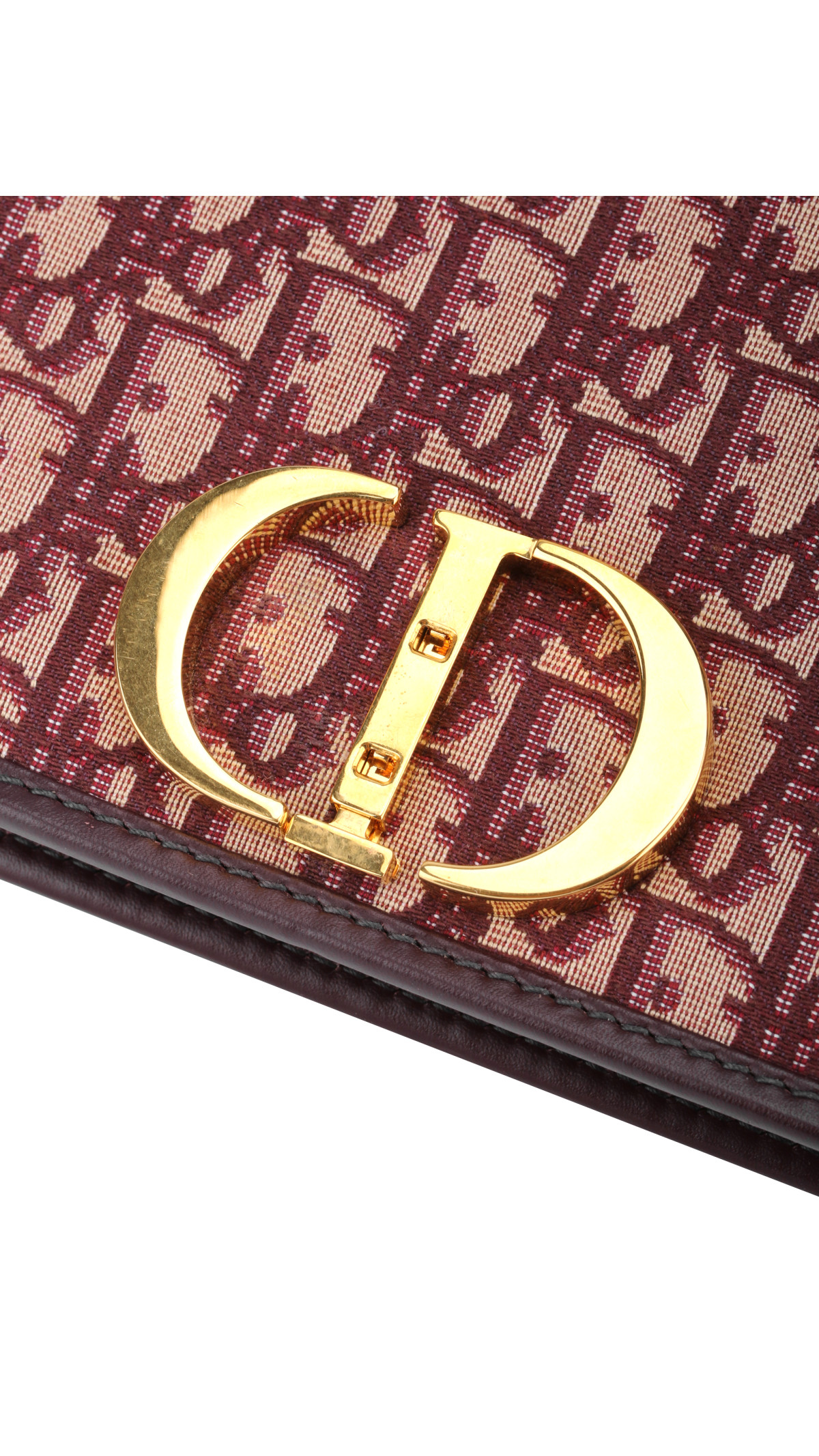 Dior 30 Montaigne-vesken er et uttrykk for merkets raffinerte eleganse og tidløse design. Denne modellen er utført i signaturens burgunder Dior Oblique canvas, kombinert med glatte lærdetaljer i matchende nyanse. Den ikoniske “CD”-spennen i gullfarget metall gir vesken et luksuriøst og umiddelbart gjenkjennelig preg.
