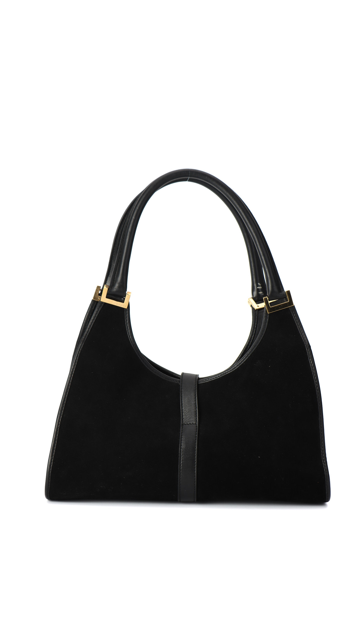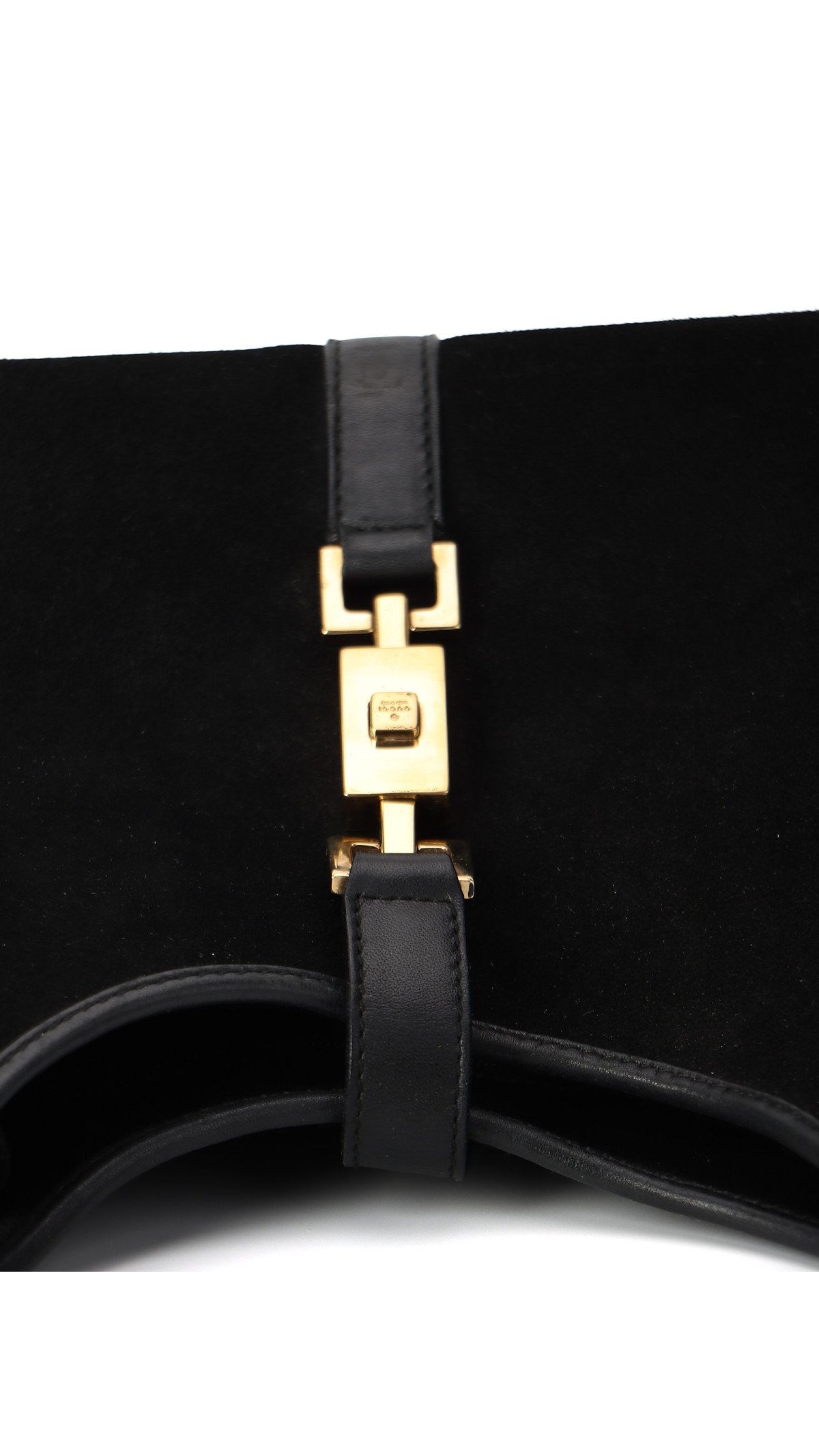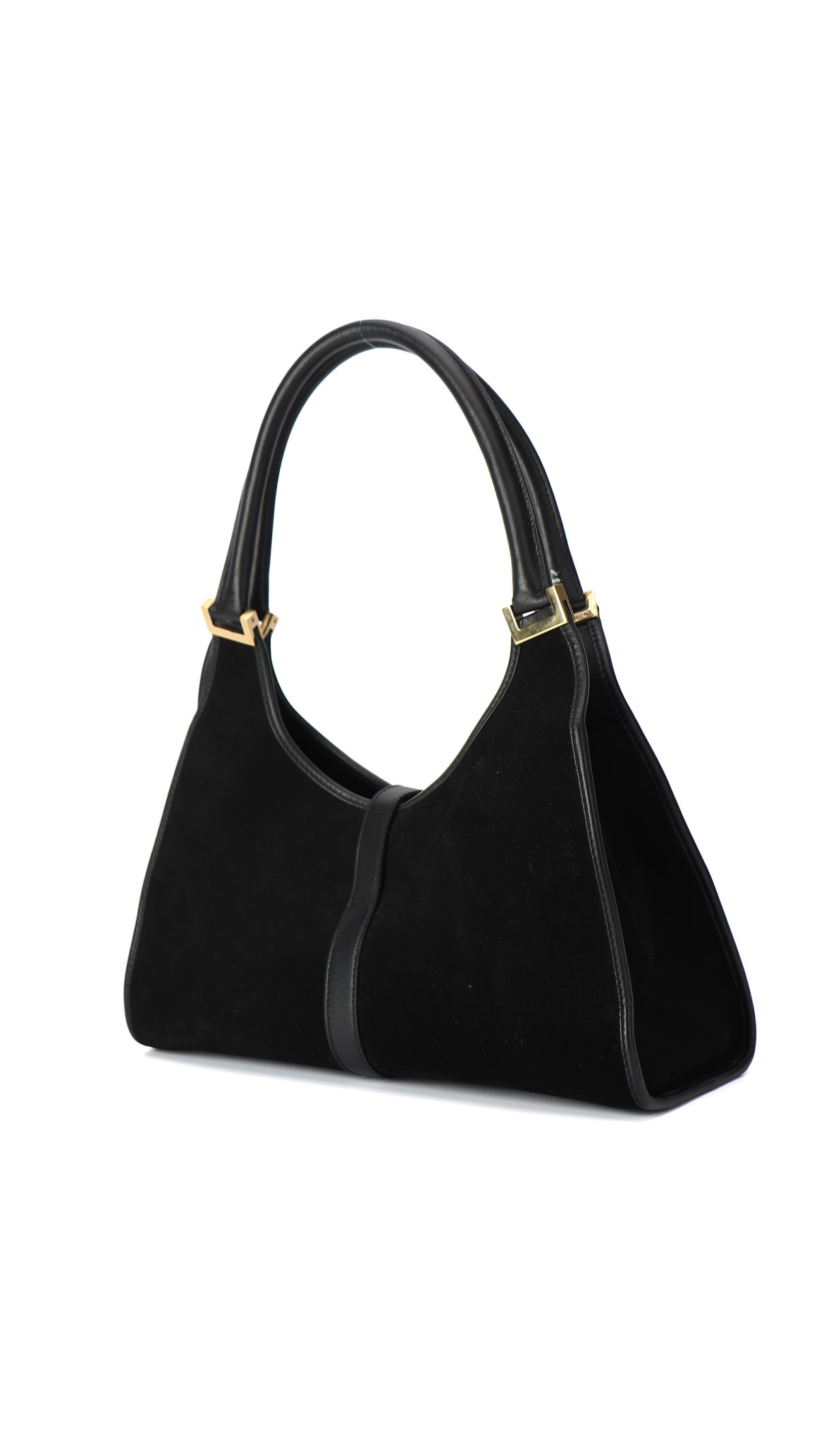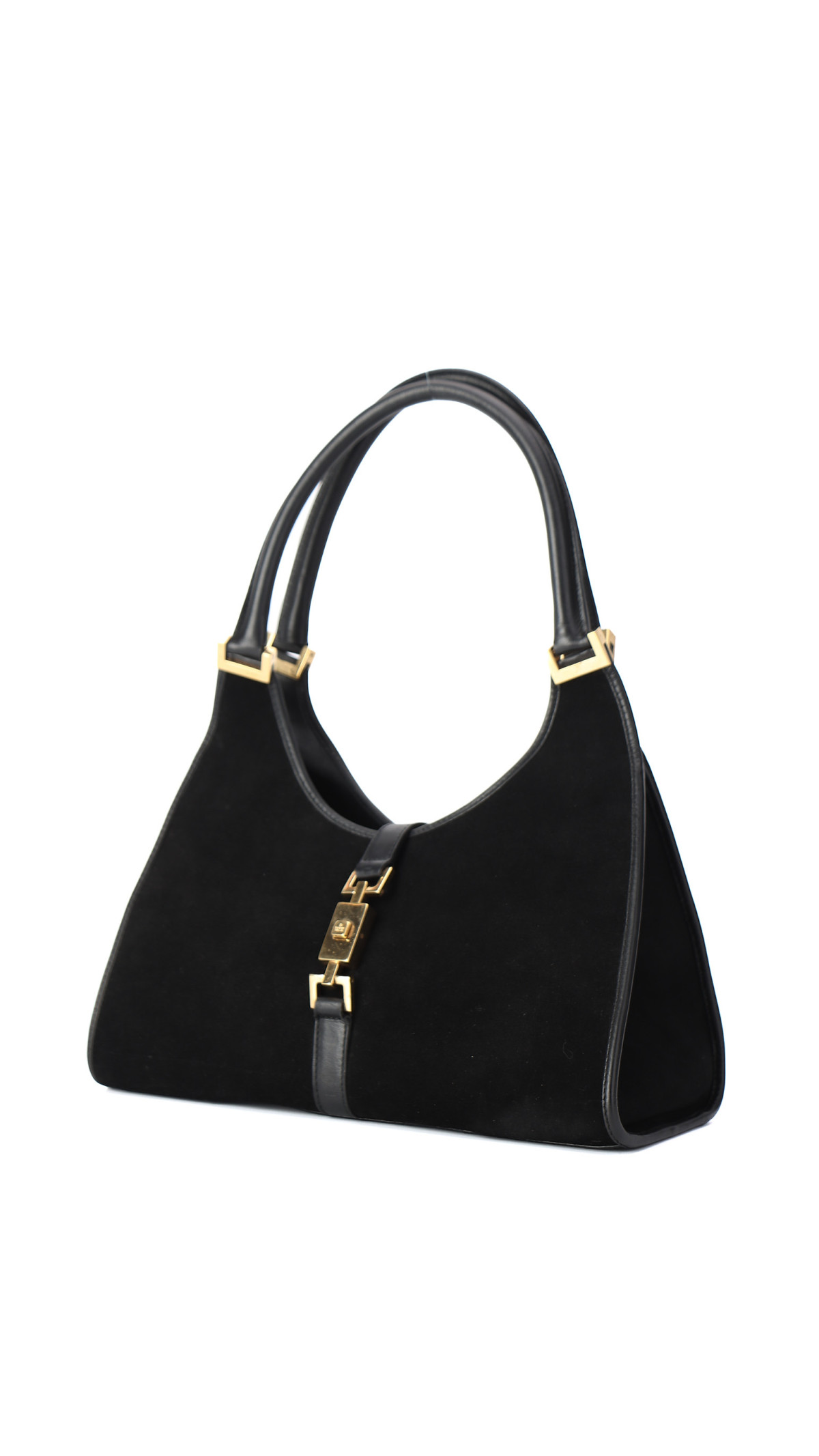 Den klassiske Gucci Jackie er et ikon innen motehistorien, kjent for sin tidløse form og elegante enkelhet. Denne versjonen er laget i mykt svart semsket skinn med kontrasterende detaljer i glatt skinn og gullfarget hardware. Den ikoniske stemplede “piston lock”-låsen i front gir vesken et umiskjennelig preg.