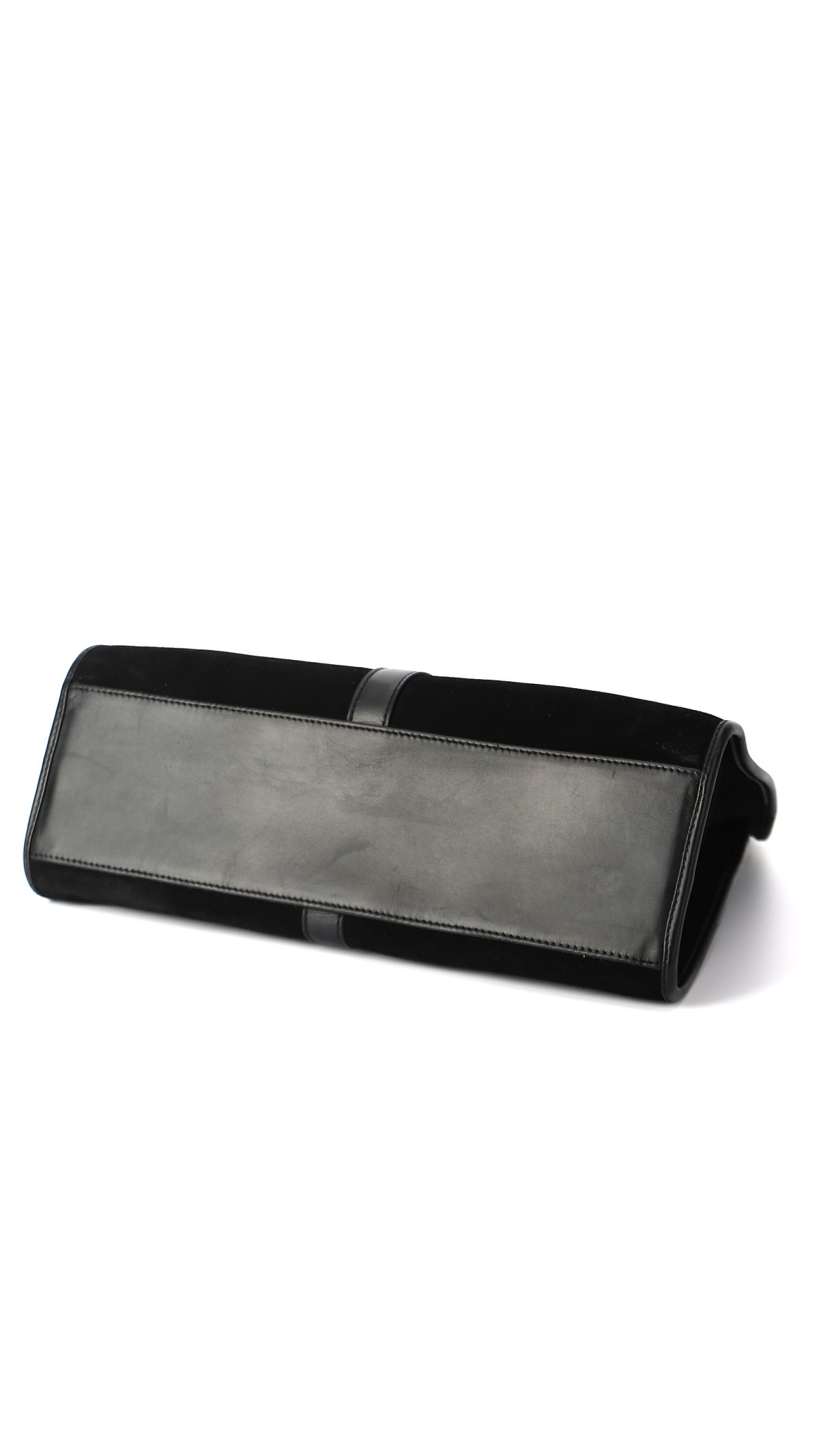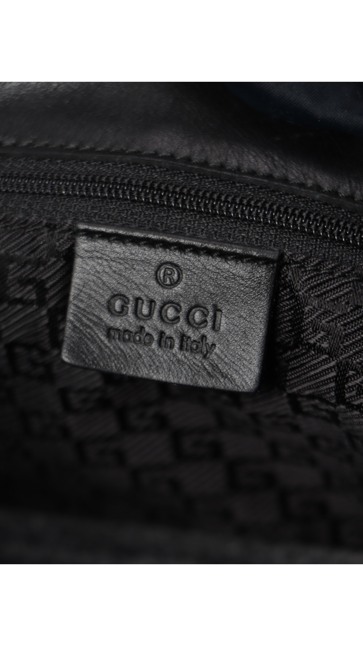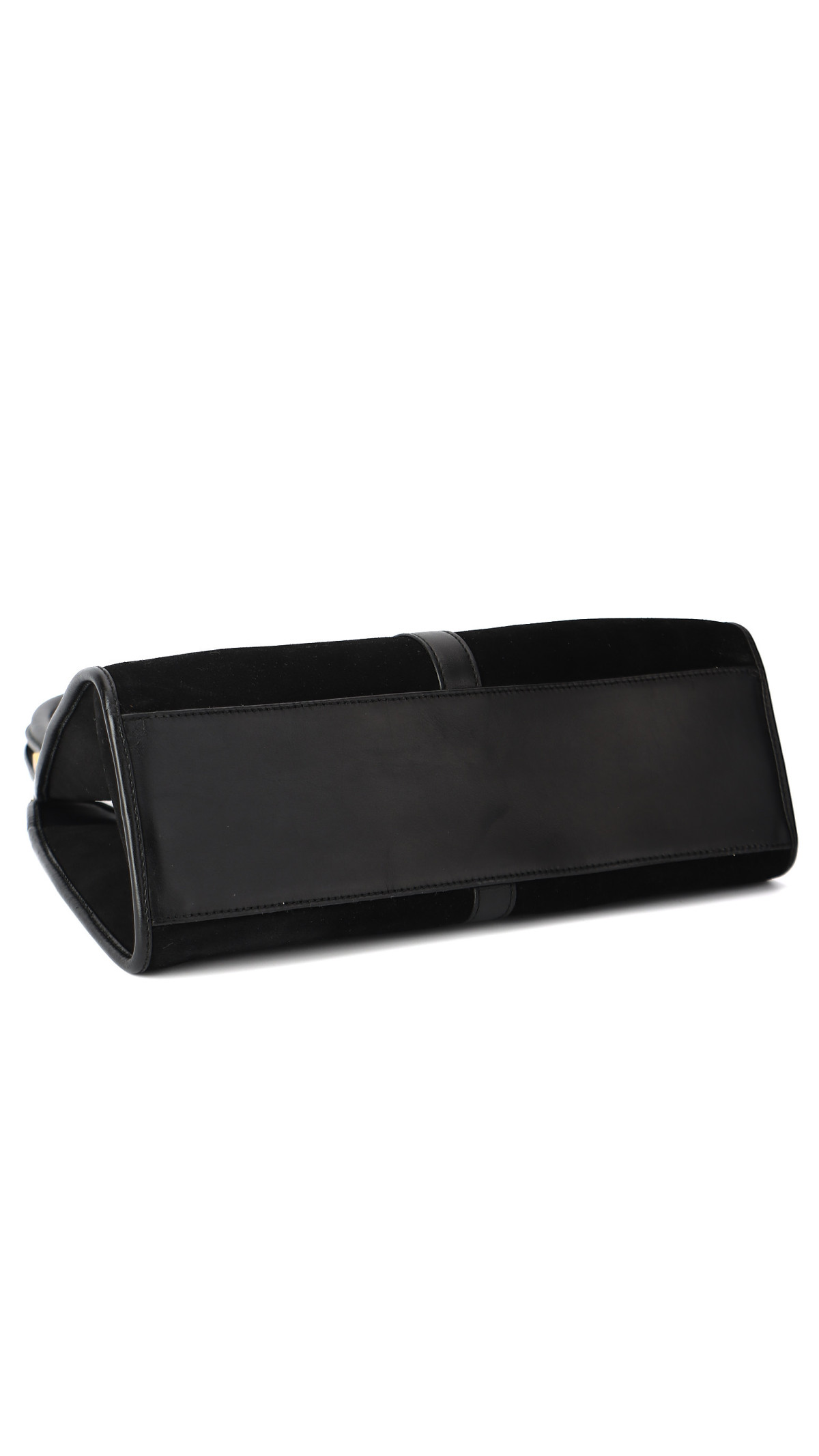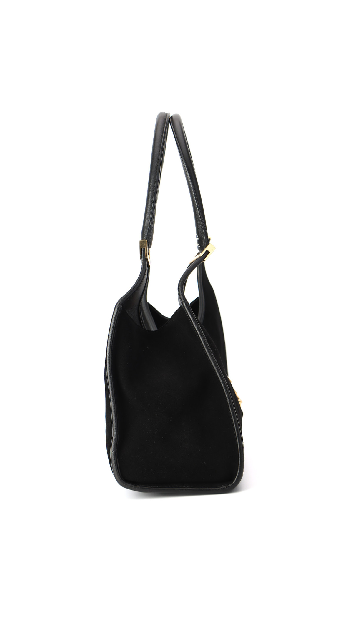 Den klassiske Gucci Jackie er et ikon innen motehistorien, kjent for sin tidløse form og elegante enkelhet. Denne versjonen er laget i mykt svart semsket skinn med kontrasterende detaljer i glatt skinn og gullfarget hardware. Den ikoniske stemplede “piston lock”-låsen i front gir vesken et umiskjennelig preg.