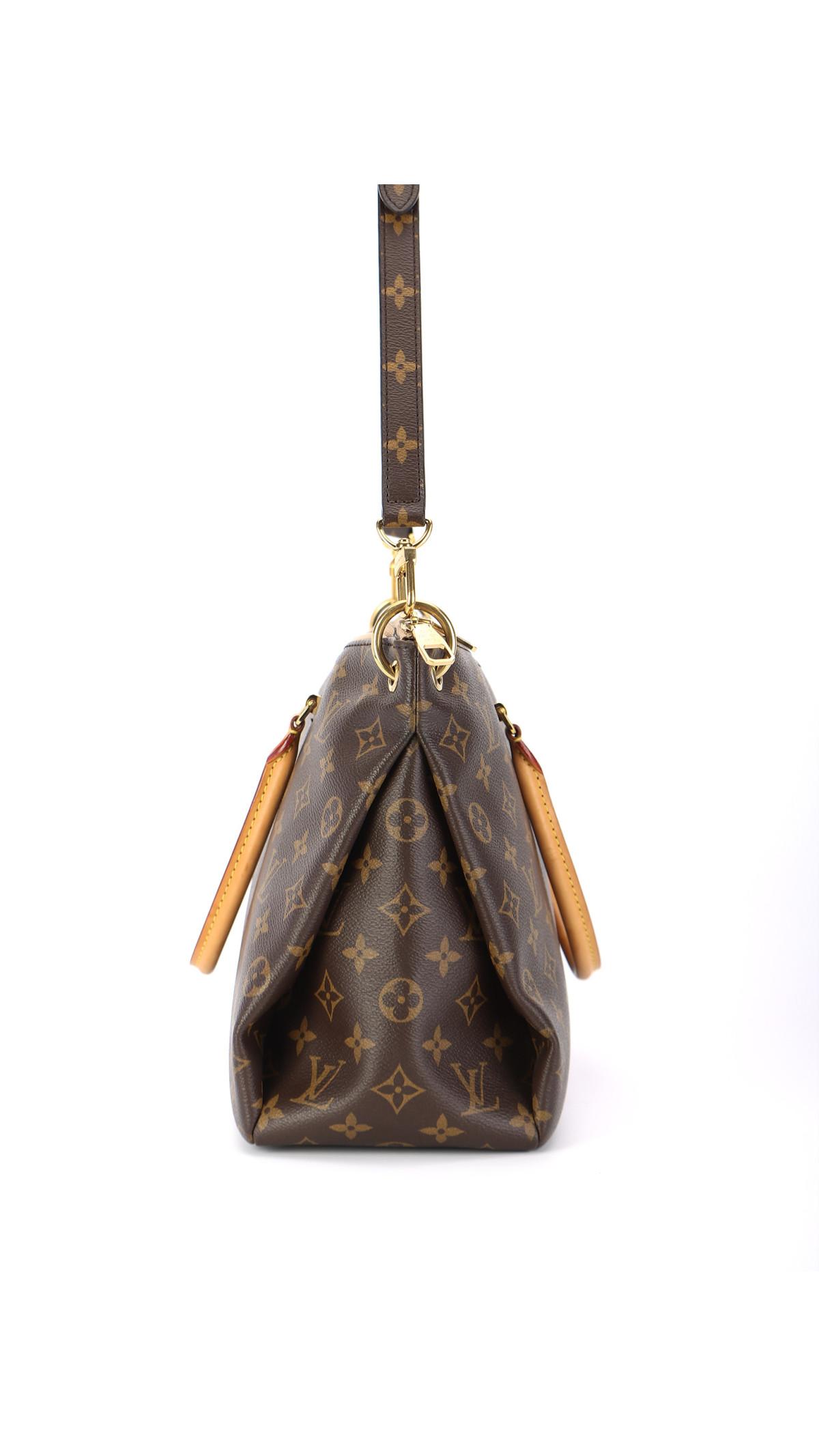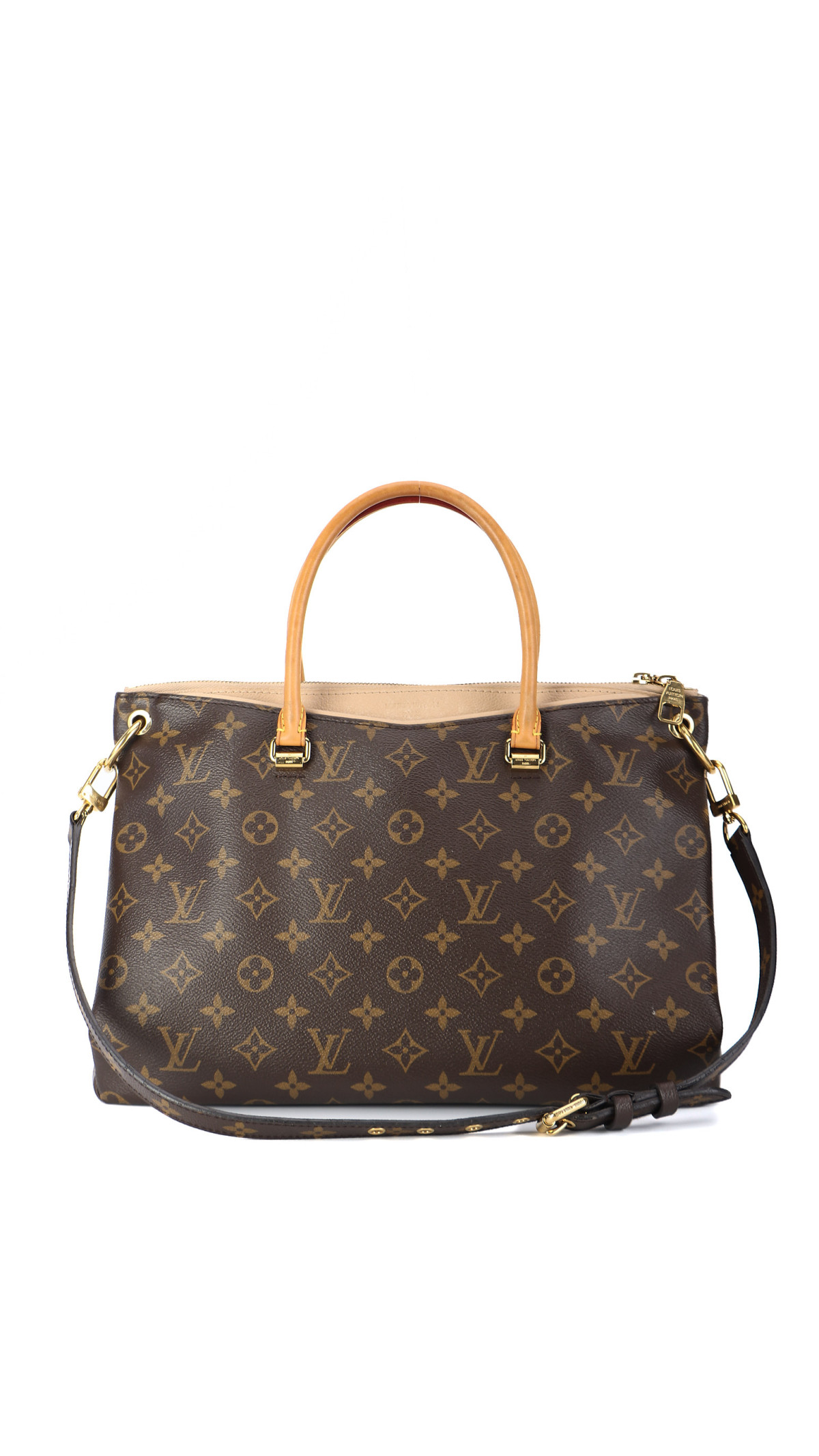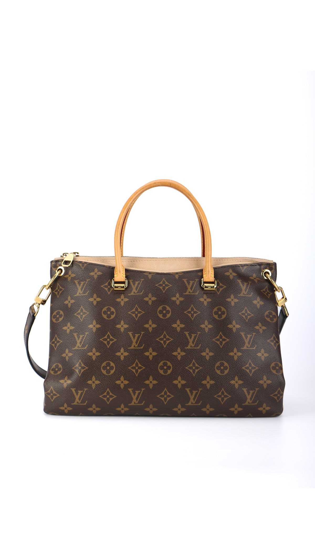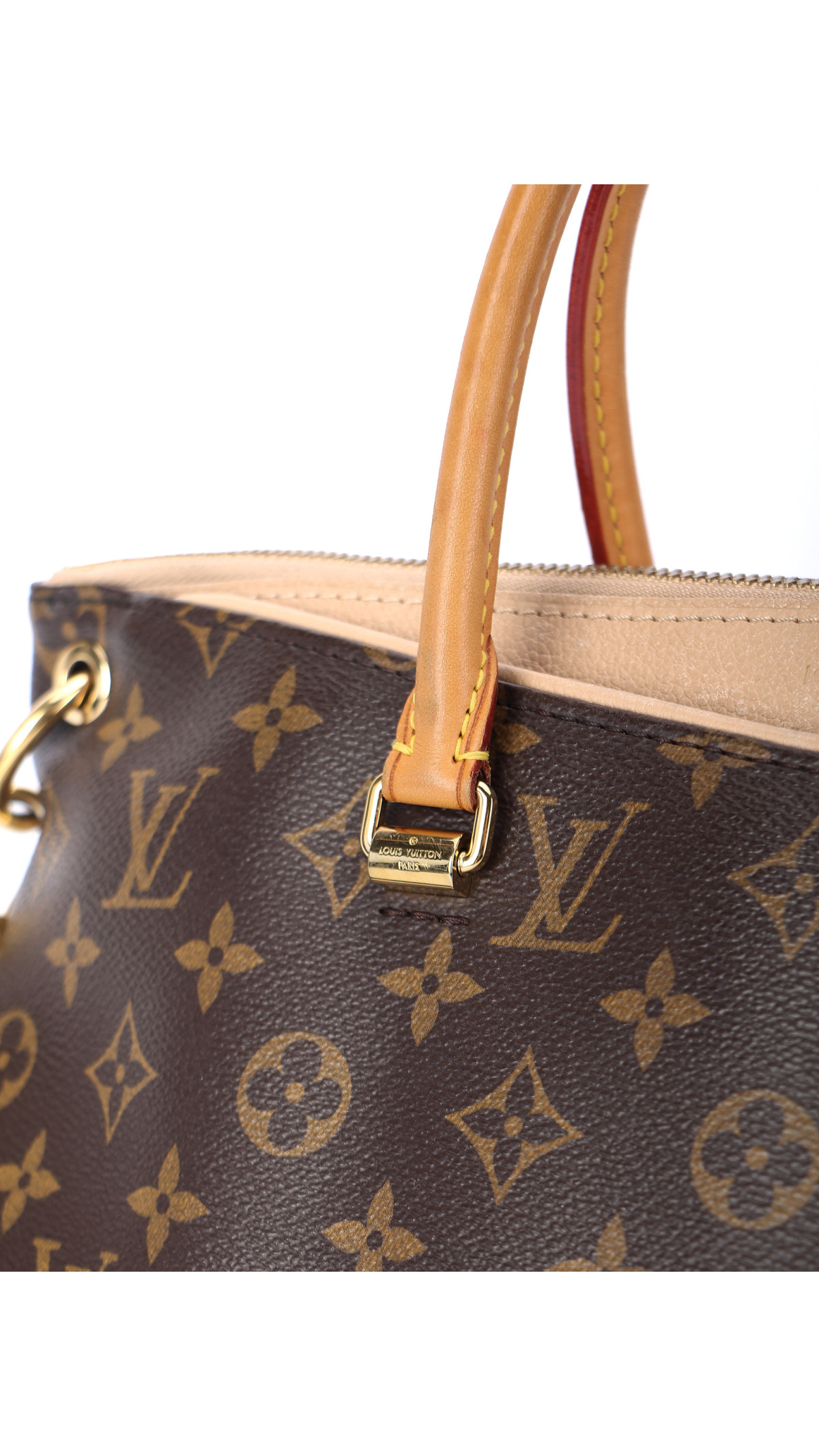 Louis Vuitton Pallas MM kombinerer strukturert eleganse med smart funksjonalitet. Modellen er utført i ikonisk Monogram canvas med kontrasterende innsatser i lysebeige Dune-skinn langs toppkanten og håndtaksfestene. De runde topphåndtakene i naturfarget skinn og gullfargede beslag gir vesken et klassisk LV-uttrykk.