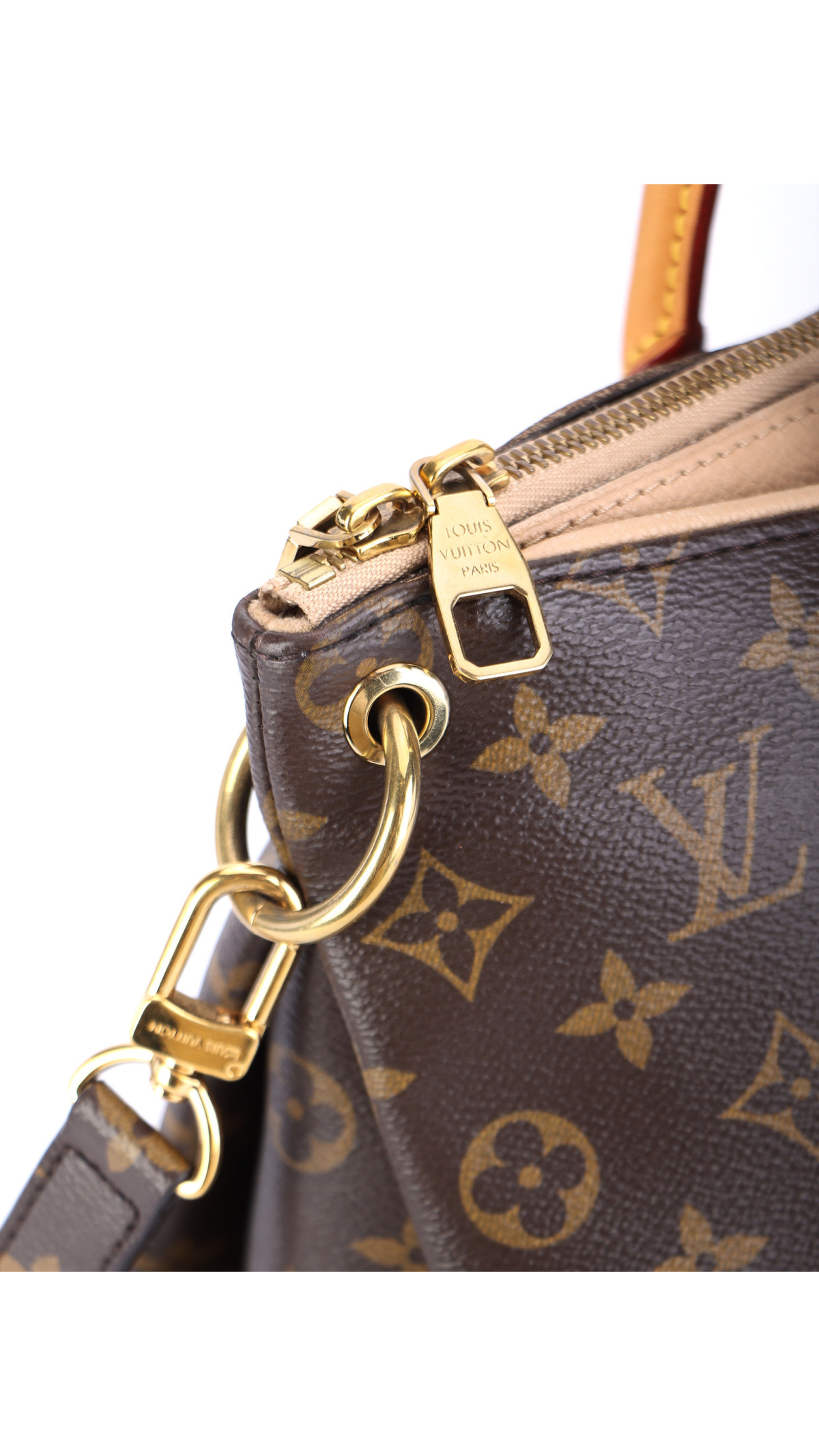 Vesken har et praktisk tredelt oppsett: et romslig hovedrom med glidelås i midten, flankert av to magnetiske ytterlommer for rask tilgang. Den leveres med en avtagbar, justerbar skulderstropp i Monogram canvas for komfortabel bæring over skulderen eller crossbody. Innvendig fôr i myk mikrofiber og flere lommer holder eiendelene dine pent organisert.