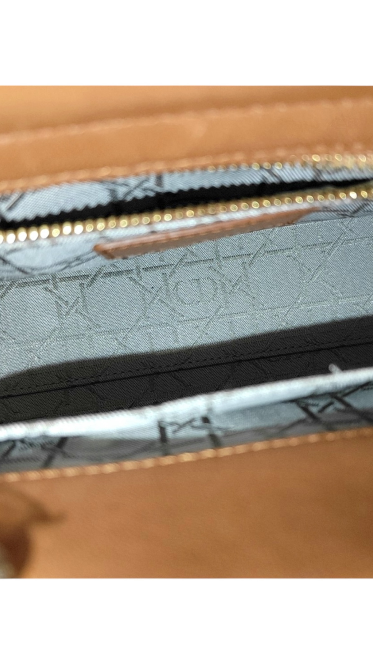 Den kompakte, strukturerte silhuetten kompletteres med topphåndtak og gullfarget hardware, inkludert de ikoniske hengende “D.I.O.R.”-bokstavene som tilfører en luksuriøs signaturdetalj. Interiøret er elegant utformet og rommer det mest nødvendige, mens den avtagbare skulderstroppen gir fleksibilitet til både hånd- og skulderbæring.