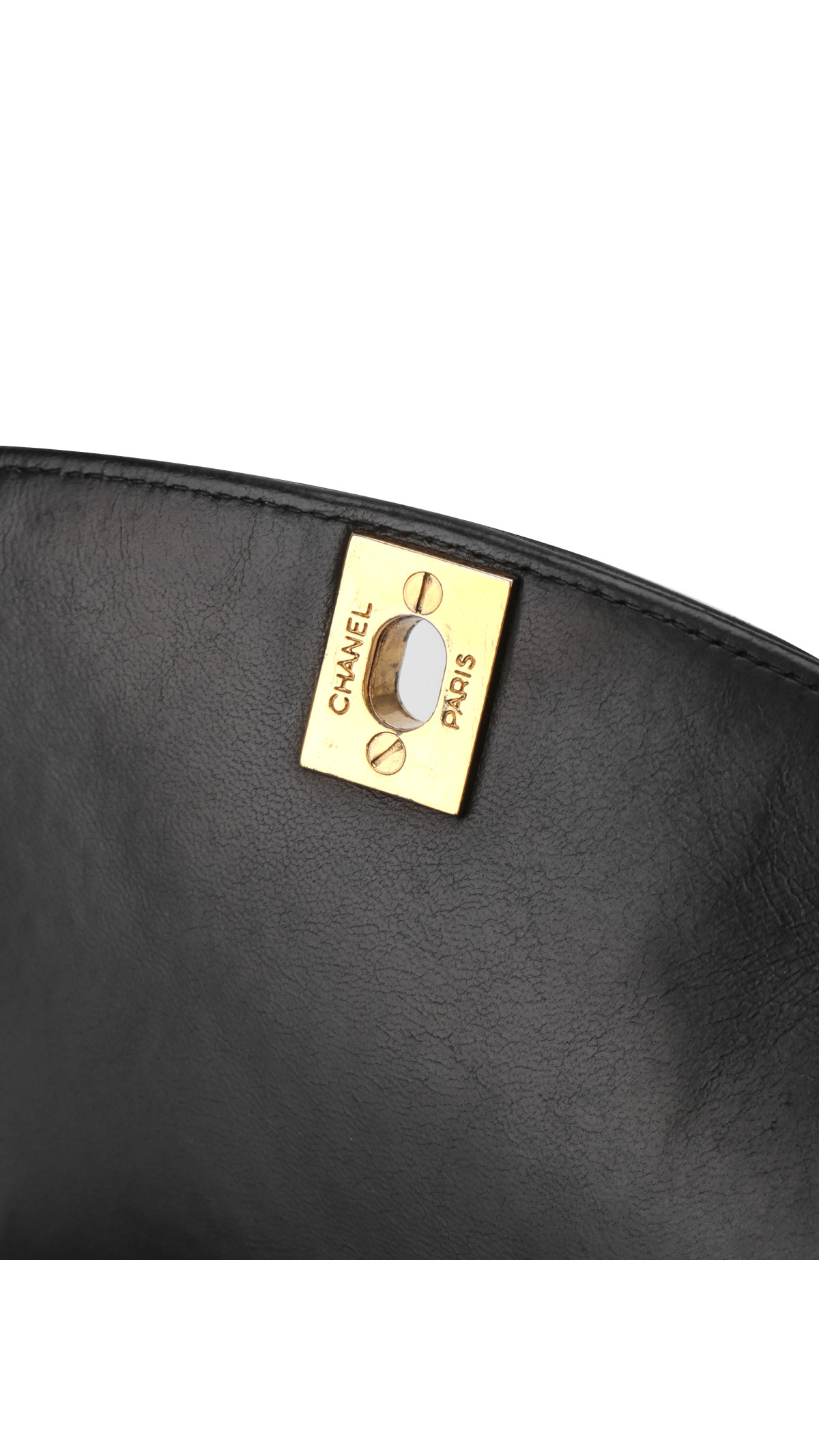 Denne utgaven er utført i mykt svart lammeskinn med den karakteristiske diamant-quiltingen og avrundet klaff, som gir vesken et elegant og feminint uttrykk. Vesken har klassisk vri-lås i gullfarget metall med CC-logo og en kjede-flettet lærstropp som kan bæres på skulderen eller crossbody. Interiøret er foret i burgunderrødt skinn – en detalj som vitner om Chanels luksuriøse håndverkstradisjon.