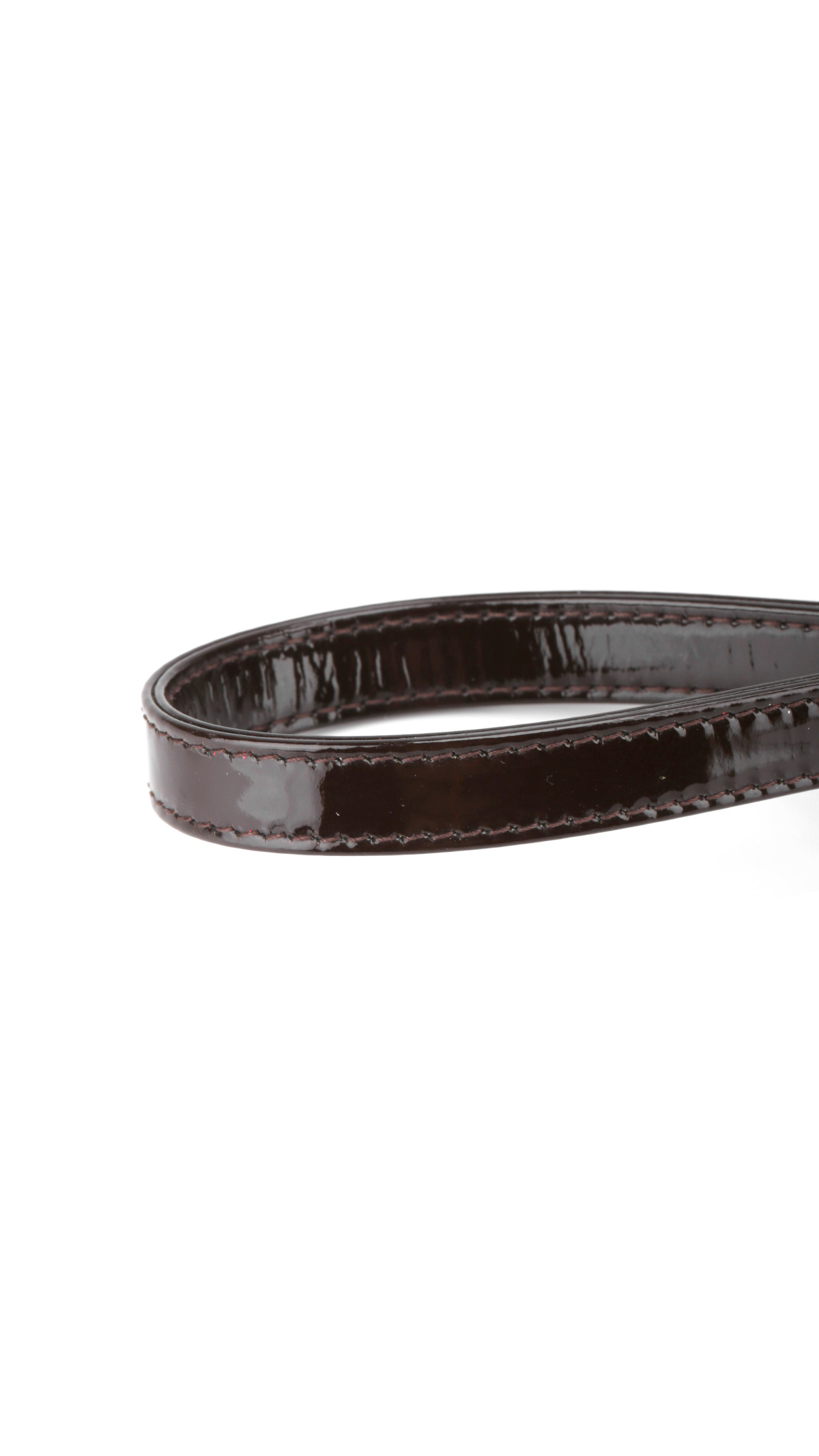 Farge: Mørk brun patent skinn med gullfarget hardware