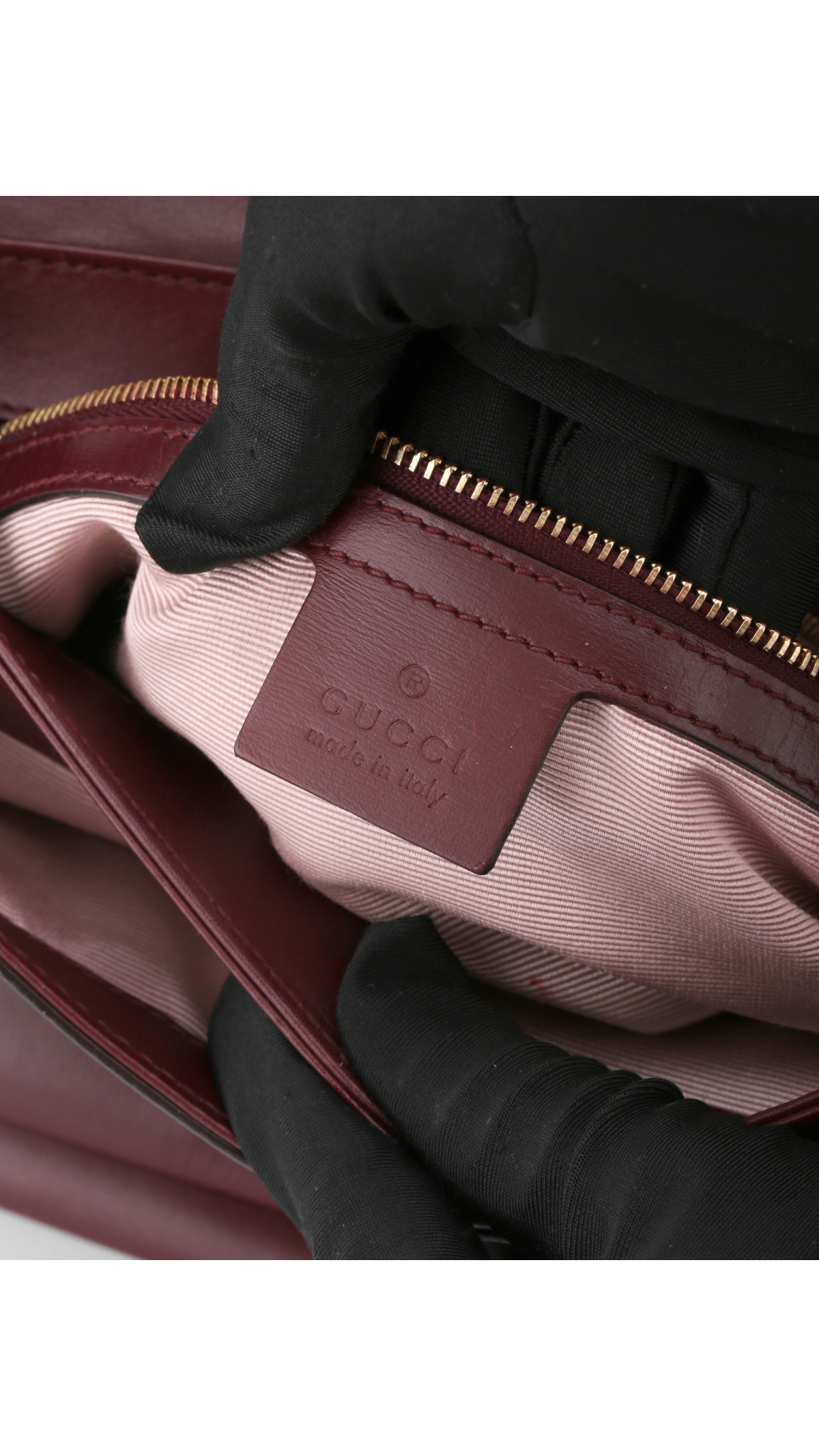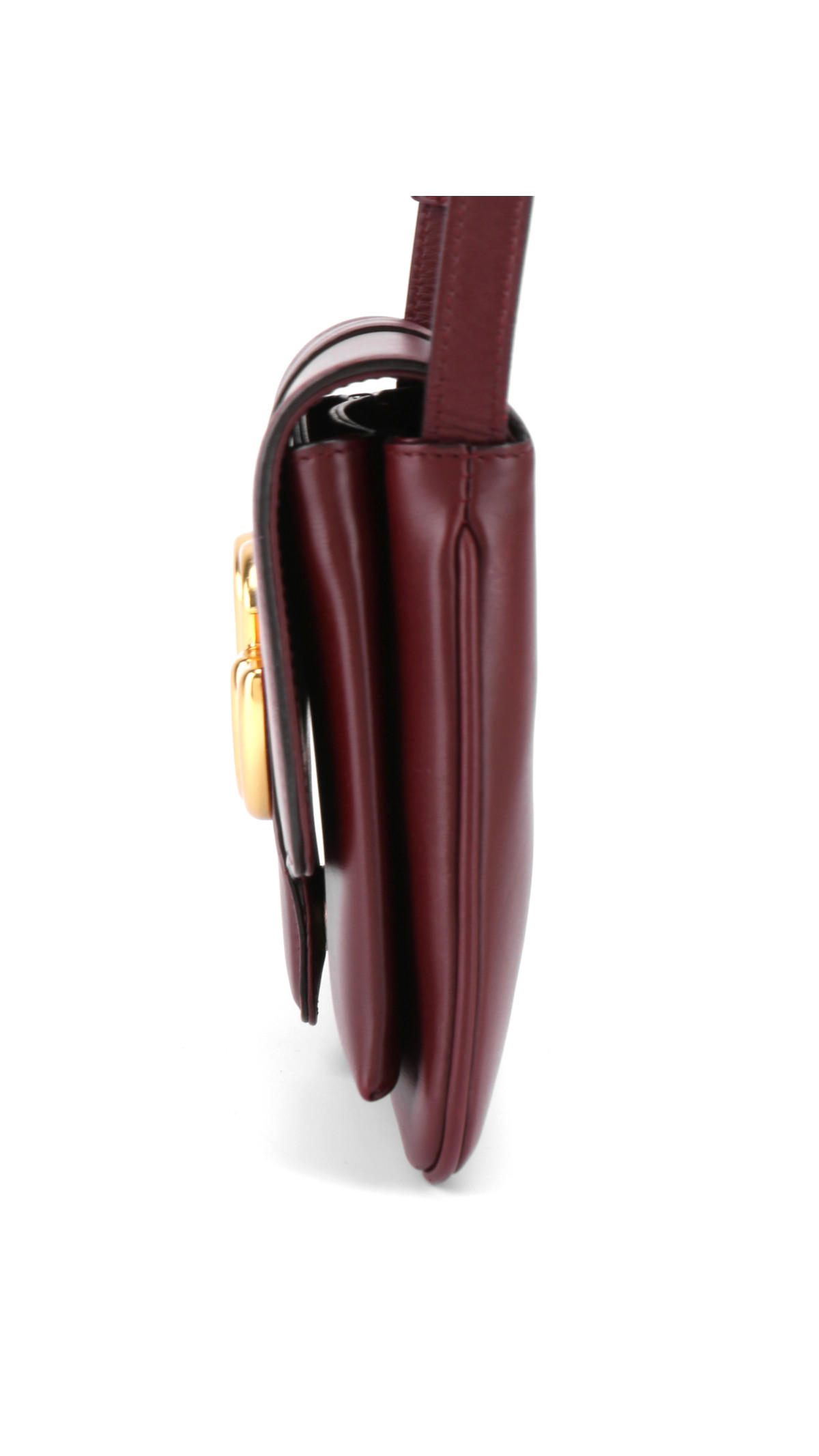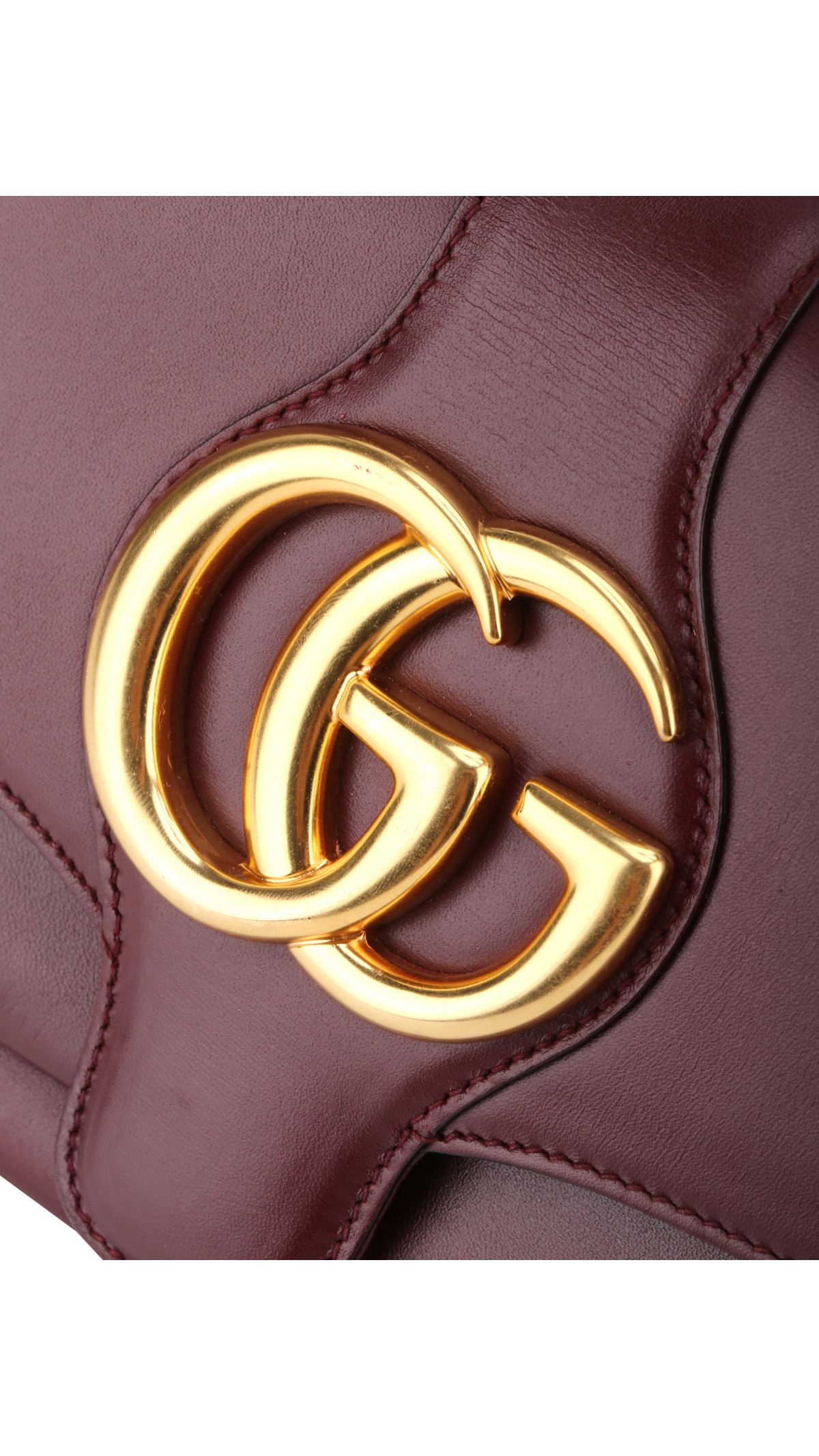 Gucci Arli Small Shoulder Bag kombinerer klassisk eleganse med moderne minimalisme. Modellen er laget av glatt, mykt kalveskinn i en dyp burgunderrød tone, prydet med den ikoniske GG-logoen i antikk gullfinish på frontklaffen.