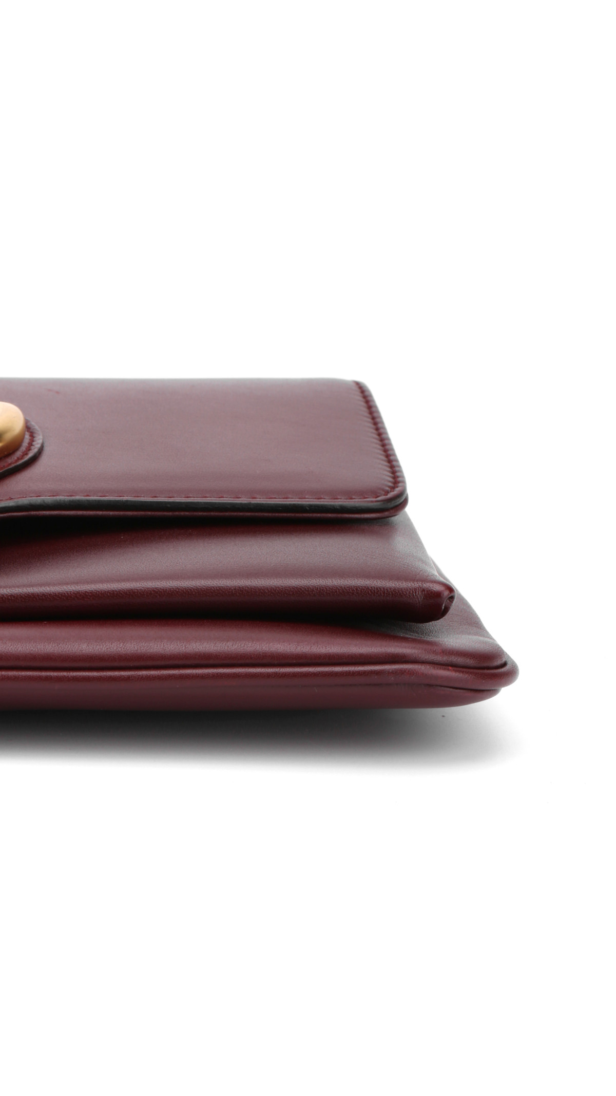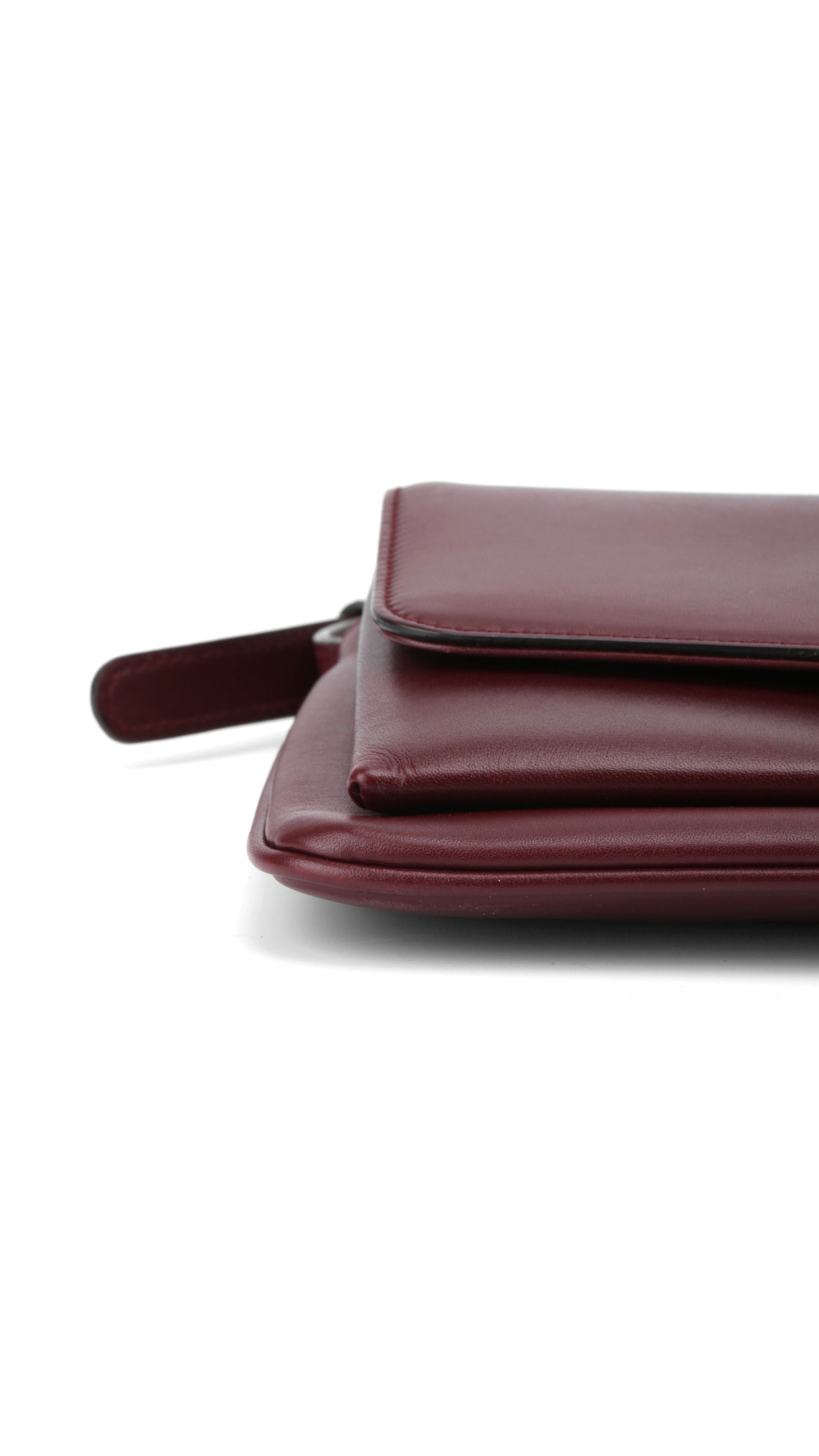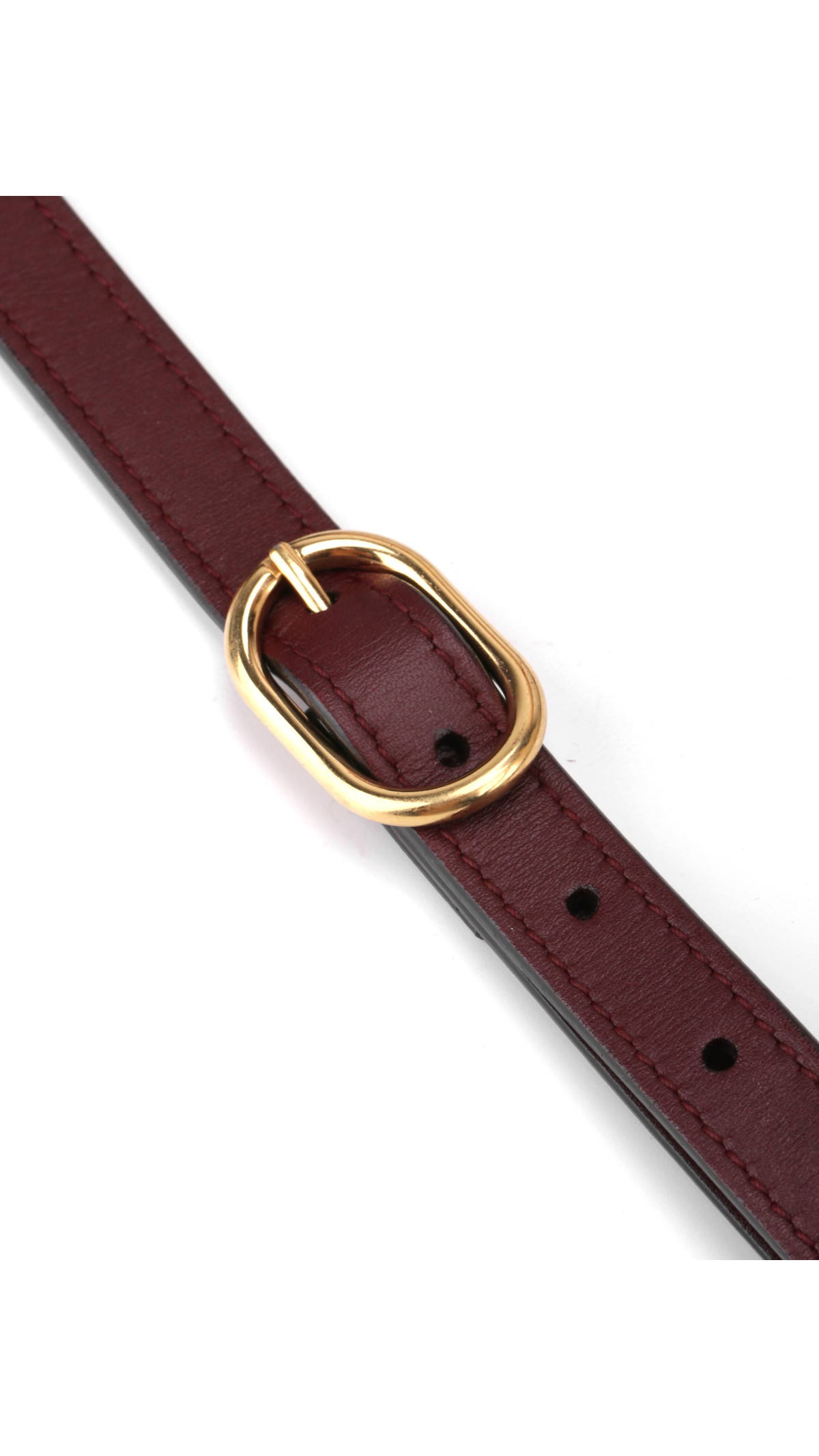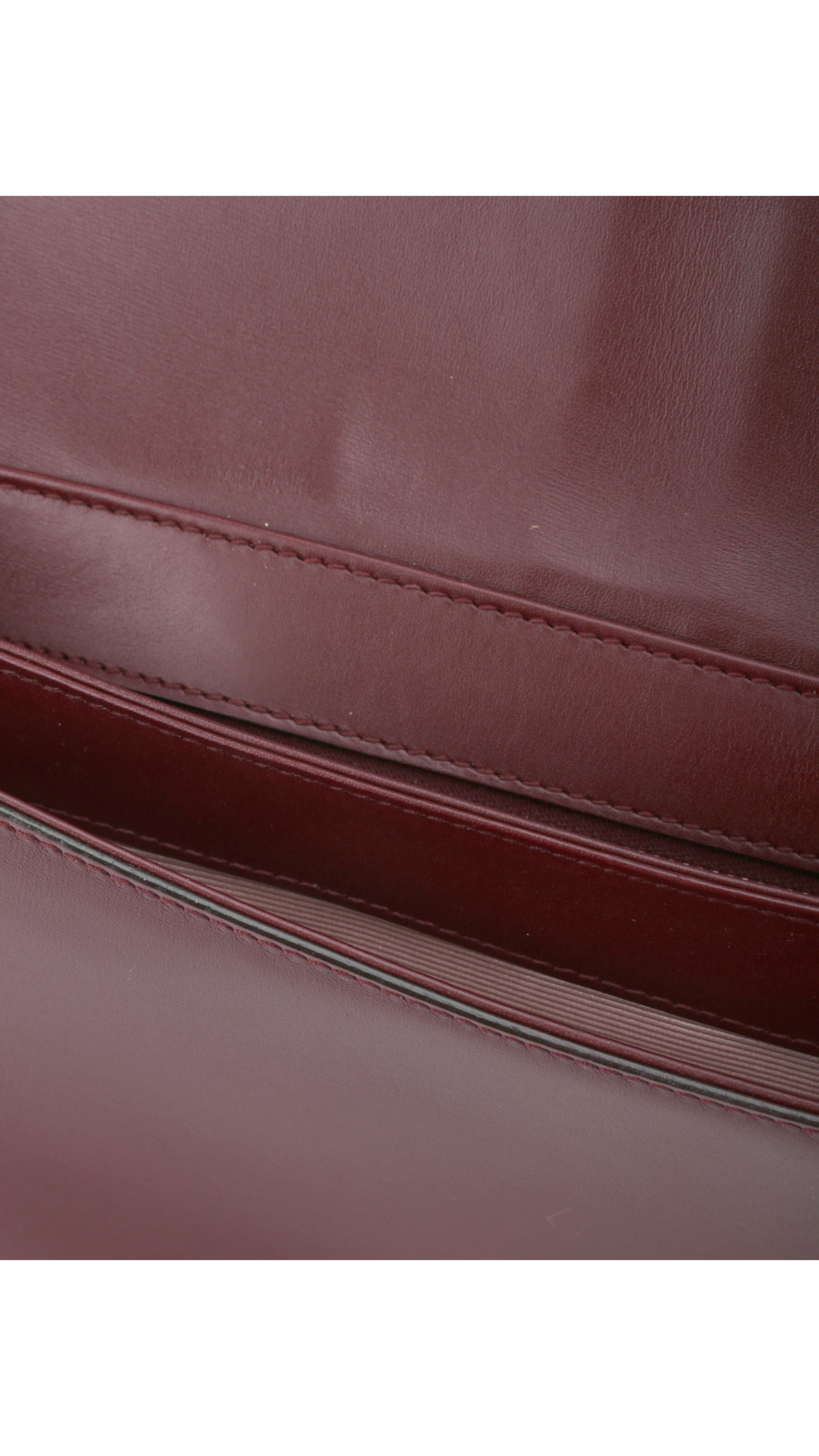 Gucci Arli Small Shoulder Bag kombinerer klassisk eleganse med moderne minimalisme. Modellen er laget av glatt, mykt kalveskinn i en dyp burgunderrød tone, prydet med den ikoniske GG-logoen i antikk gullfinish på frontklaffen.