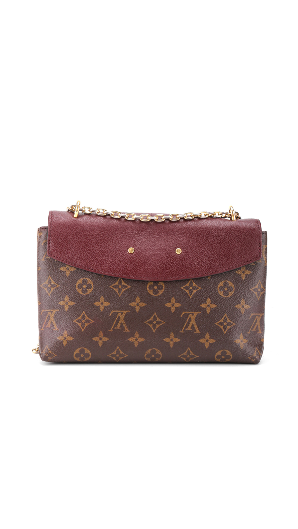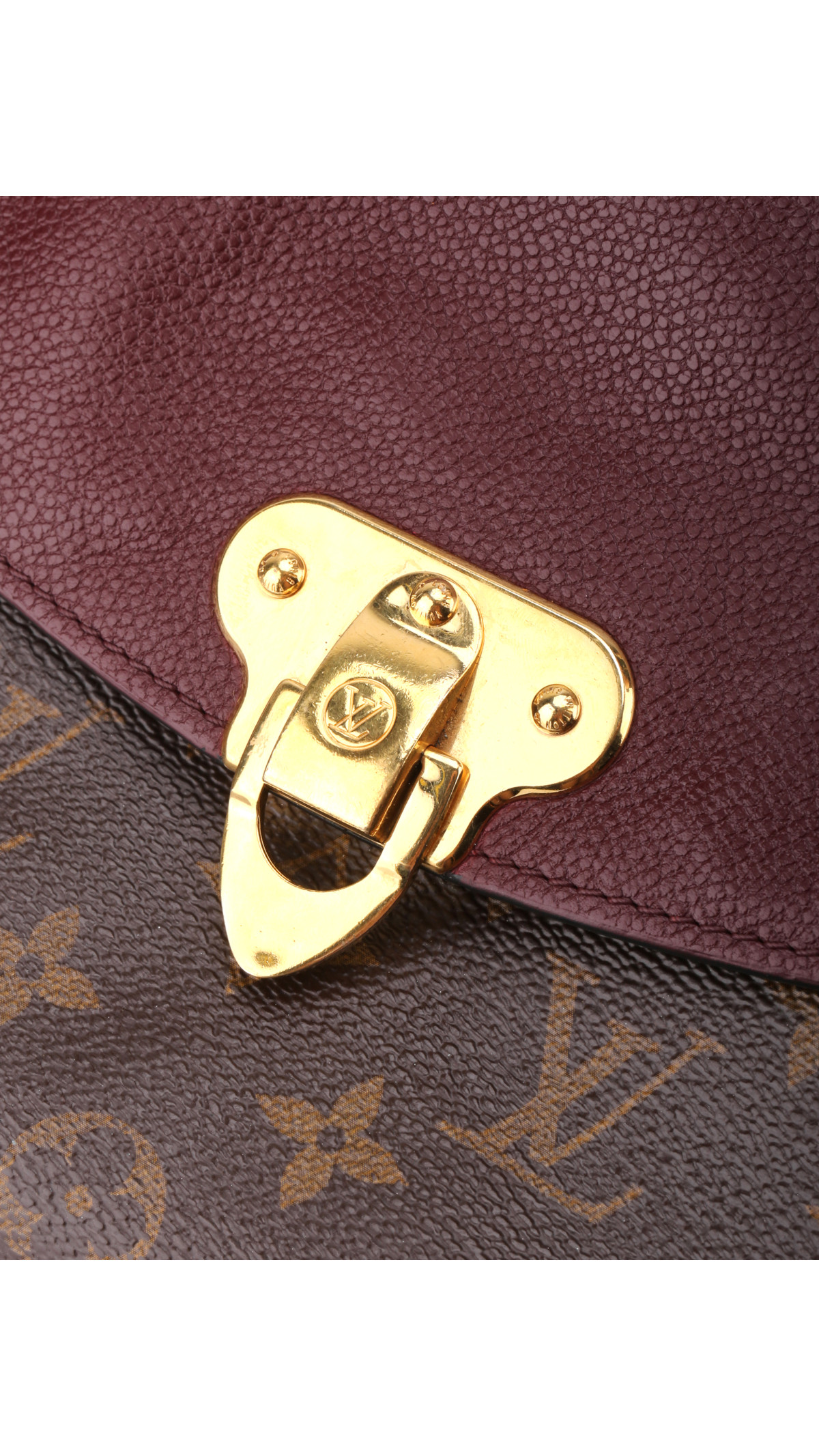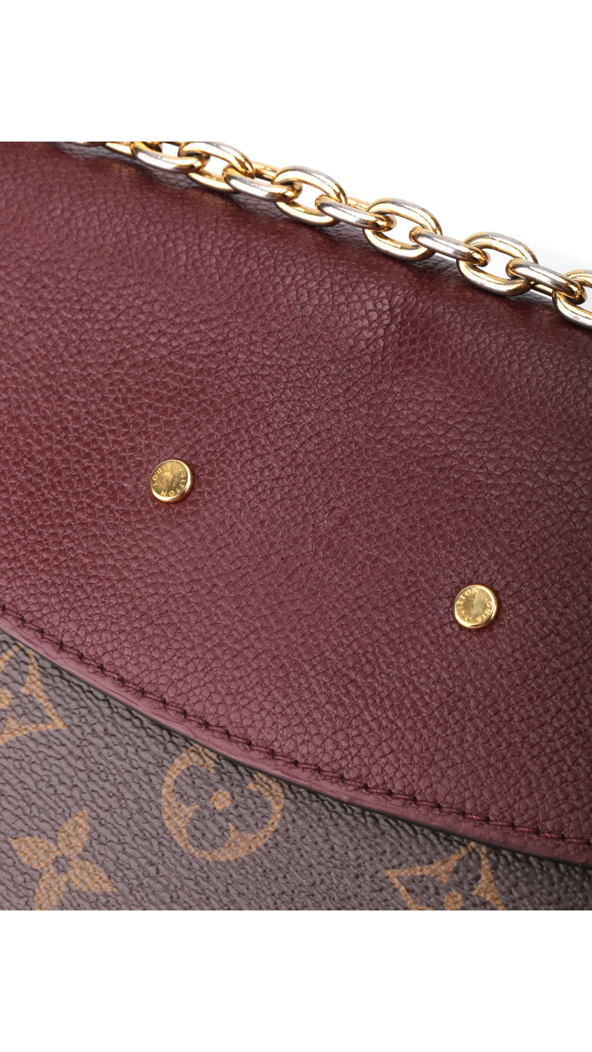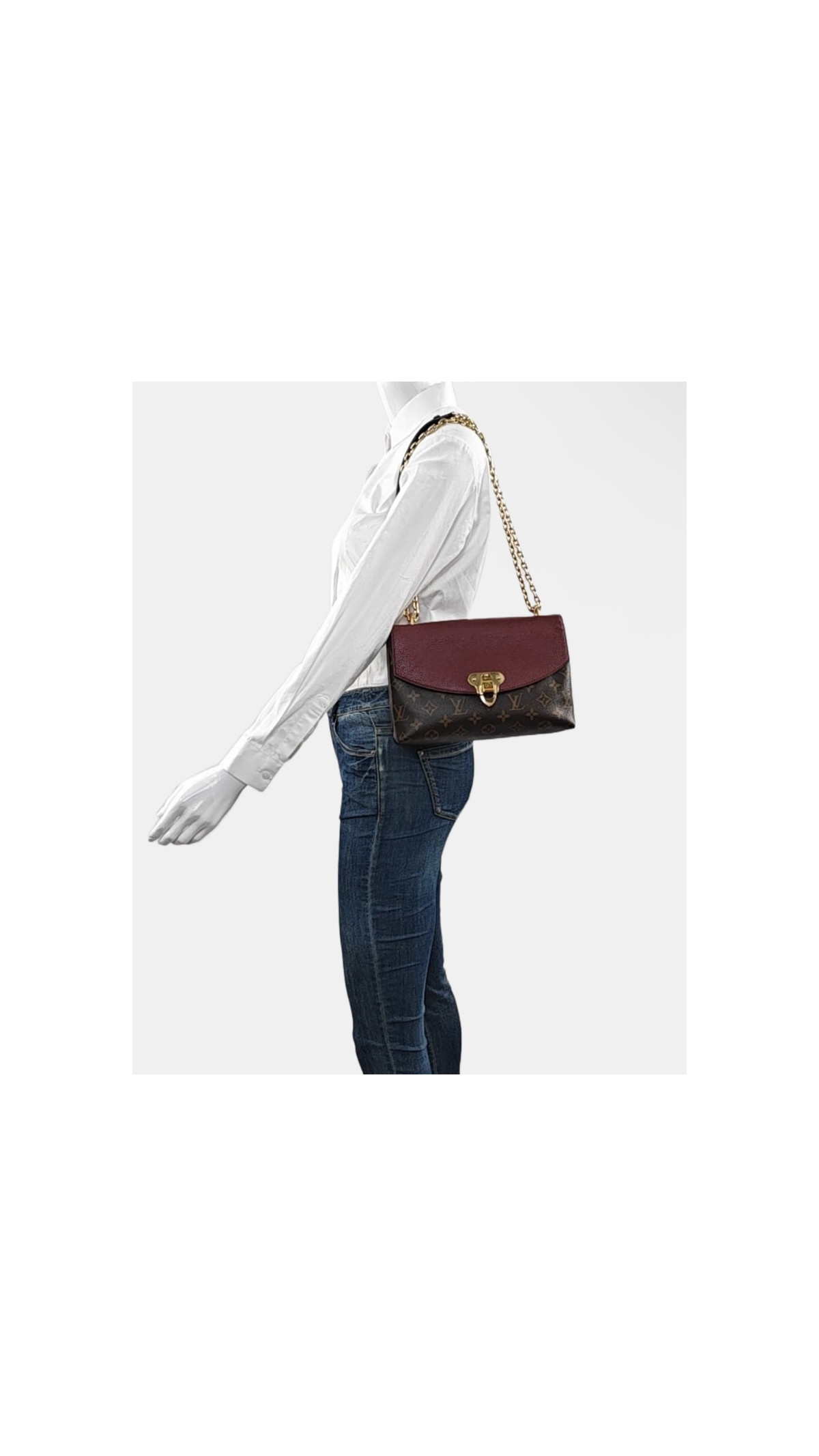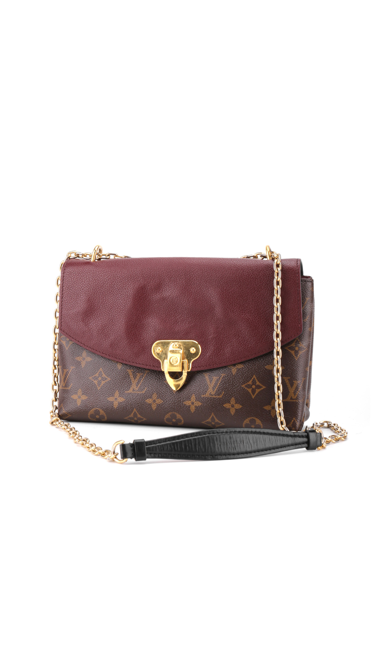 Louis Vuitton Saint Placide Chain Bag kombinerer den klassiske LV-estetikken med moderne eleganse. Vesken er laget i den ikoniske Monogram canvas, kombinert med glatt grained kalveskinn i en dyp burgunderrød nyanse som gir et luksuriøst uttrykk.