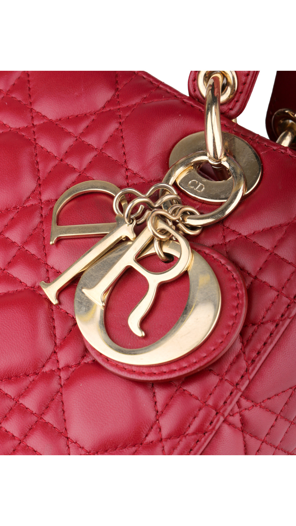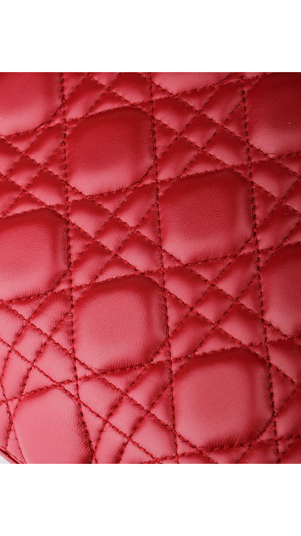 Christian Dior Lady Dior Medium i rødt lammeskinn er en tidløs og ikonisk veske kjent for sitt elegante "Cannage"-quiltede mønster. Vesken er utsmykket med gullfarget metallhardware og de klassiske Dior-bokstavanhengene som gir et luksuriøst preg.