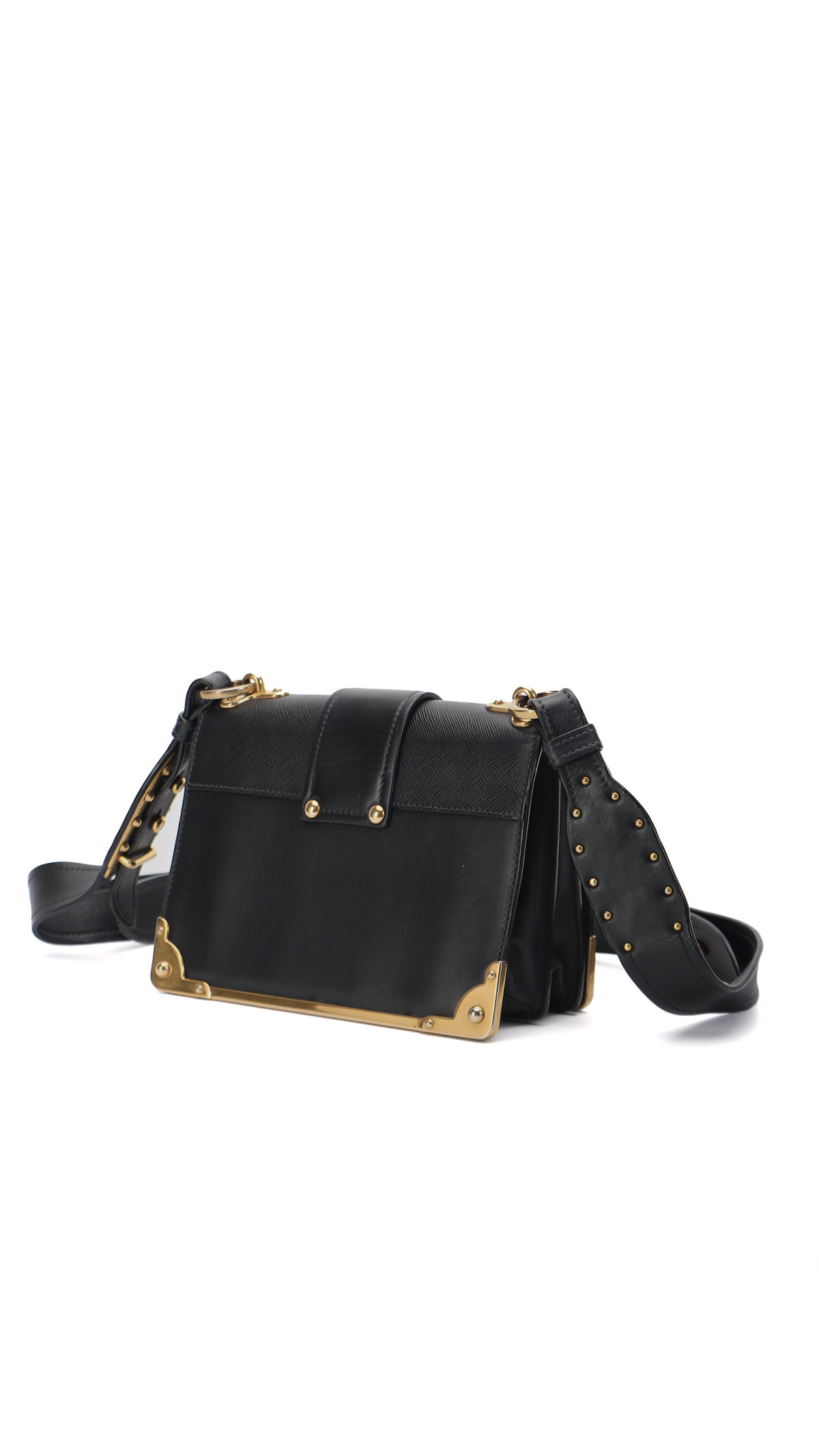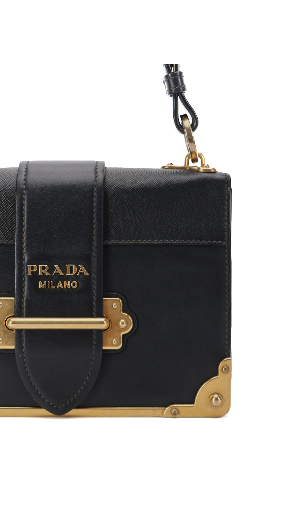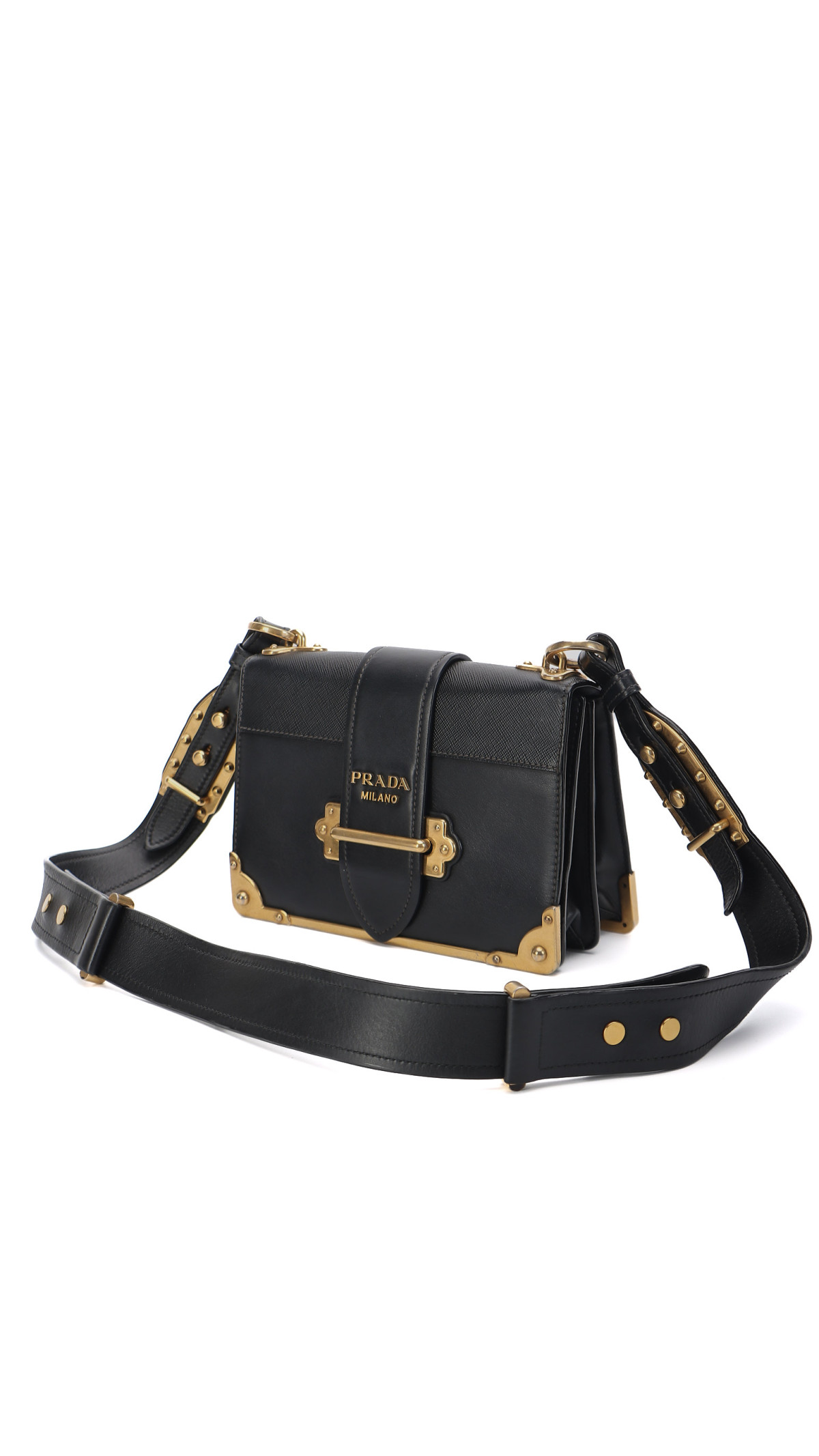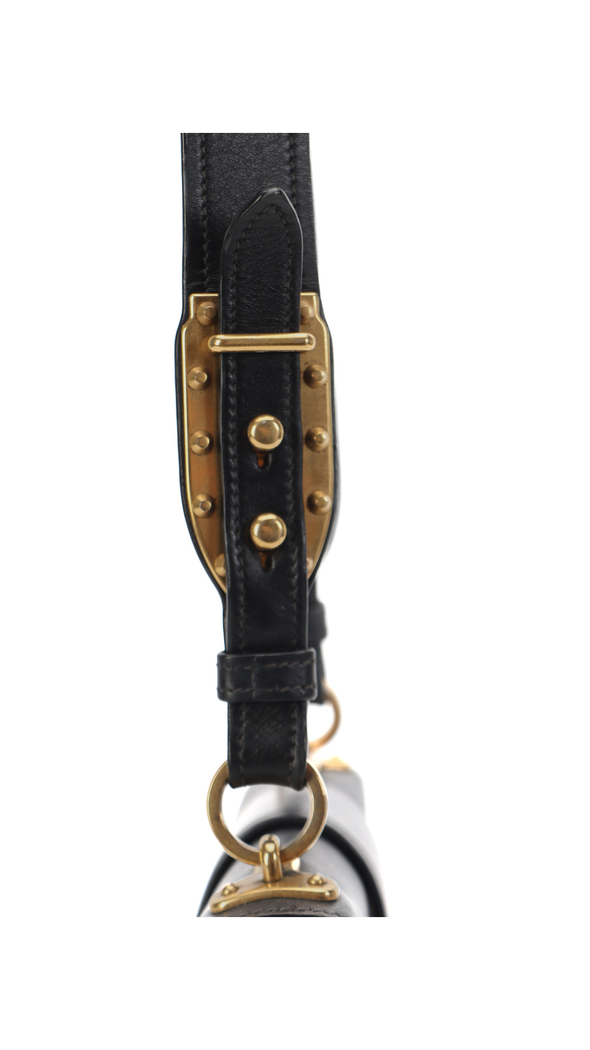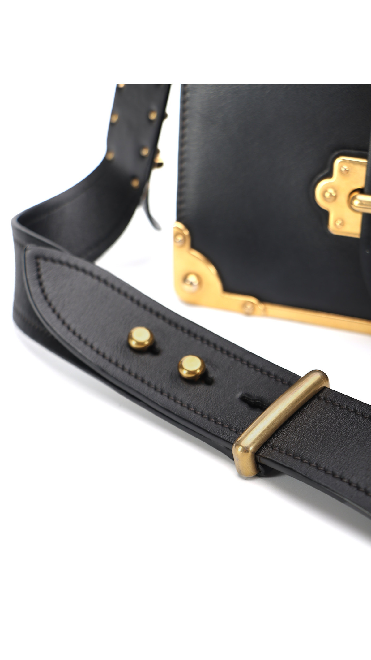 Prada Cahier er en ikonisk skulderveske inspirert av gamle notatbøker – gjenkjennelig på de dekorative metallbeslagene i front, hjørnebeskytterne og den markerte reimen over klaffen. Denne utgaven kommer i svart, glatt kalveskinn med antikk gullfarget hardware og «PRADA MILANO»-emblem på fronten.