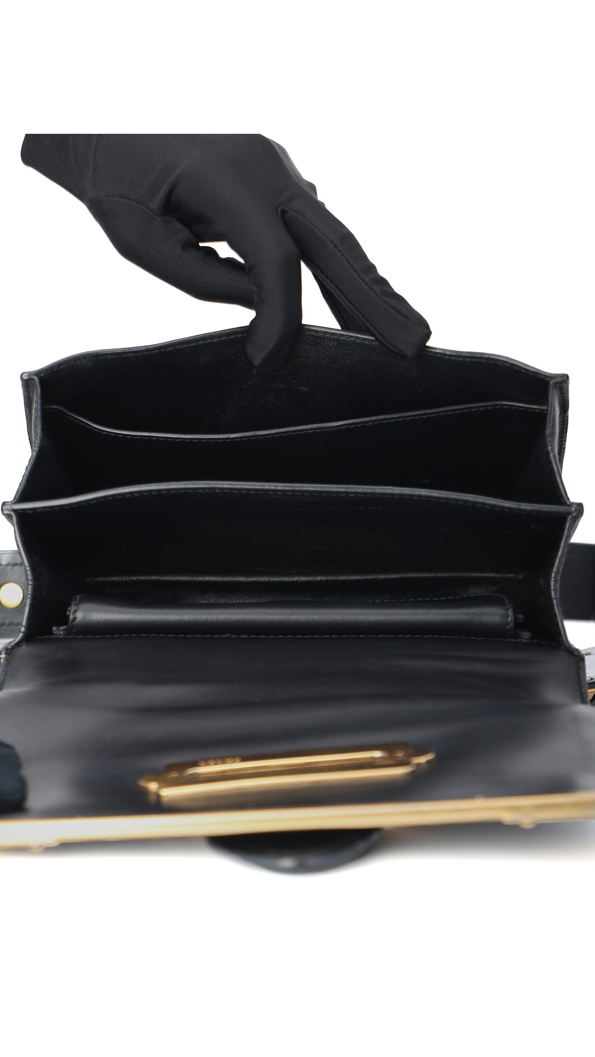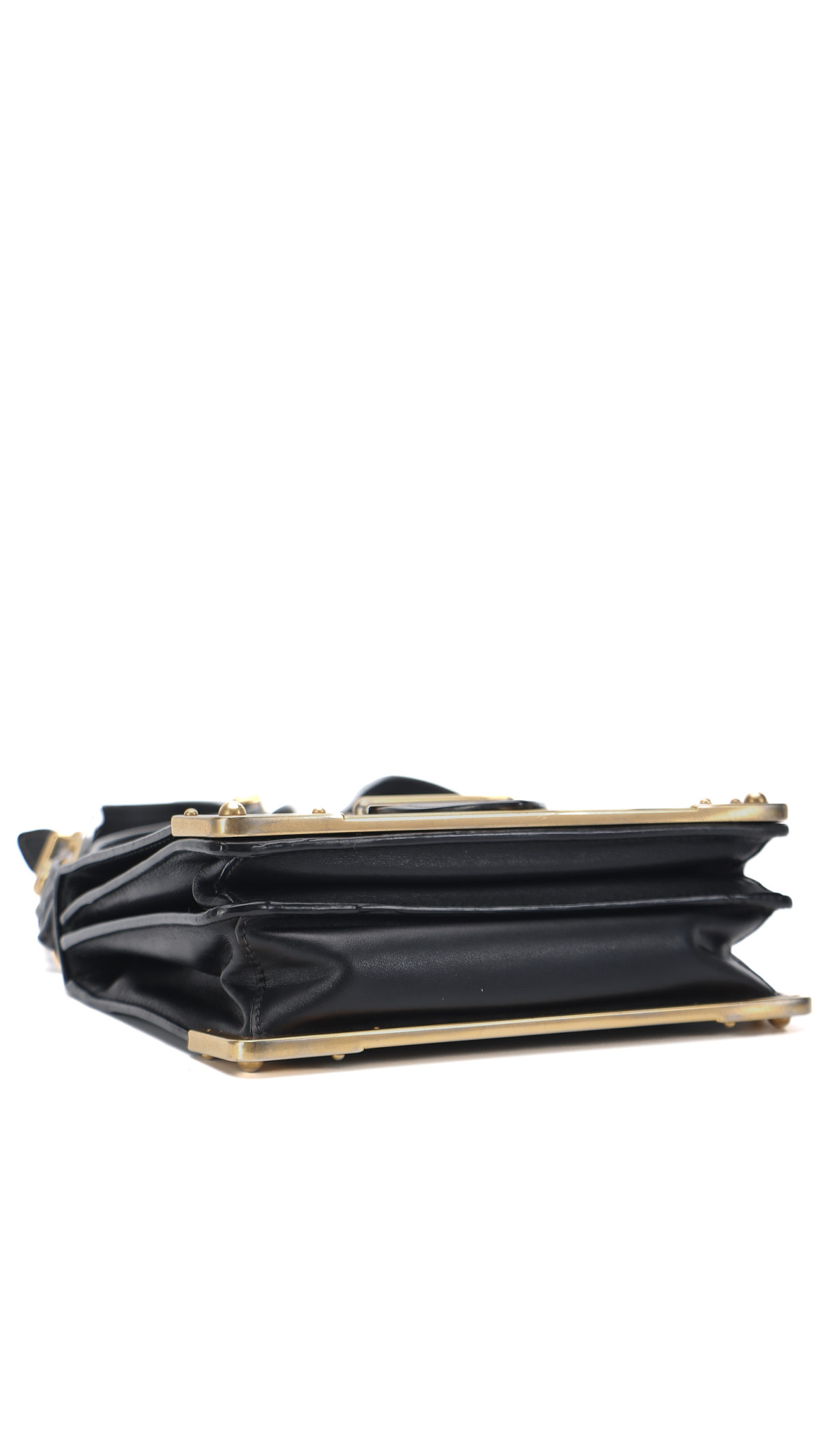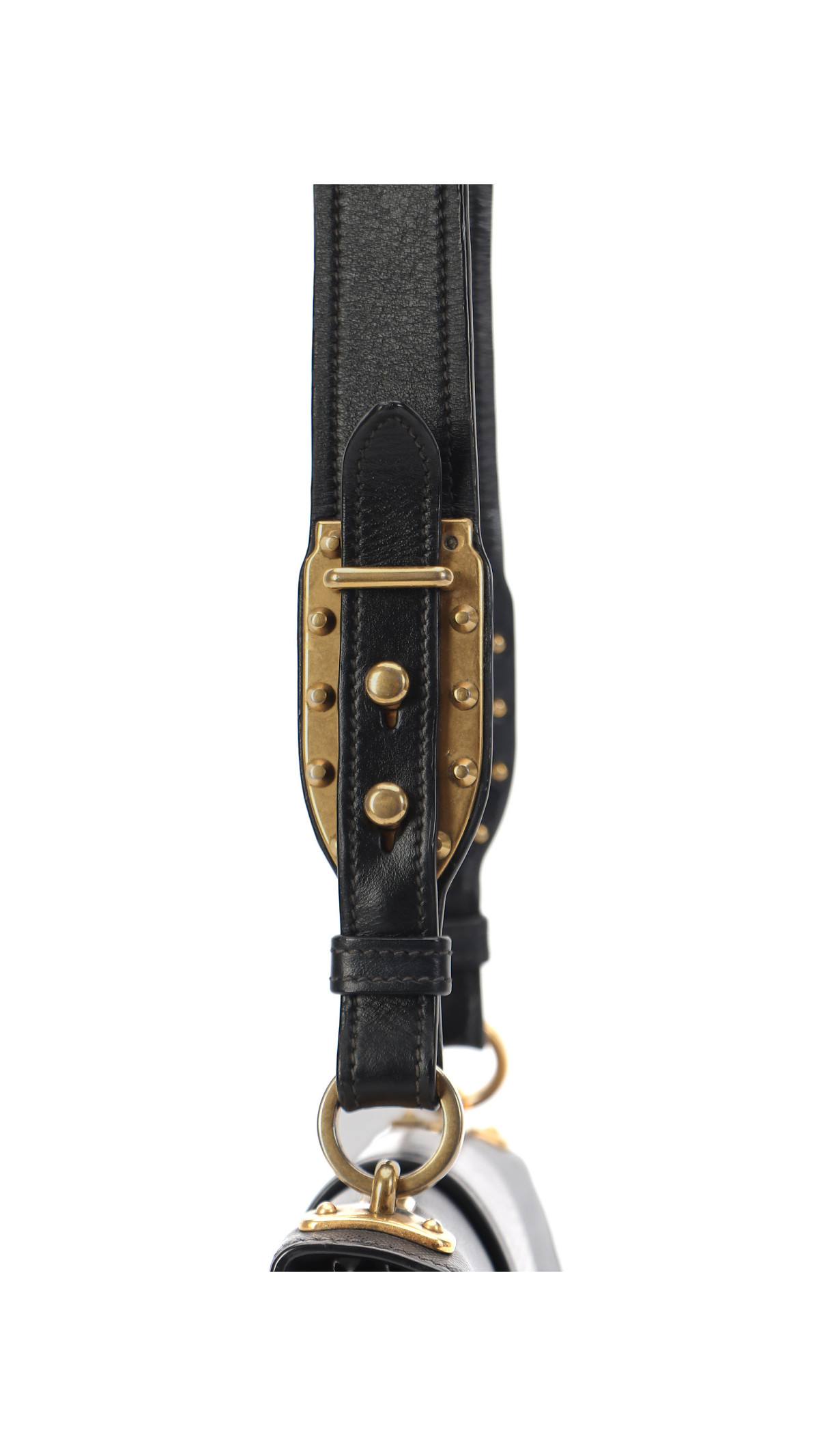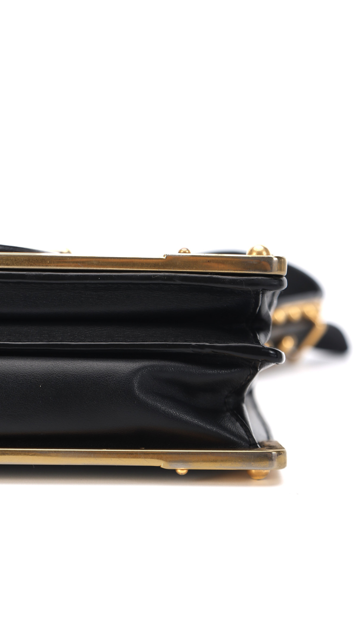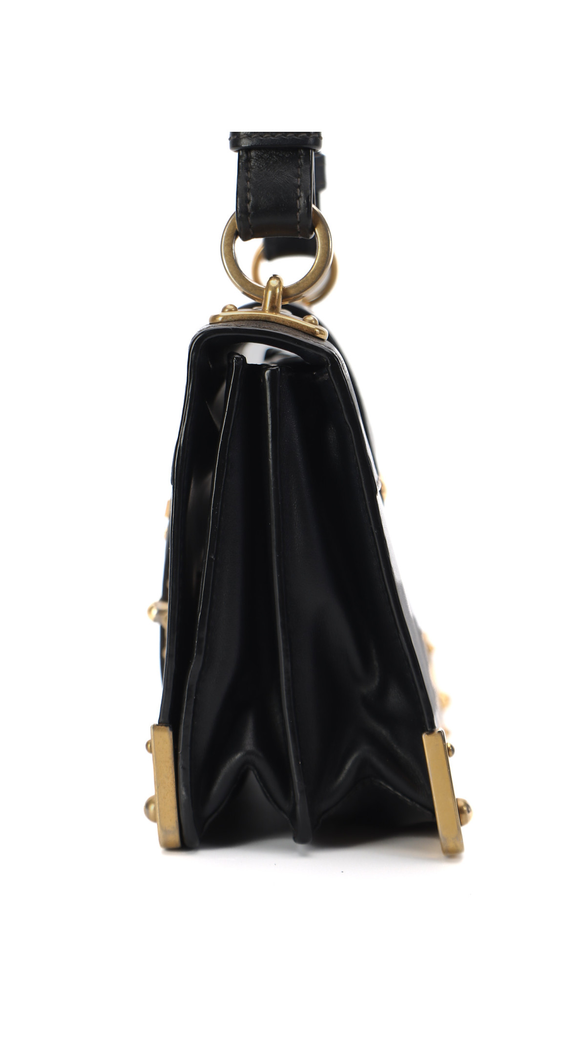 Prada Cahier er en ikonisk skulderveske inspirert av gamle notatbøker – gjenkjennelig på de dekorative metallbeslagene i front, hjørnebeskytterne og den markerte reimen over klaffen. Denne utgaven kommer i svart, glatt kalveskinn med antikk gullfarget hardware og «PRADA MILANO»-emblem på fronten.