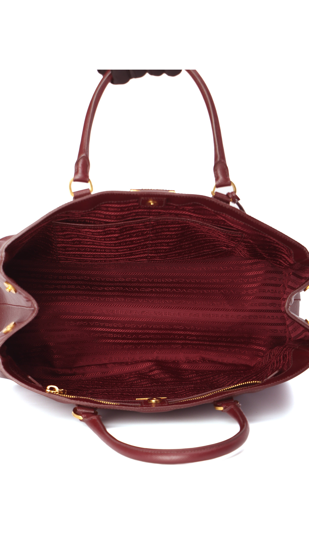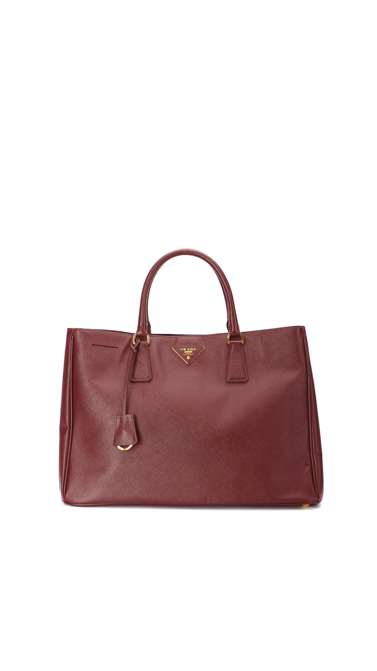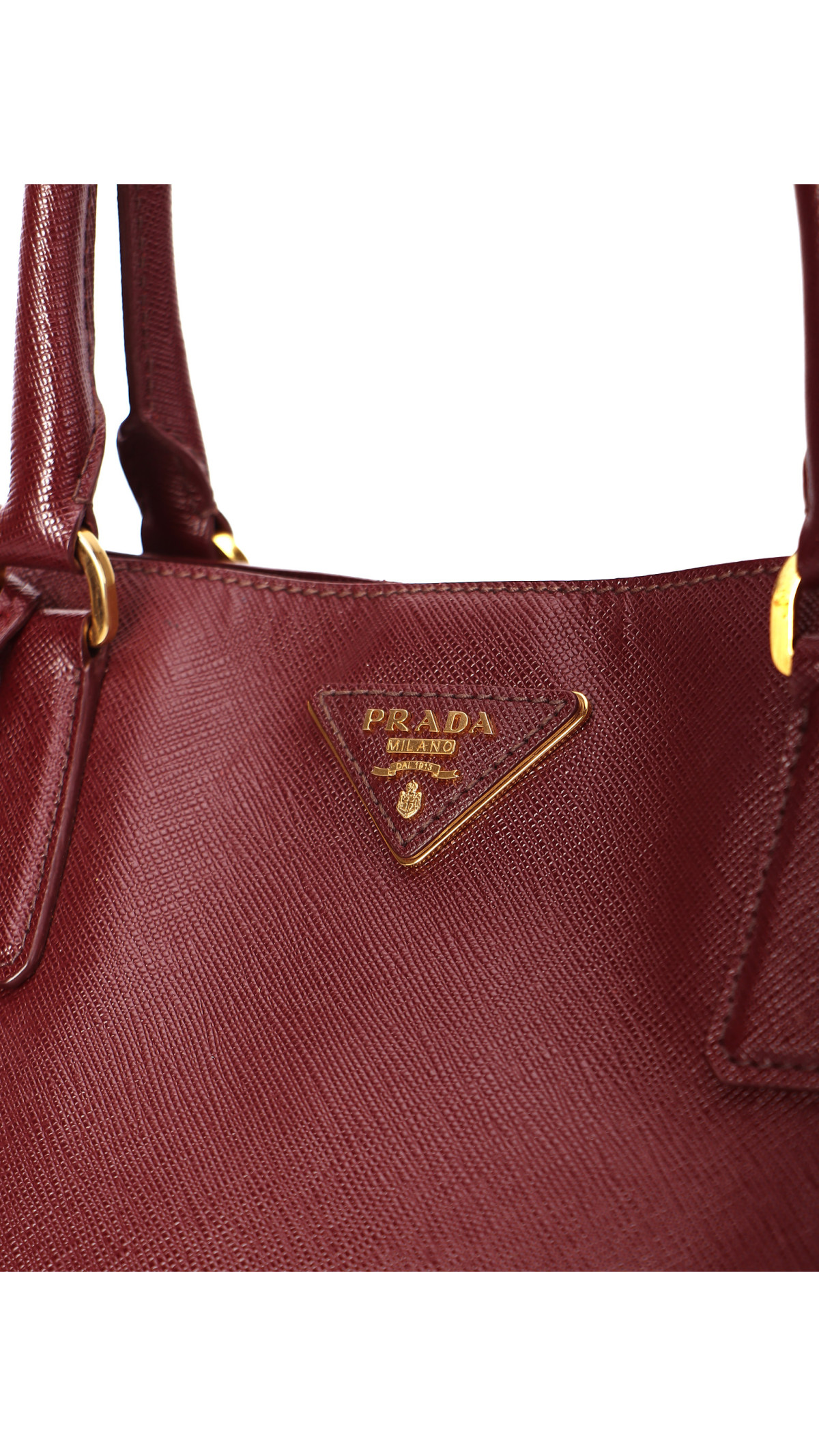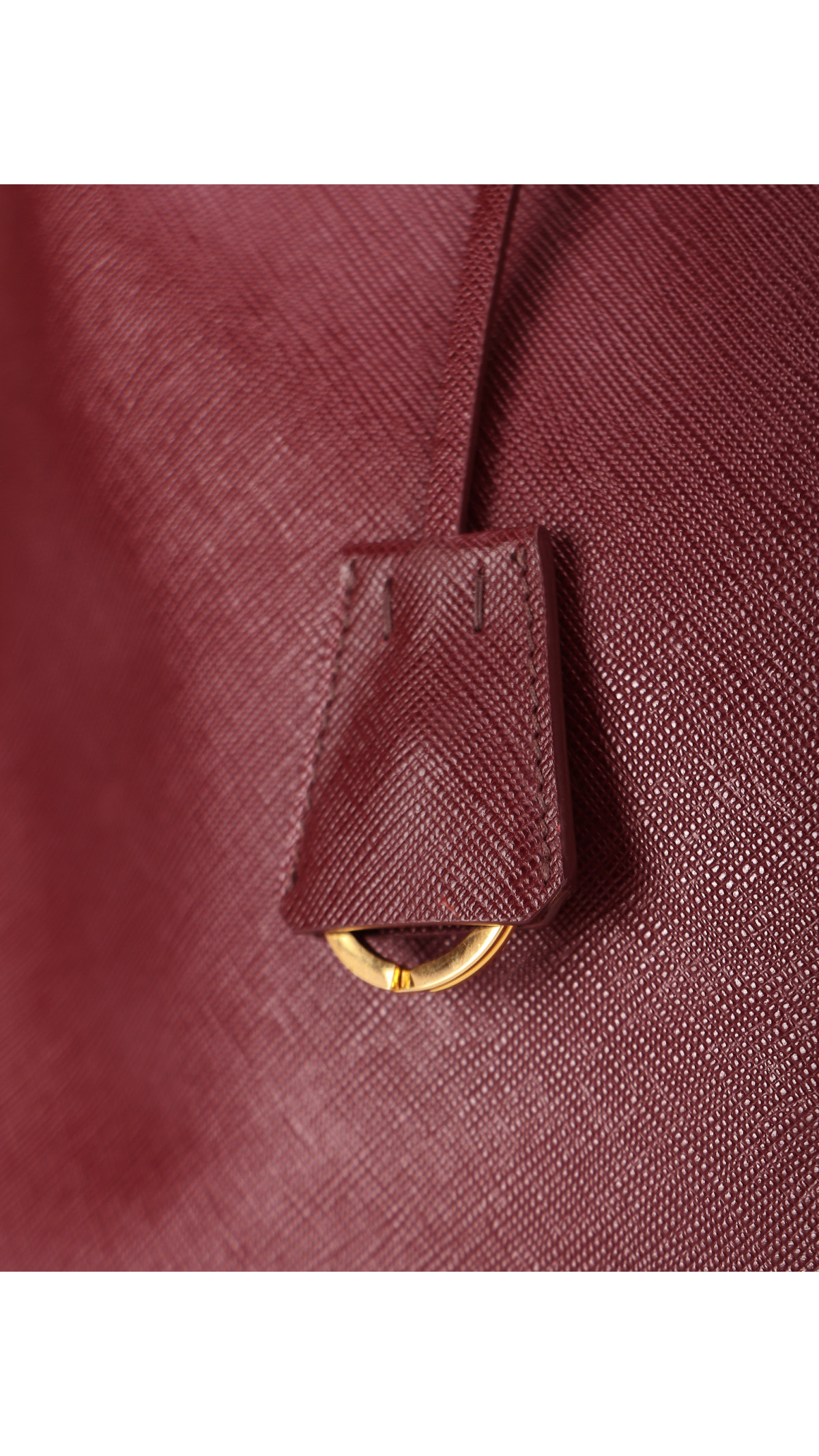 Prada Galleria er et ikonisk symbol på tidløs eleganse og italiensk håndverk. Denne klassiske modellen er laget i Pradas karakteristiske Saffiano-skinn – kjent for sin holdbarhet og eksklusive struktur – her i en vakker burgundfarge med gullfarget hardware.