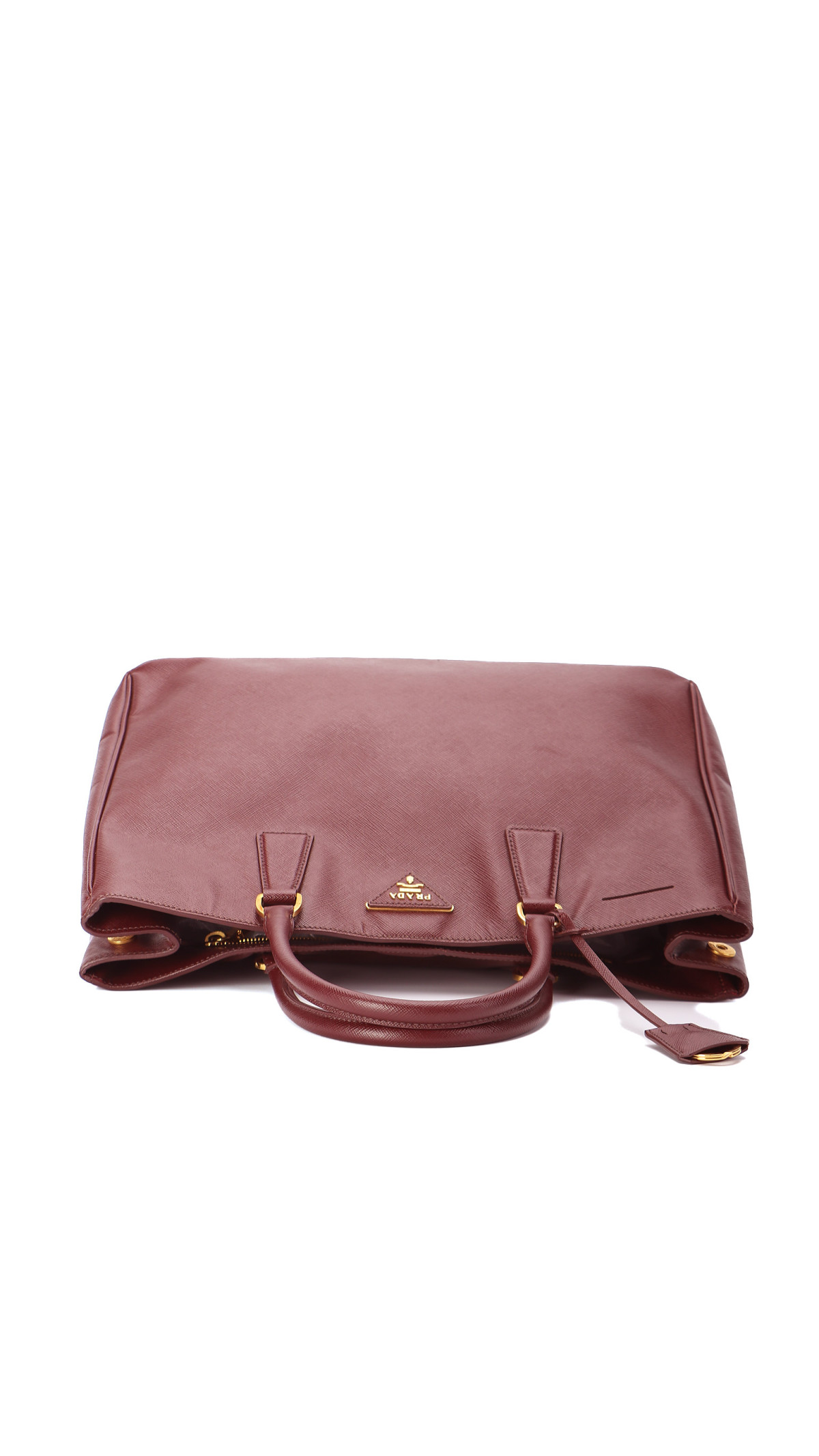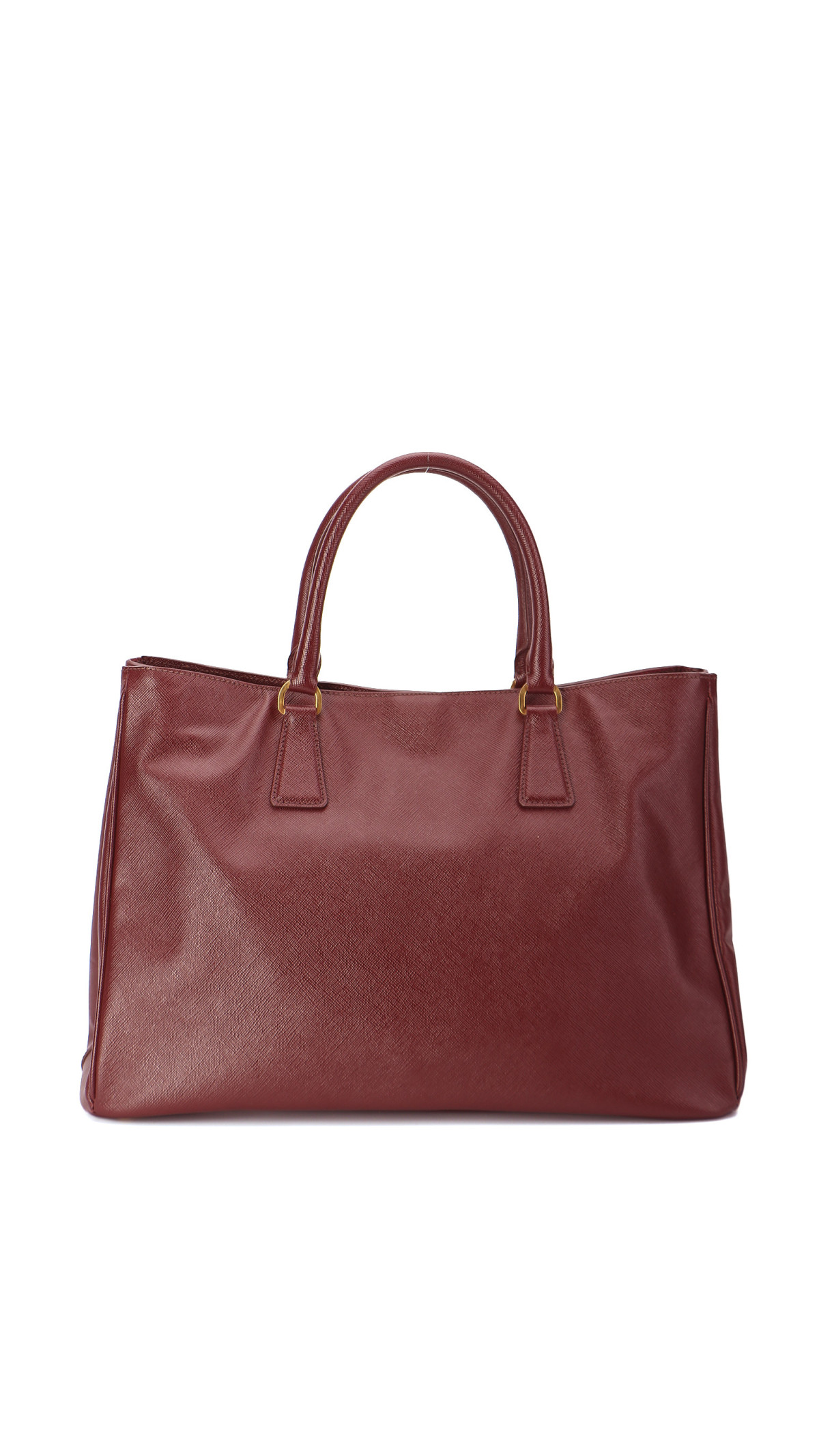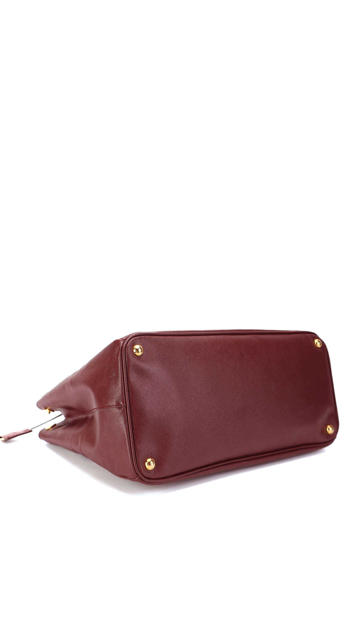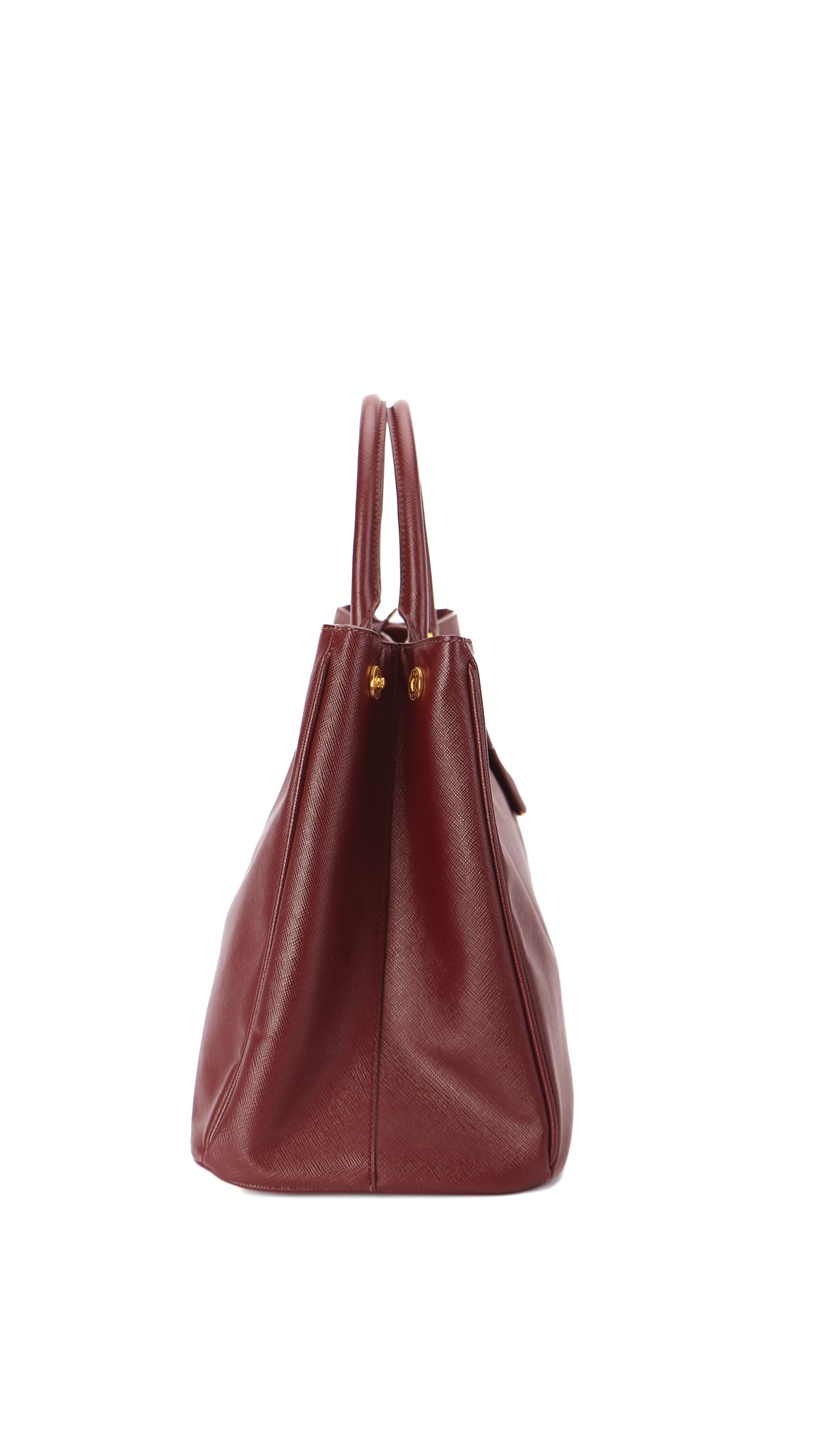 Prada Galleria er et ikonisk symbol på tidløs eleganse og italiensk håndverk. Denne klassiske modellen er laget i Pradas karakteristiske Saffiano-skinn – kjent for sin holdbarhet og eksklusive struktur – her i en vakker burgundfarge med gullfarget hardware.