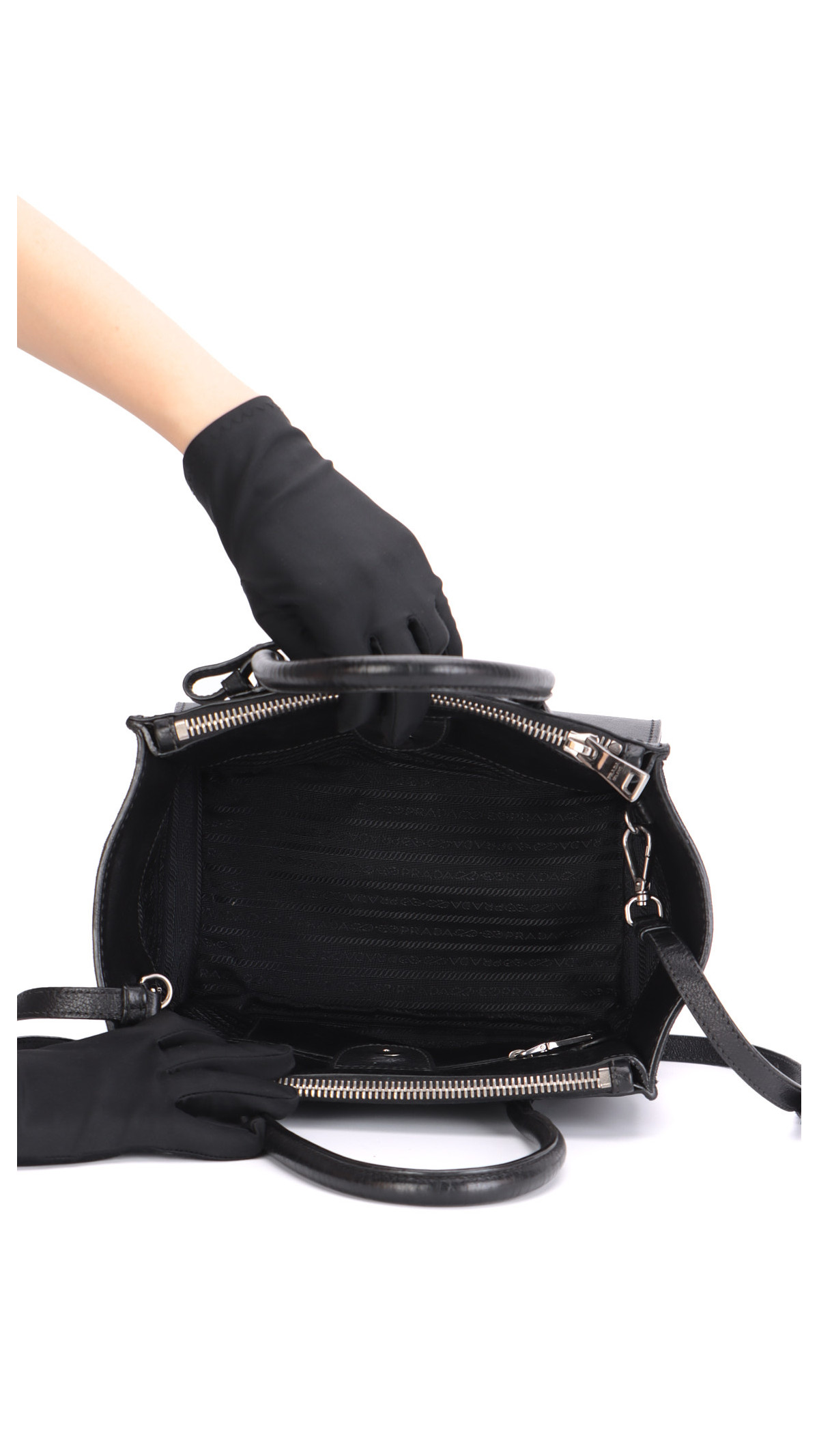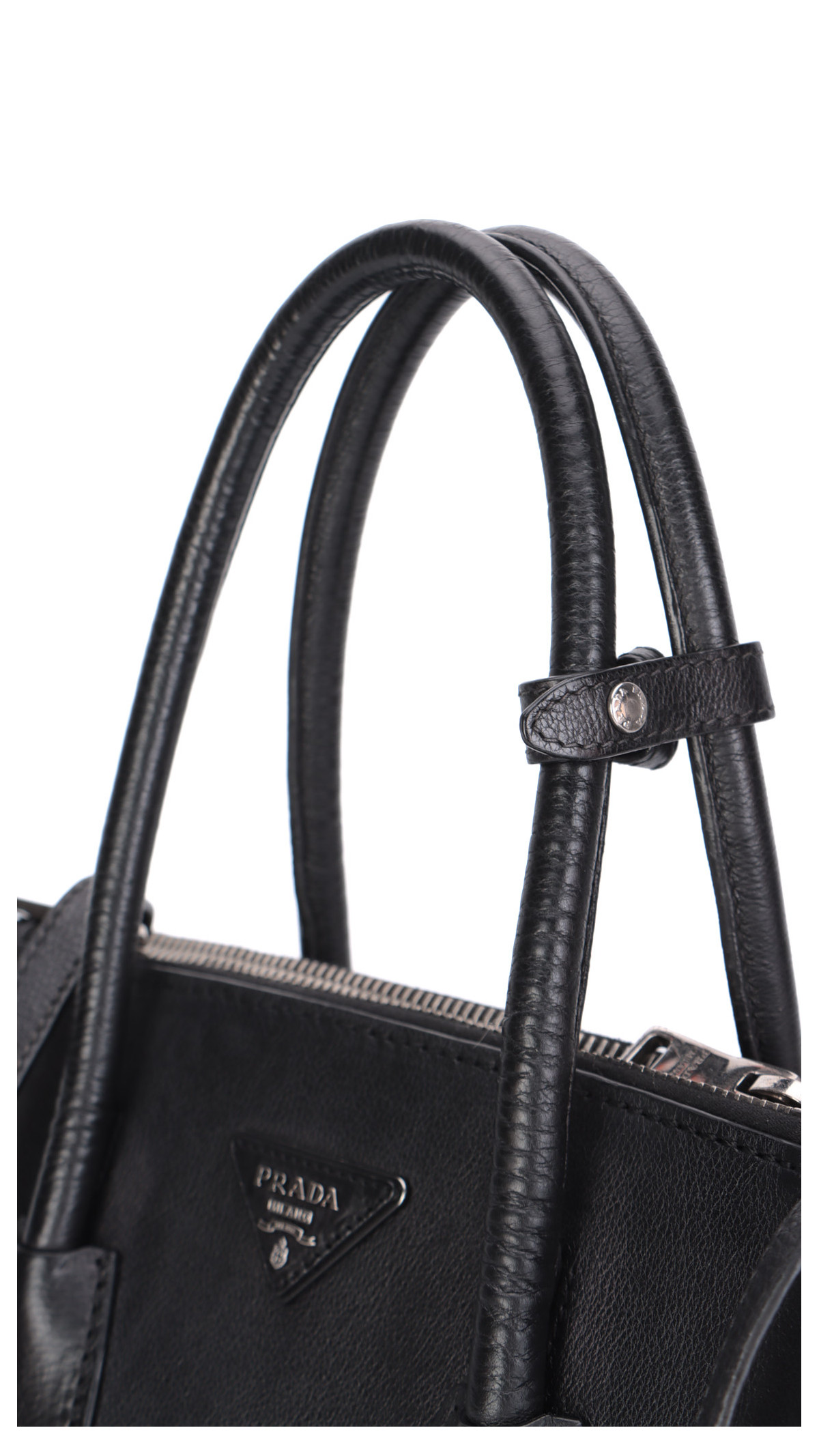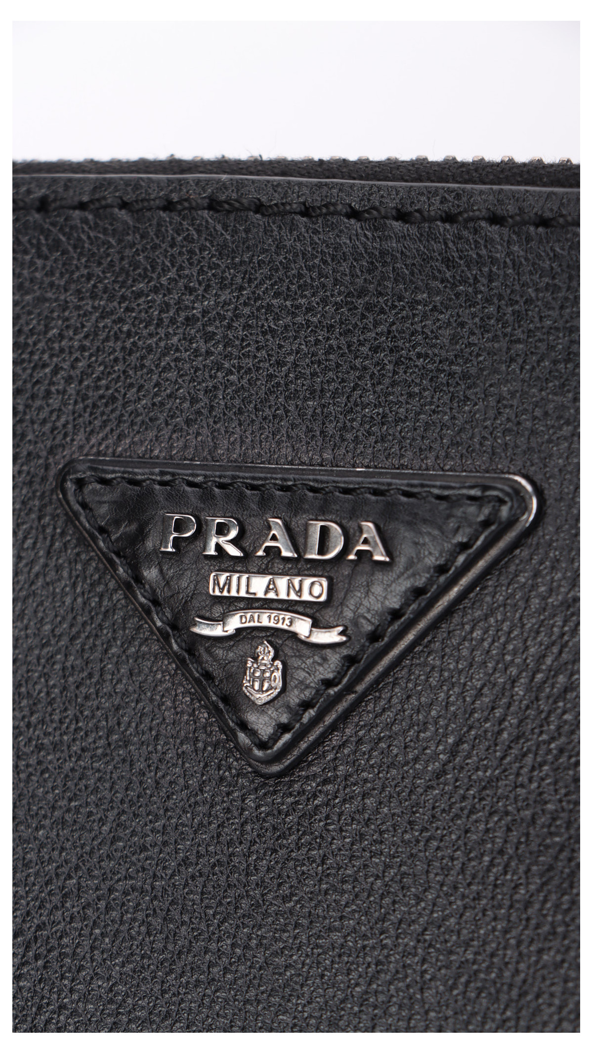 Prada Glace Calf Twin Pocket Tote er en elegant og funksjonell hverdagsveske med luksuriøse detaljer og tidløst design. Vesken er laget i glatt svart glace-kalveskinn, kjent for sin slitestyrke og subtile glans, og prydet med Pradas ikoniske metallogo foran.