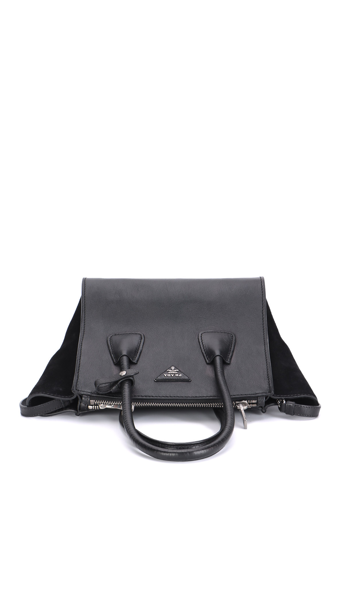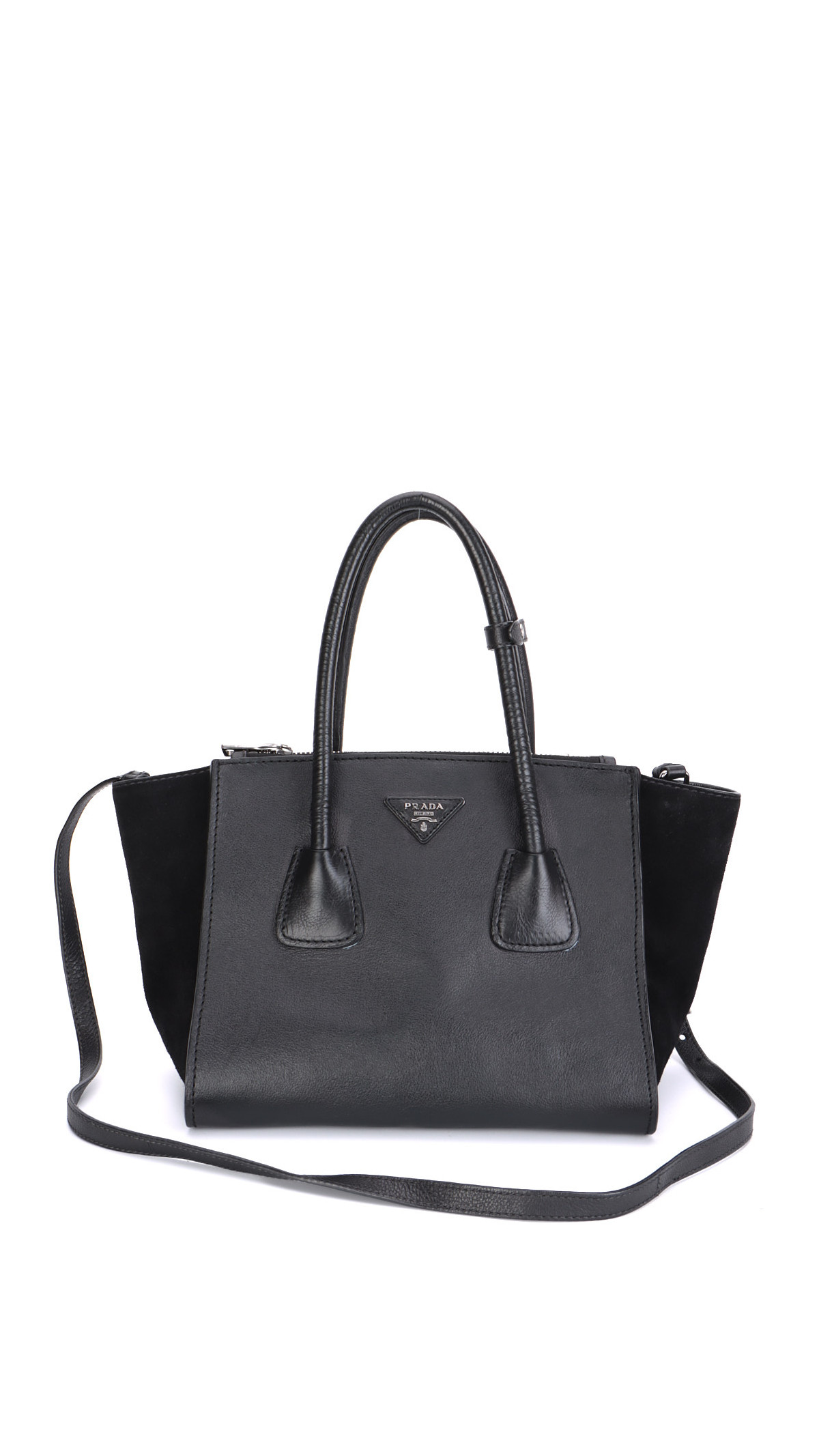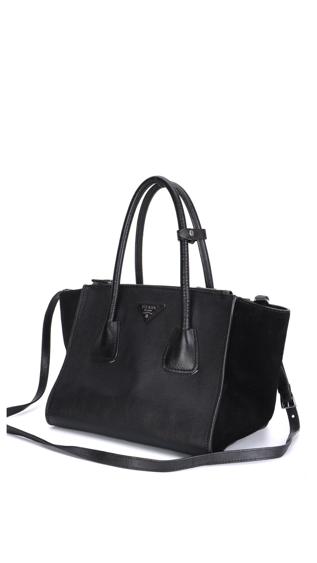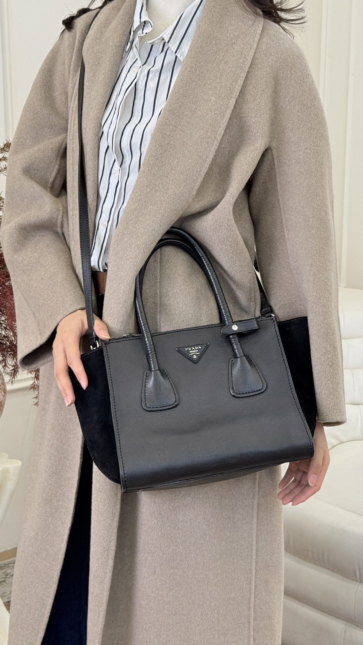 Prada Glace Calf Twin Pocket Tote er en elegant og funksjonell hverdagsveske med luksuriøse detaljer og tidløst design. Vesken er laget i glatt svart glace-kalveskinn, kjent for sin slitestyrke og subtile glans, og prydet med Pradas ikoniske metallogo foran.